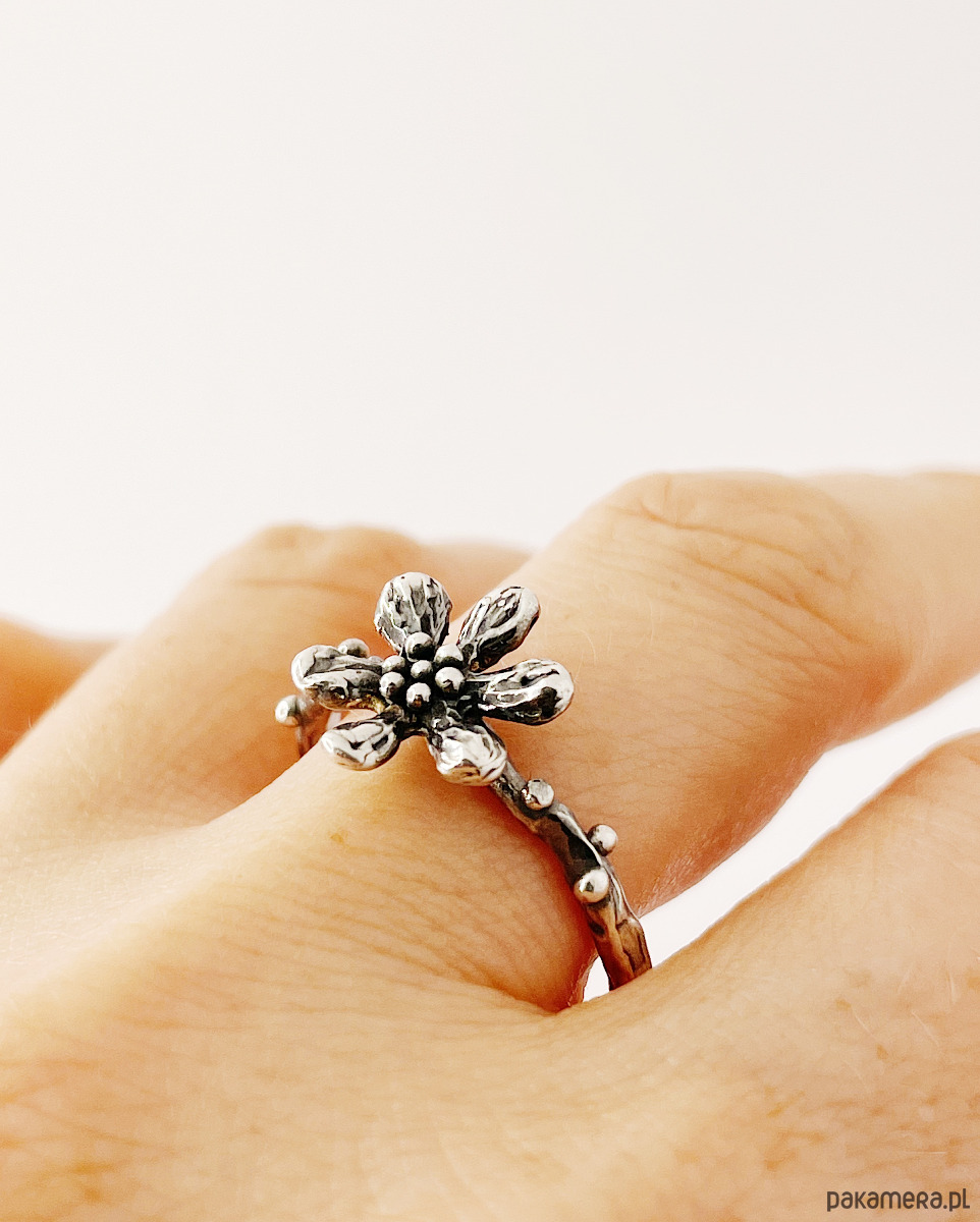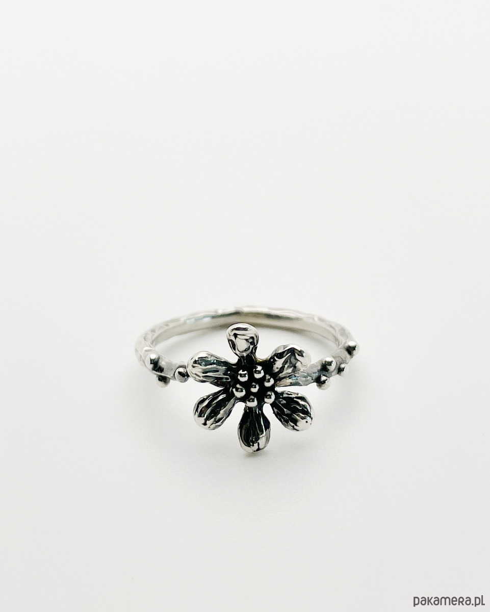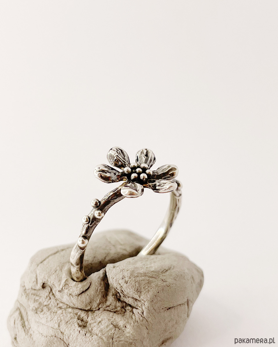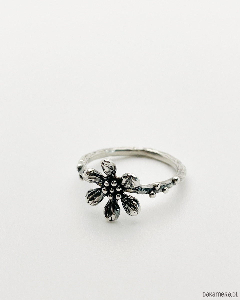 Flori to delikatny pierścionek inspirowany subtelną urodą kwiatów dzikiej łąki. Obrączka jest ozdobiona miękką fakturą i srebrnymi kuleczkami.