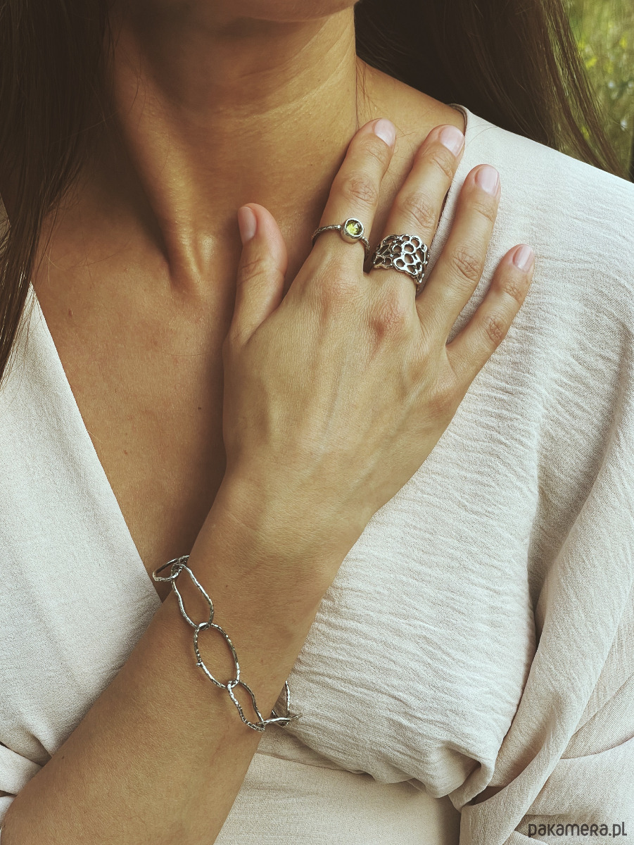 Duży pierścionek wyróżniający się lekką, ażurową formą. Komorebi to gra światła i cienia, organiczne lekkie sploty. Srebro oksydowane i przecierane o nieco surowym charakterze.
