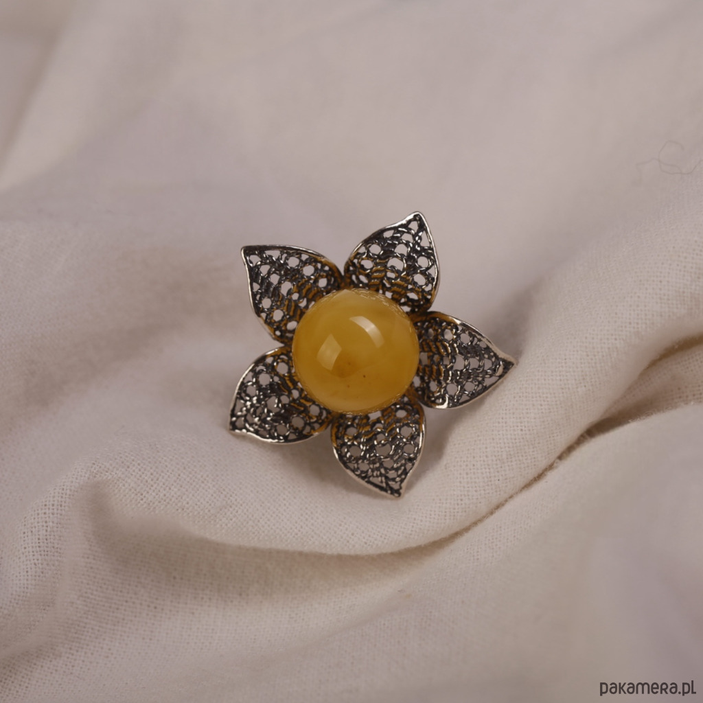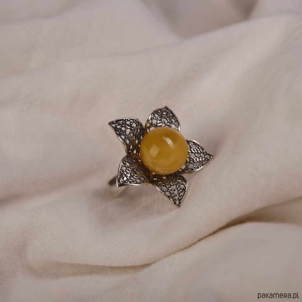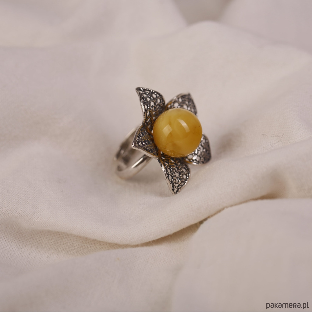 Pierścionek srebrny kwiat z bursztynową kulką