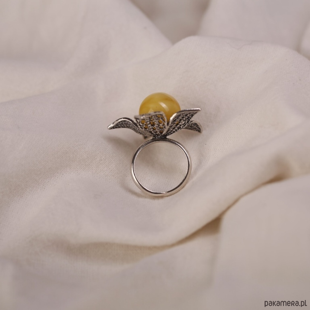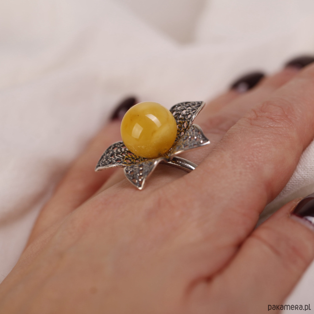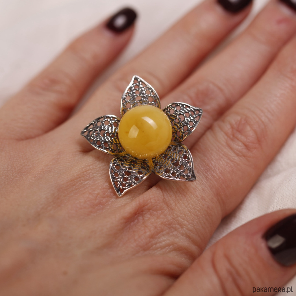 Pierścionek srebrny kwiat z bursztynową kulką