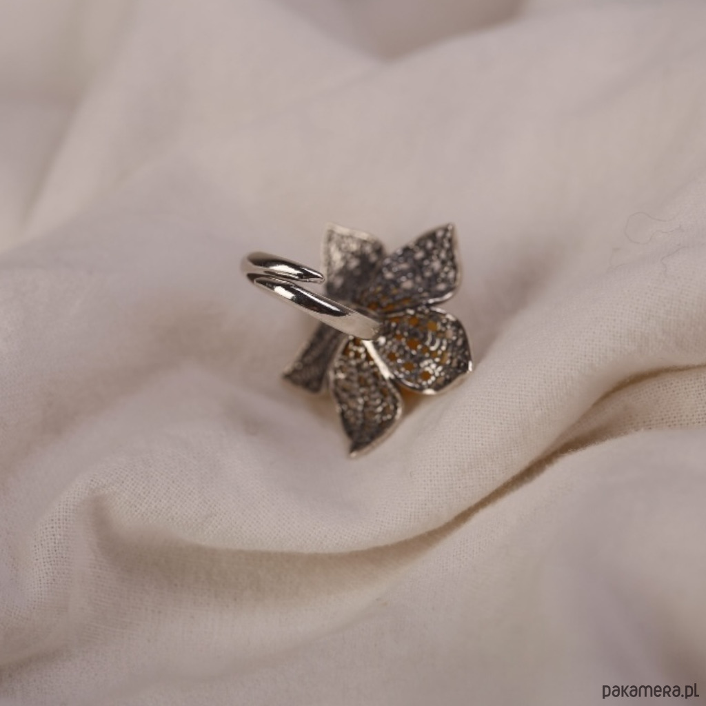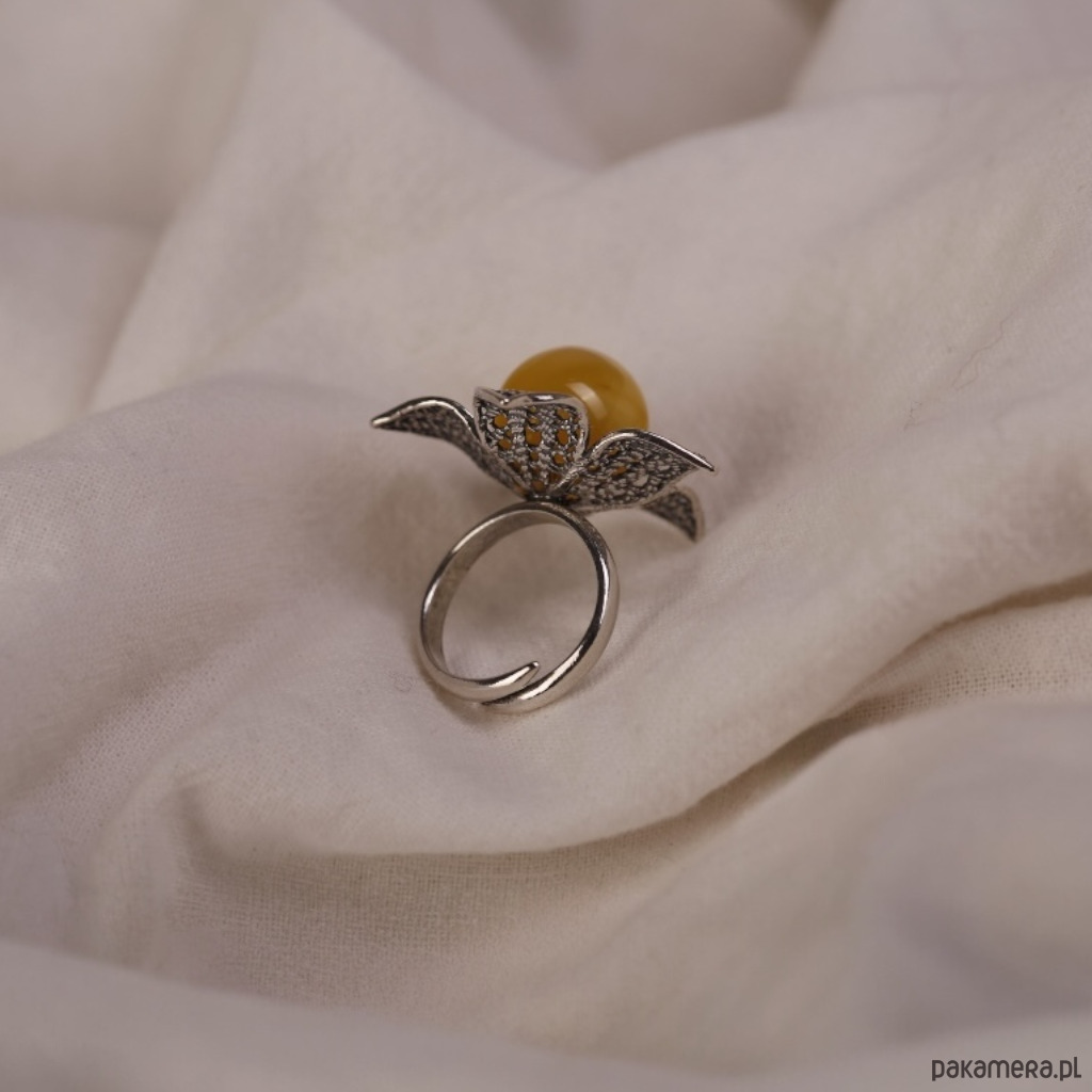Srebrny pierścionek w kształcie kwiatka z bursztynową kulką w ciepłym, mlecznym odcieniu w samym centrum. Ażurowe płatki delikatnie otulają bursztyn, dzięki czemu pierścionek wygląda lekko, mimo że wyraźnie zaznacza się na dłoni. Regulowana obrączka pozwala wygodnie dopasować go do palca i nosić tak, jak masz akurat ochotę. Idealny pomysł na prezent!