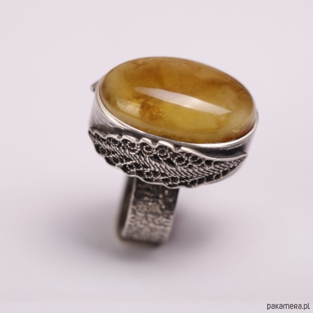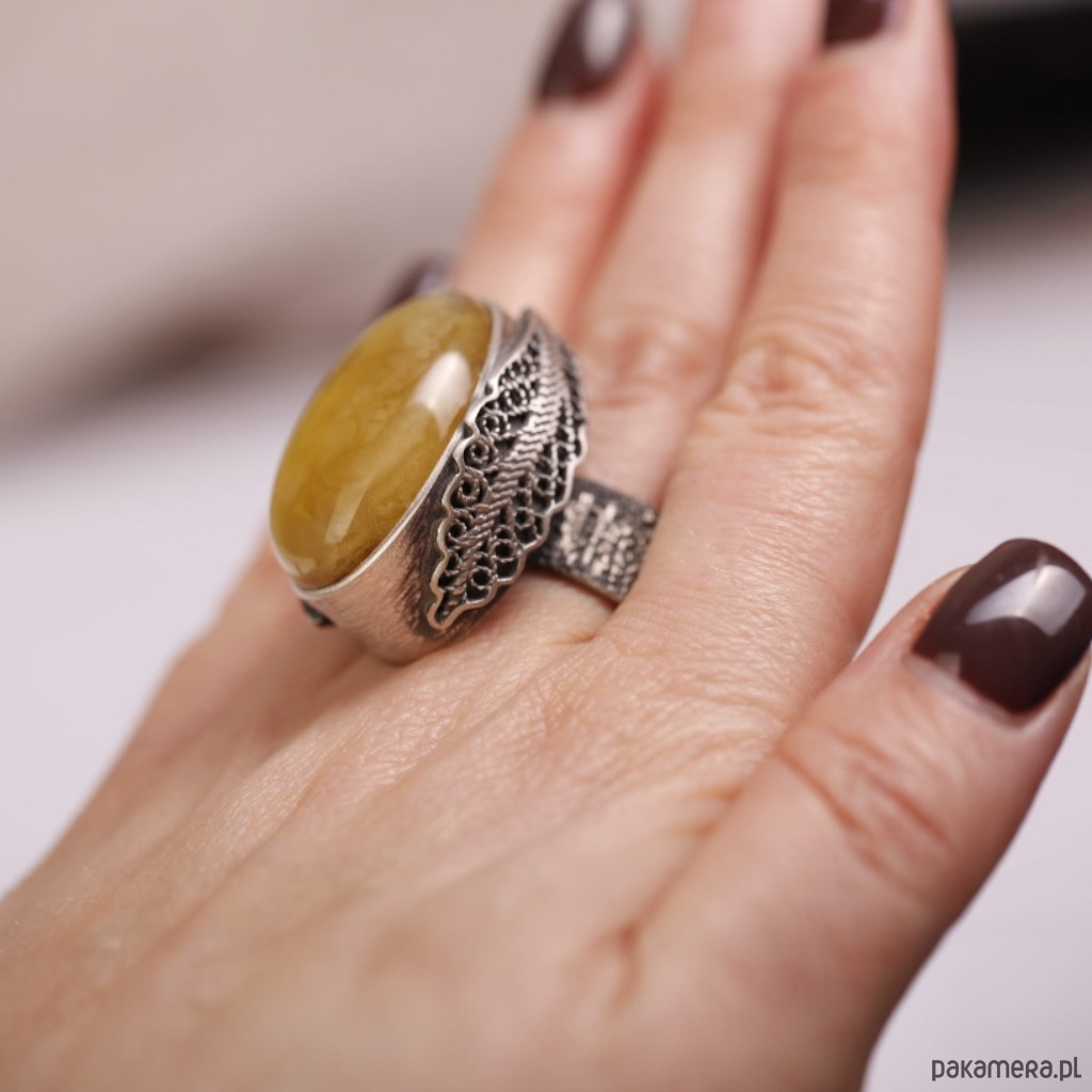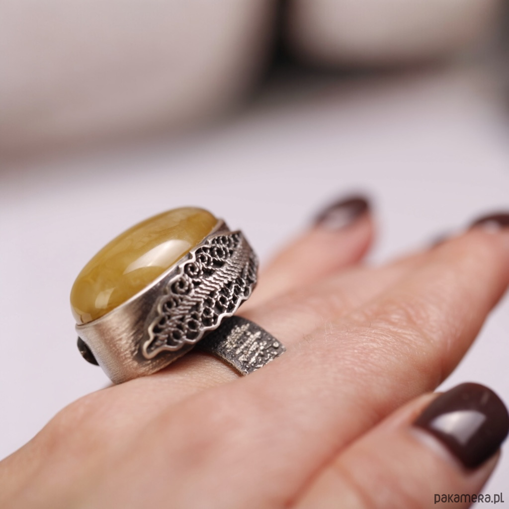 Miodowy bursztyn Bałtycki o owalnym kształcie przyciąga wzrok miękkim blaskiem, a oksydowane srebro nadaje całości wyrazisty, artystyczny charakter. Czuć w dłoni solidność i jakość ręcznego wykonania, a szeroka, regulowana obrączka gwarantuje wygodę i idealne dopasowanie na co dzień. To pierścionek, który dodaje stylizacji pewności i ciepła.