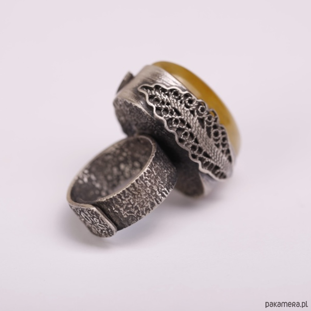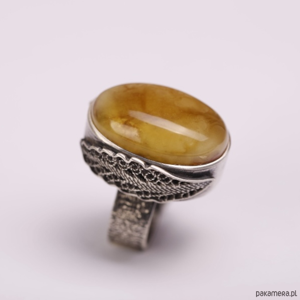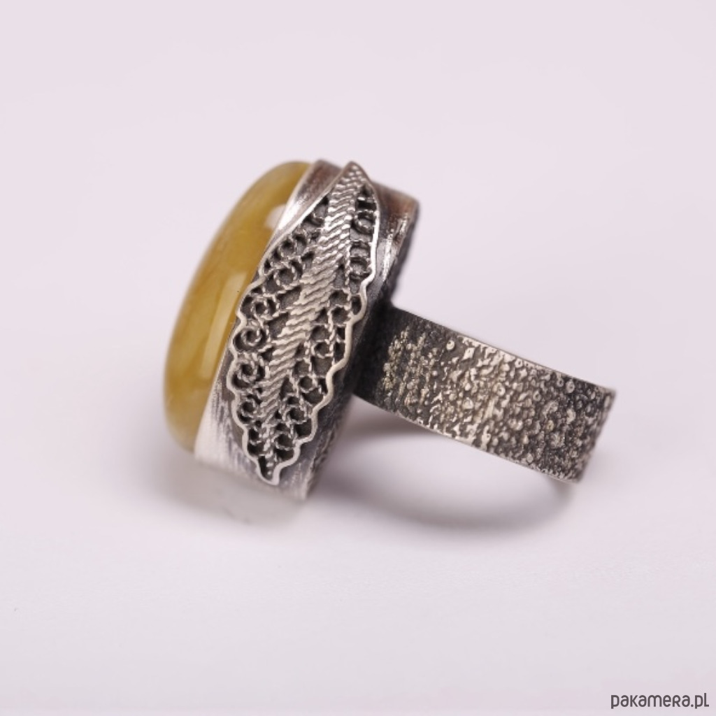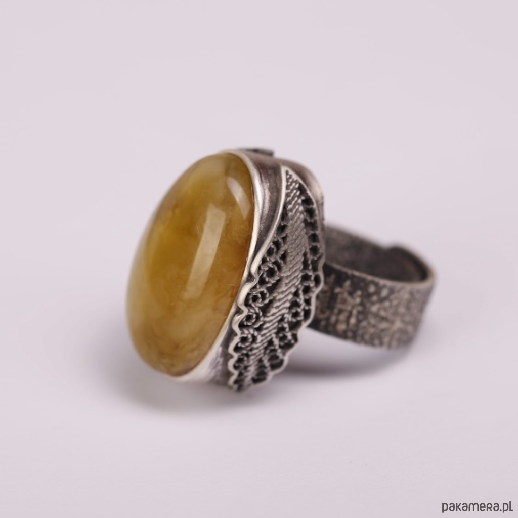 Miodowy bursztyn Bałtycki o owalnym kształcie przyciąga wzrok miękkim blaskiem, a oksydowane srebro nadaje całości wyrazisty, artystyczny charakter. Czuć w dłoni solidność i jakość ręcznego wykonania, a szeroka, regulowana obrączka gwarantuje wygodę i idealne dopasowanie na co dzień. To pierścionek, który dodaje stylizacji pewności i ciepła.