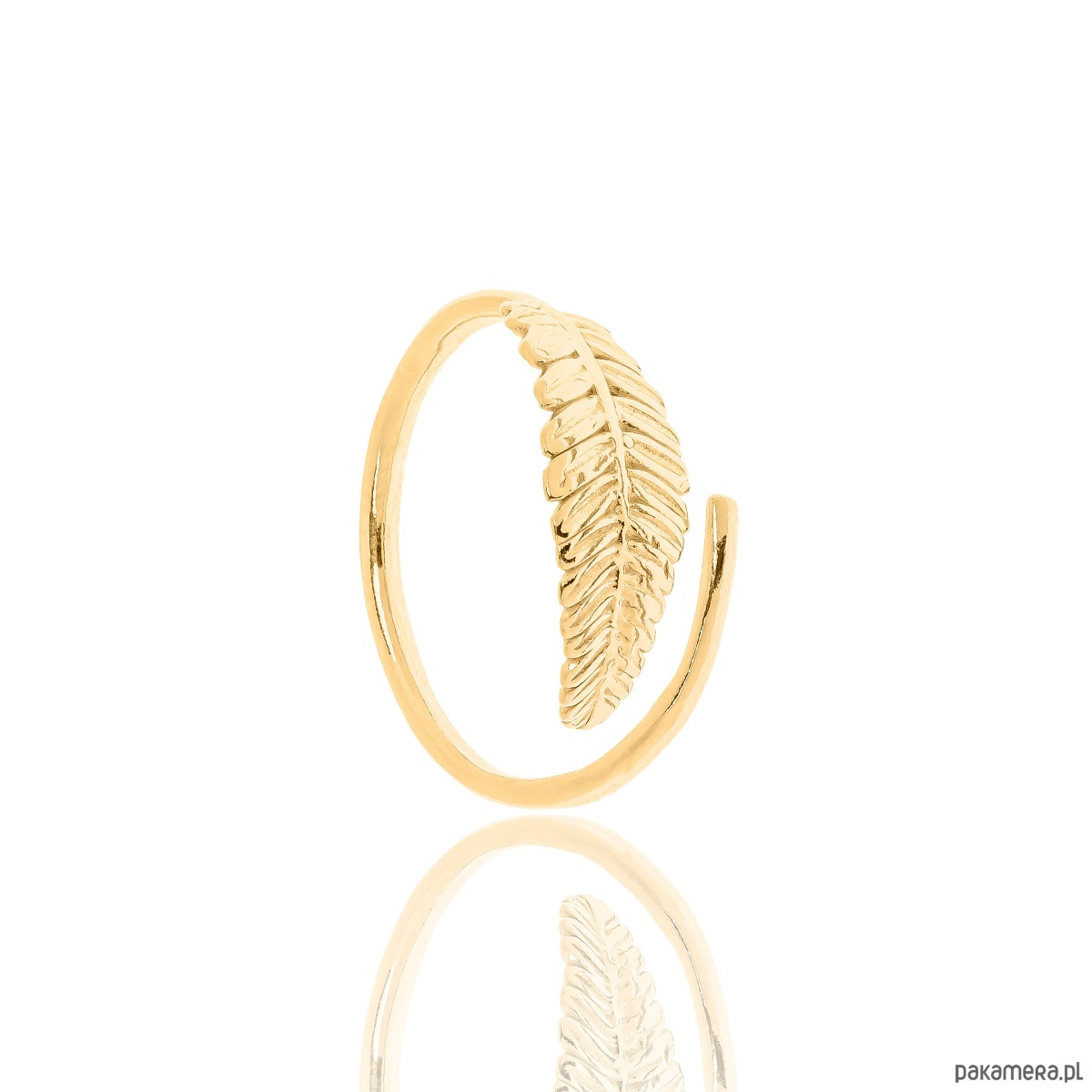 Pierścionek srebrny pozłacany z liściem. Rozmiar uniwersalny, dostosowuje się do rozmiaru palca. Całość wykonana ze srebra 925 pokrytego 24 karatowym żółtym złotem.