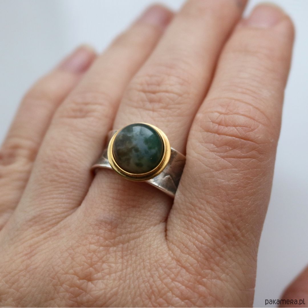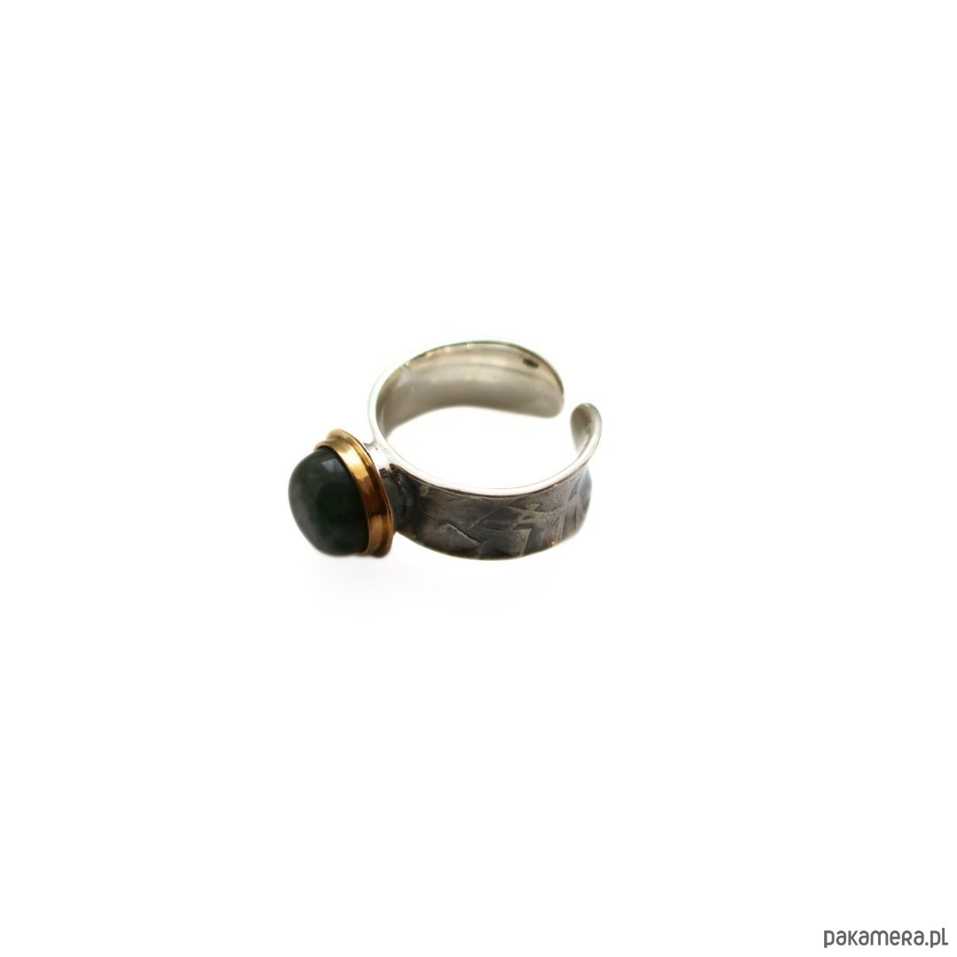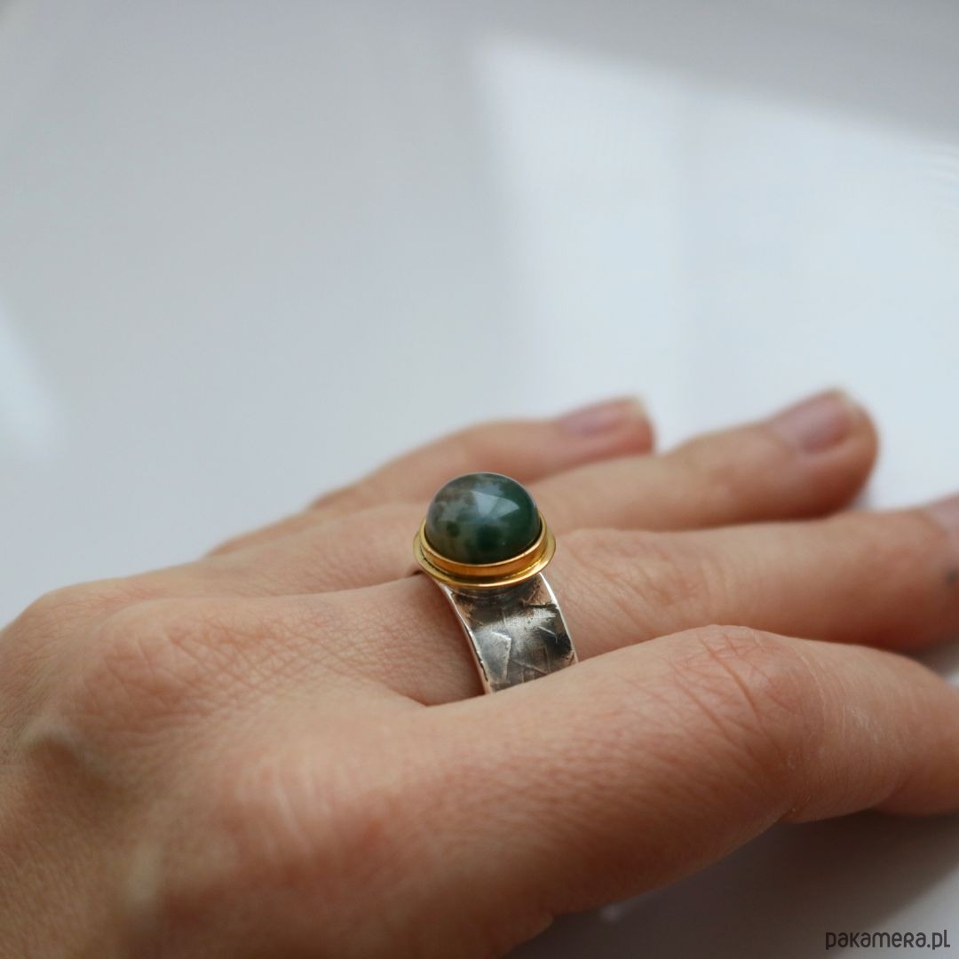 Pierścionek artystyczny z kolekcji MODERN z naturalnym agatem indyjskim. Wykonany ze srebra próby 925, oksydowany i miejscowo pozłocony.
