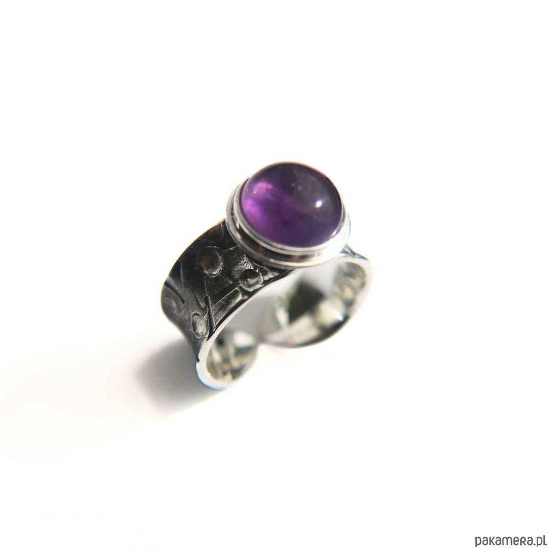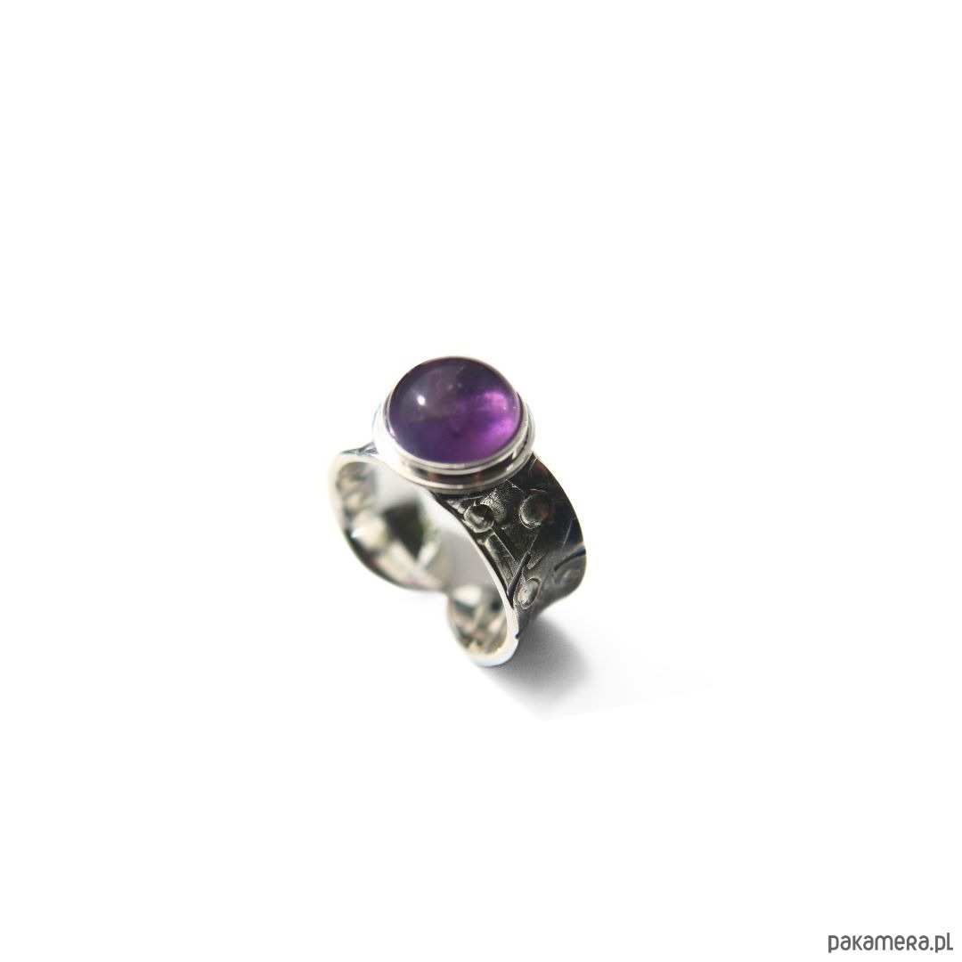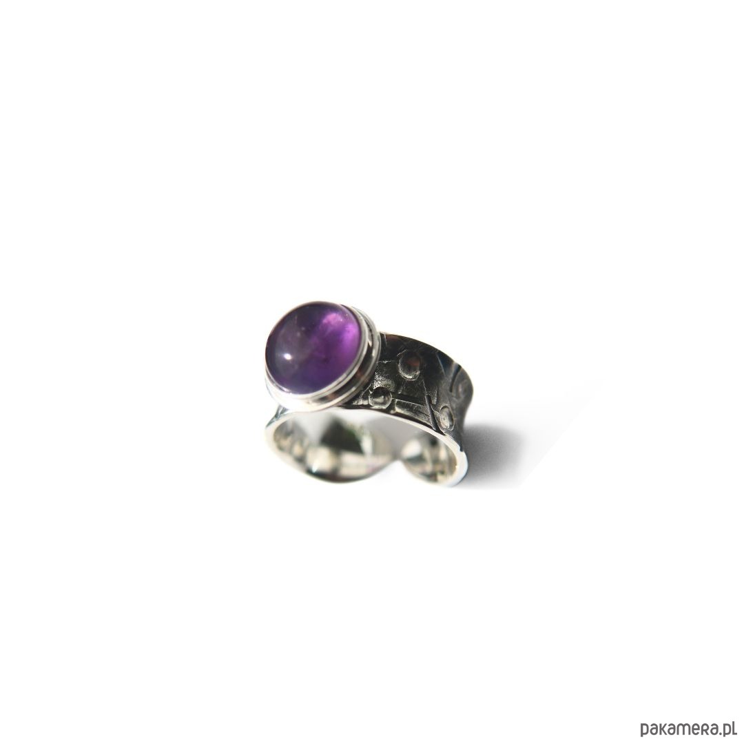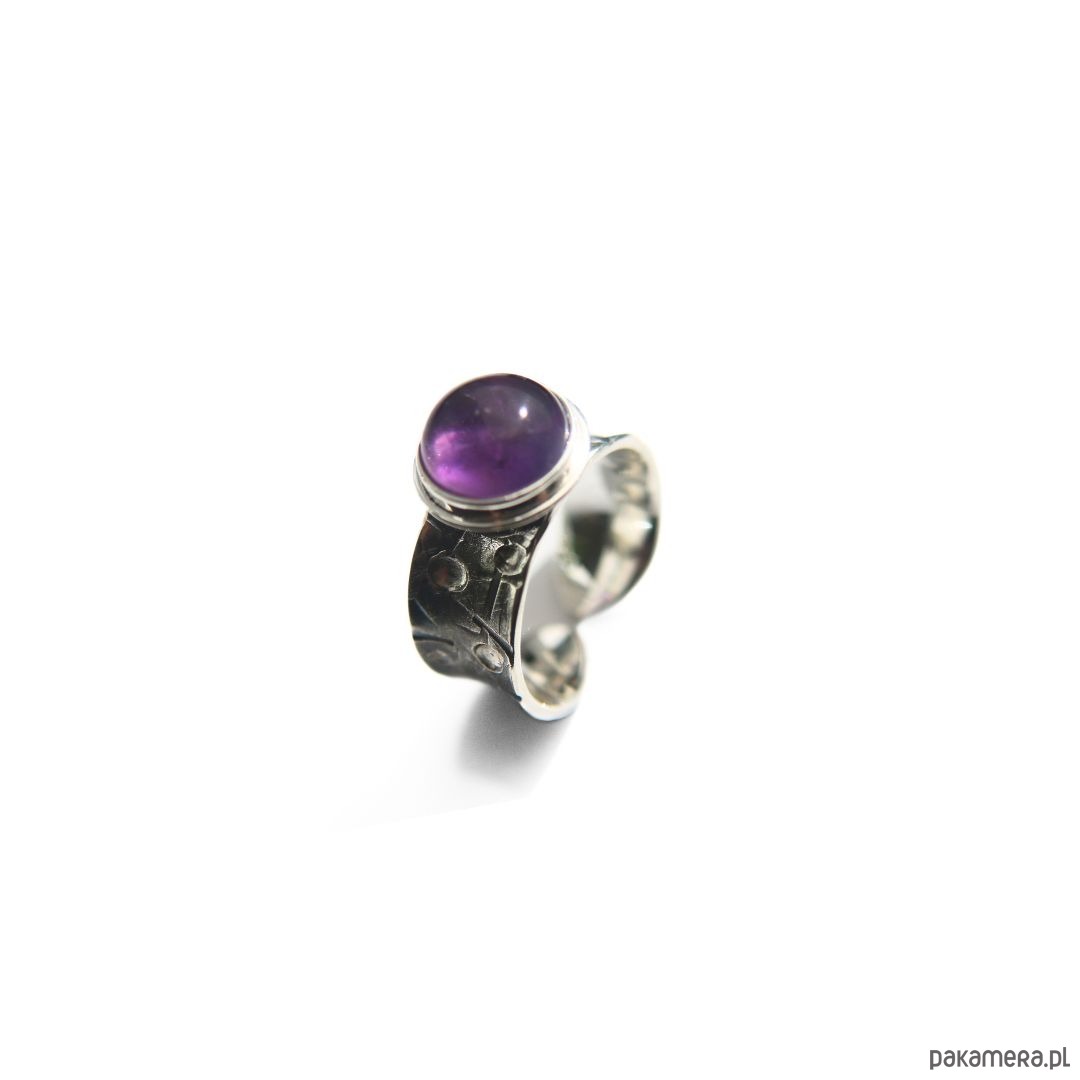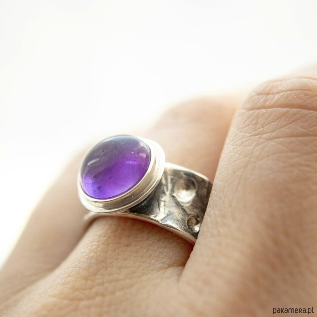 Kamień: ametyst o średnicy 10 mm (barwa fioletowa, przeświecająca, zawiera cechy smugowania i naturalne inkluzje).