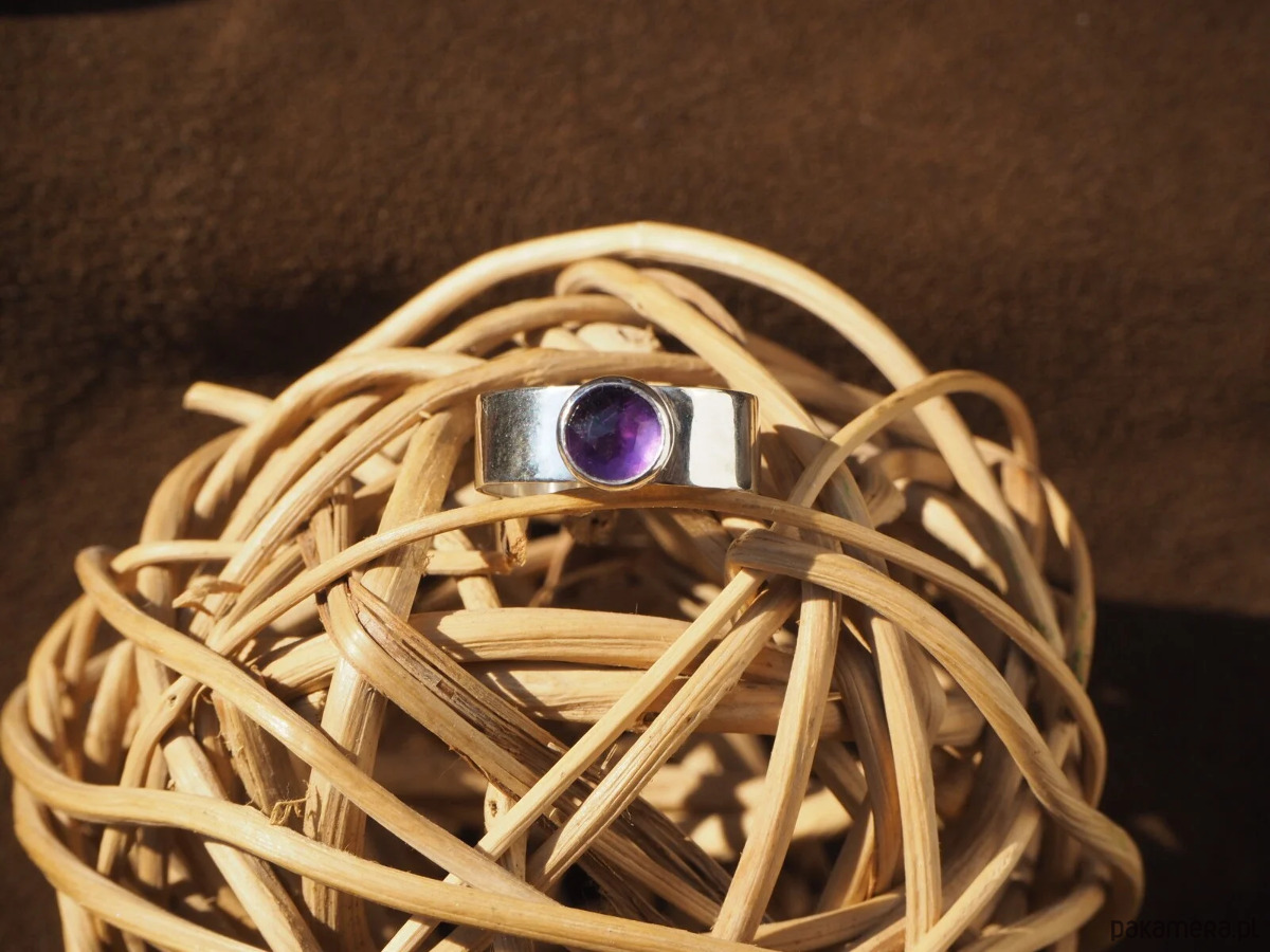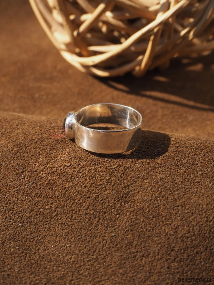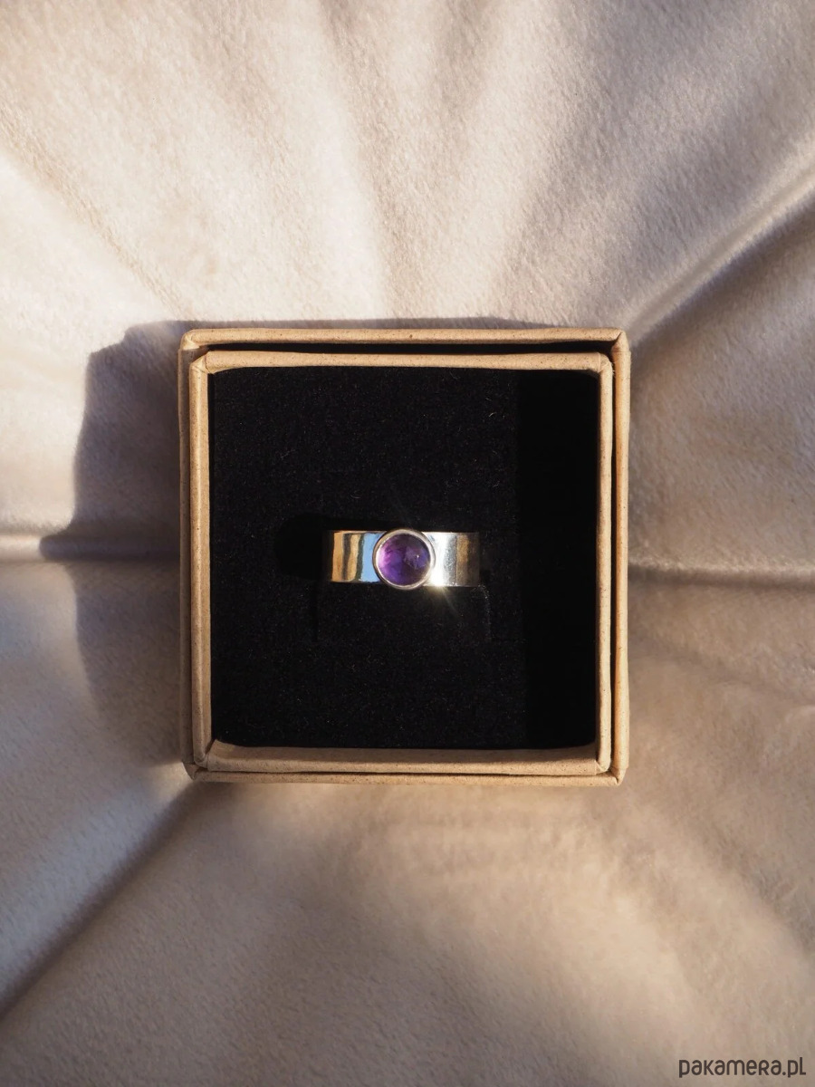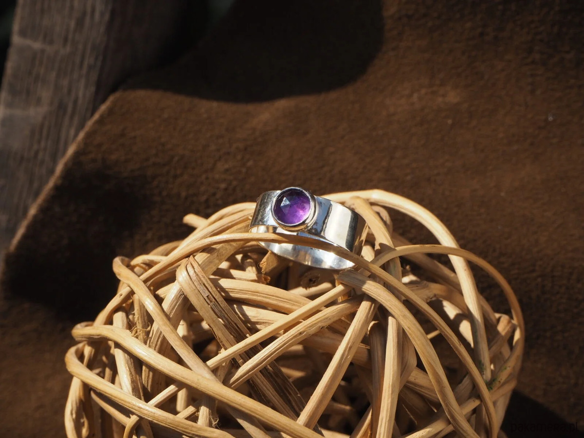 Piękny, intensywnie wybarwiony ametyst w prostej oprawie. Obrączka szeroka, gładka, wypolerowana na wysoki połysk. Oprawa pierścionka dzięki swojej prostocie sprawia, że jest on ponadczasowy i doskonale pasuje do różnych stylizacji. Wykonany ręcznie ze srebra próby 925.