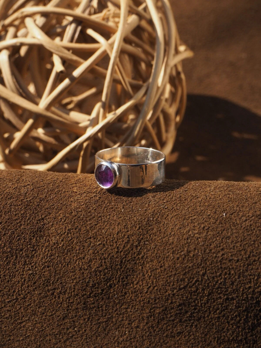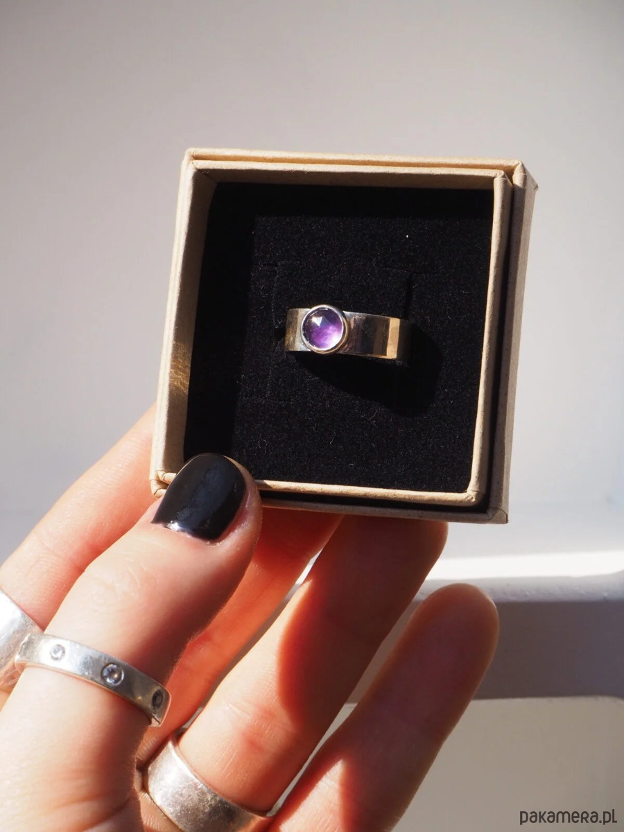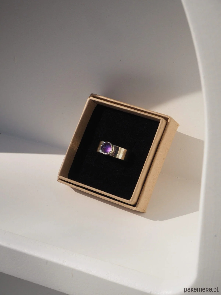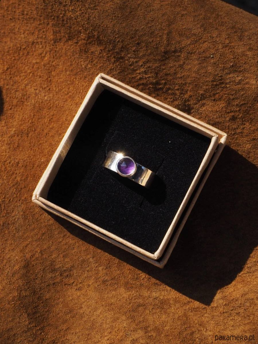Piękny, intensywnie wybarwiony ametyst w prostej oprawie. Obrączka szeroka, gładka, wypolerowana na wysoki połysk. Oprawa pierścionka dzięki swojej prostocie sprawia, że jest on ponadczasowy i doskonale pasuje do różnych stylizacji. Wykonany ręcznie ze srebra próby 925.