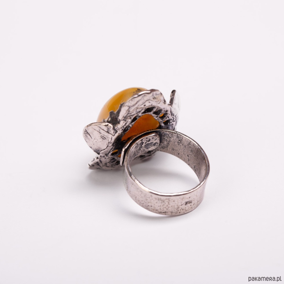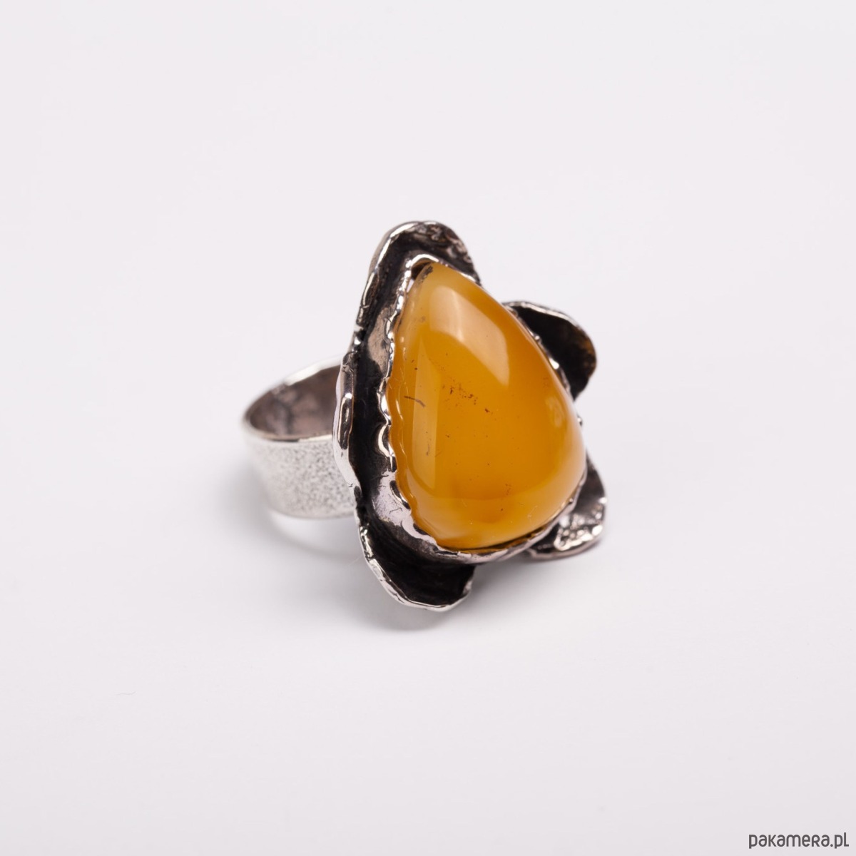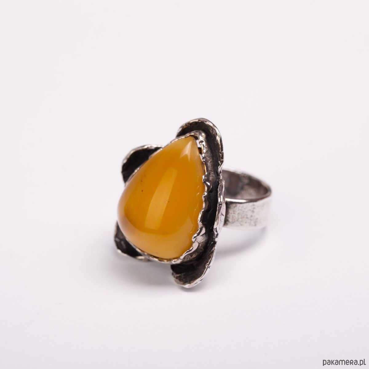 Ręcznie wykonany pierścionek z oksydowanego srebra z pięknym bursztynem w kształcie kropli. Ciepły, miodowy odcień bursztynuy przyciąga spojrzenia, a nieregularna oprawa dodaje całości artystycznego charakteru. Wyraźna forma i solidne wykonanie sprawiają, że to biżuteria z duszą – wyjątkowa i przyjemna w noszeniu.