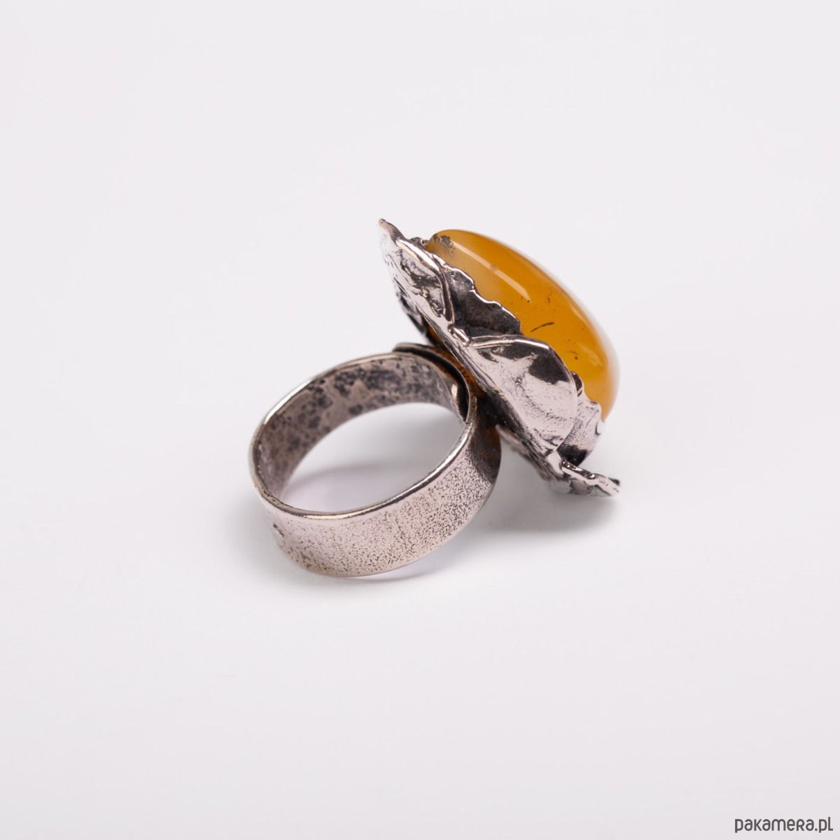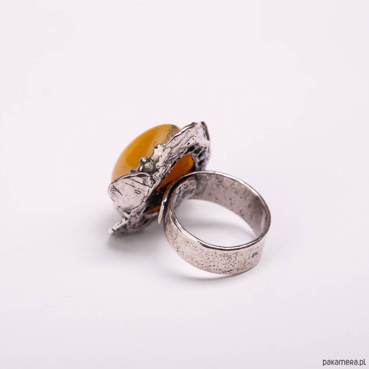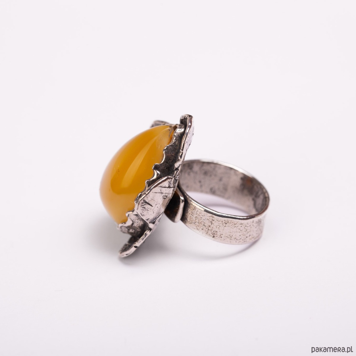 Ręcznie wykonany pierścionek z oksydowanego srebra z pięknym bursztynem w kształcie kropli. Ciepły, miodowy odcień bursztynuy przyciąga spojrzenia, a nieregularna oprawa dodaje całości artystycznego charakteru. Wyraźna forma i solidne wykonanie sprawiają, że to biżuteria z duszą – wyjątkowa i przyjemna w noszeniu.