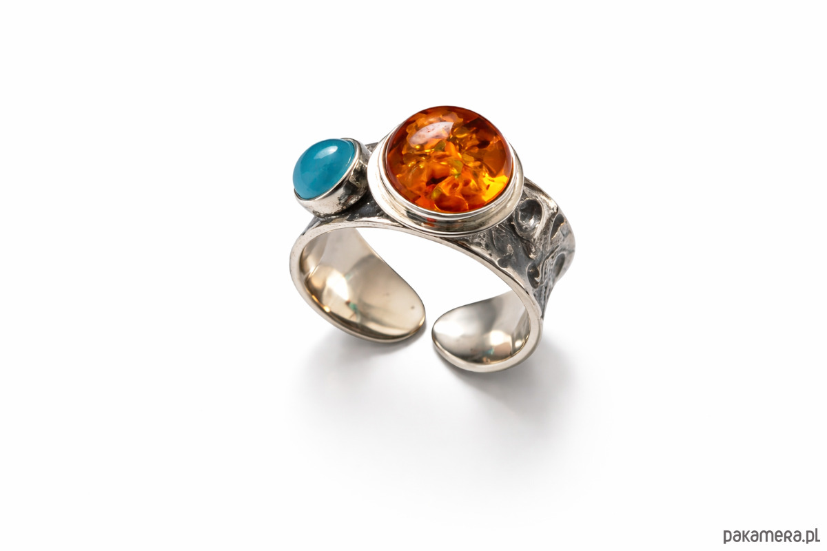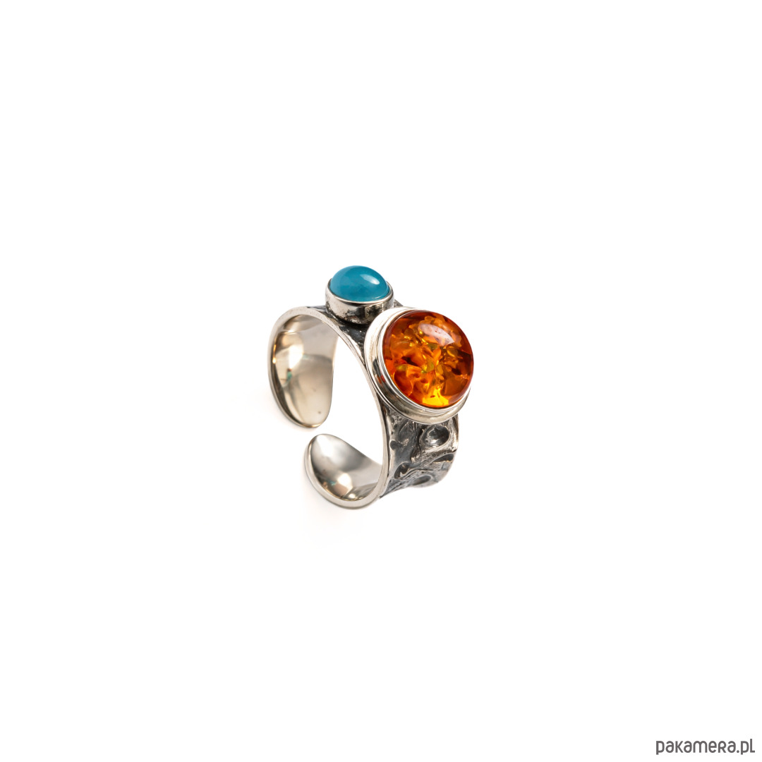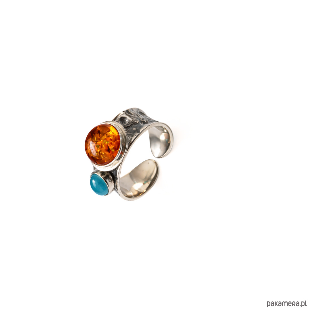 Pierścionek srebrny z bursztynem i agatem niebieskim