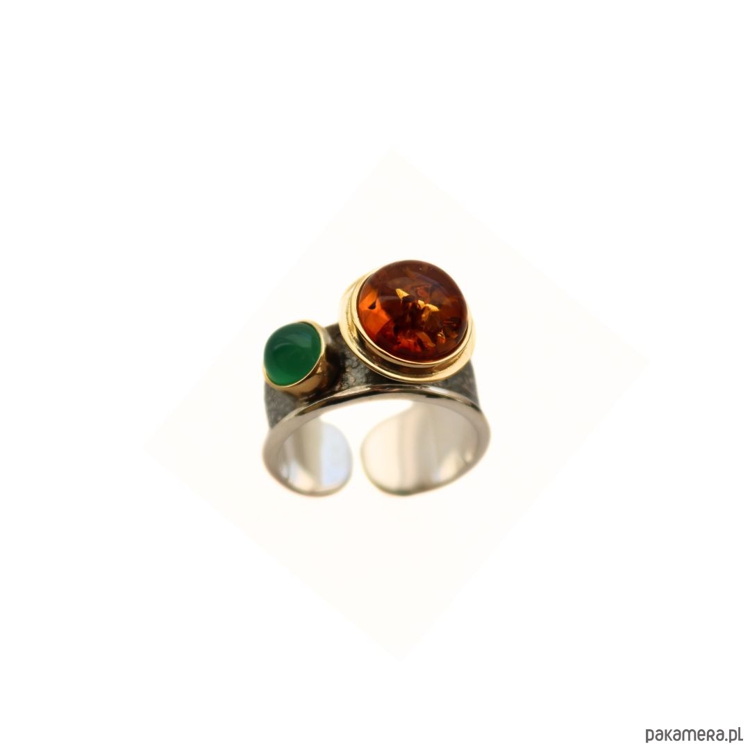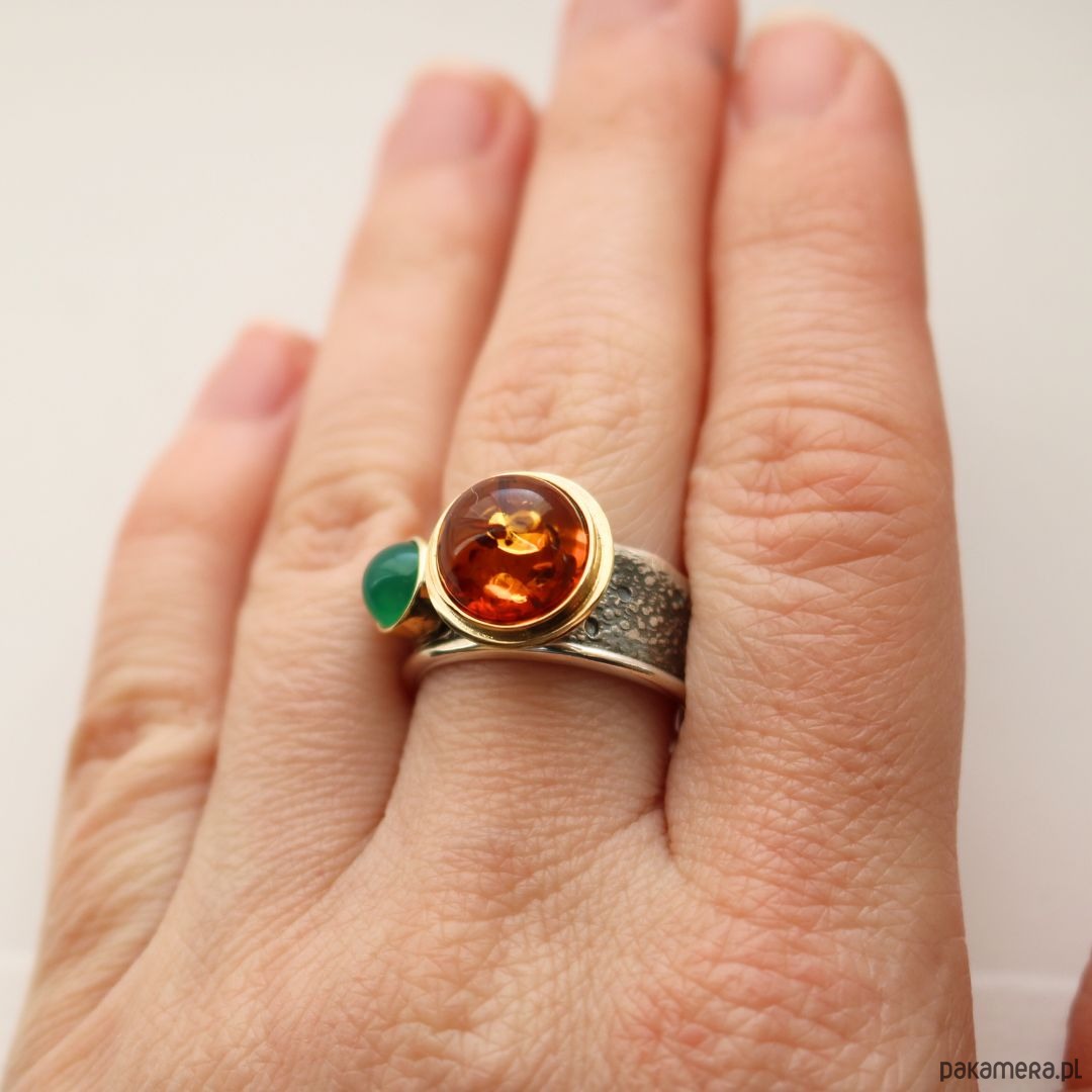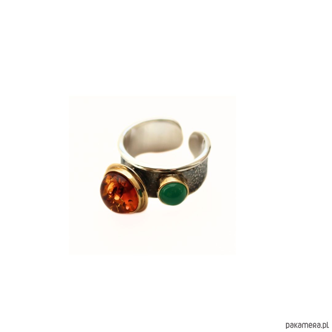 Pierścionek srebrny z Bursztynem i agatem zielonym