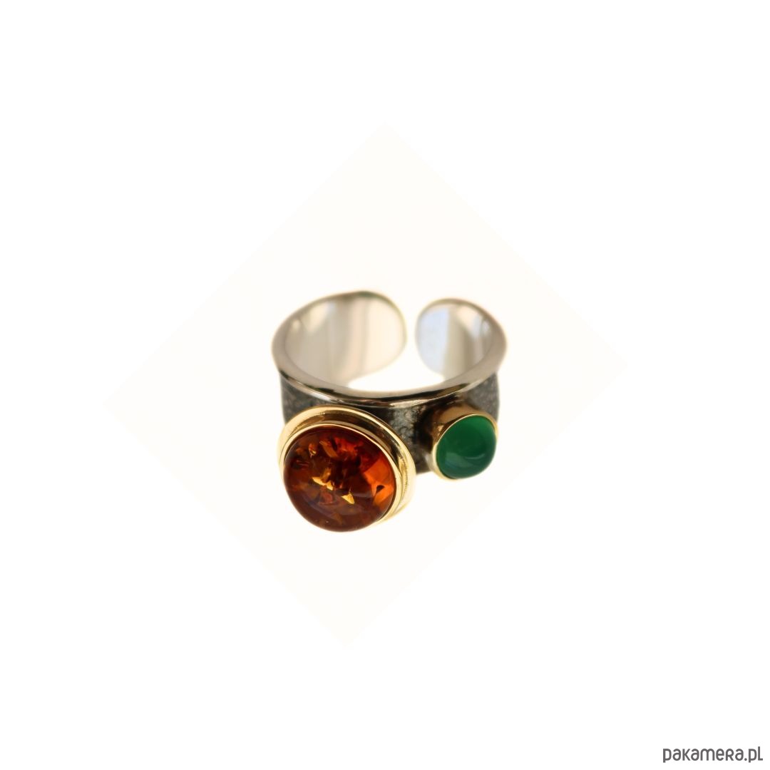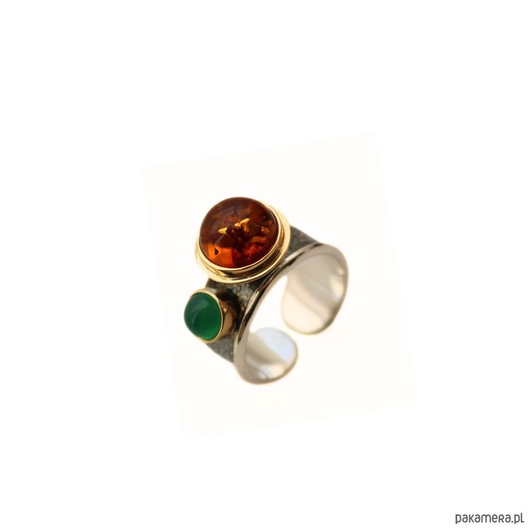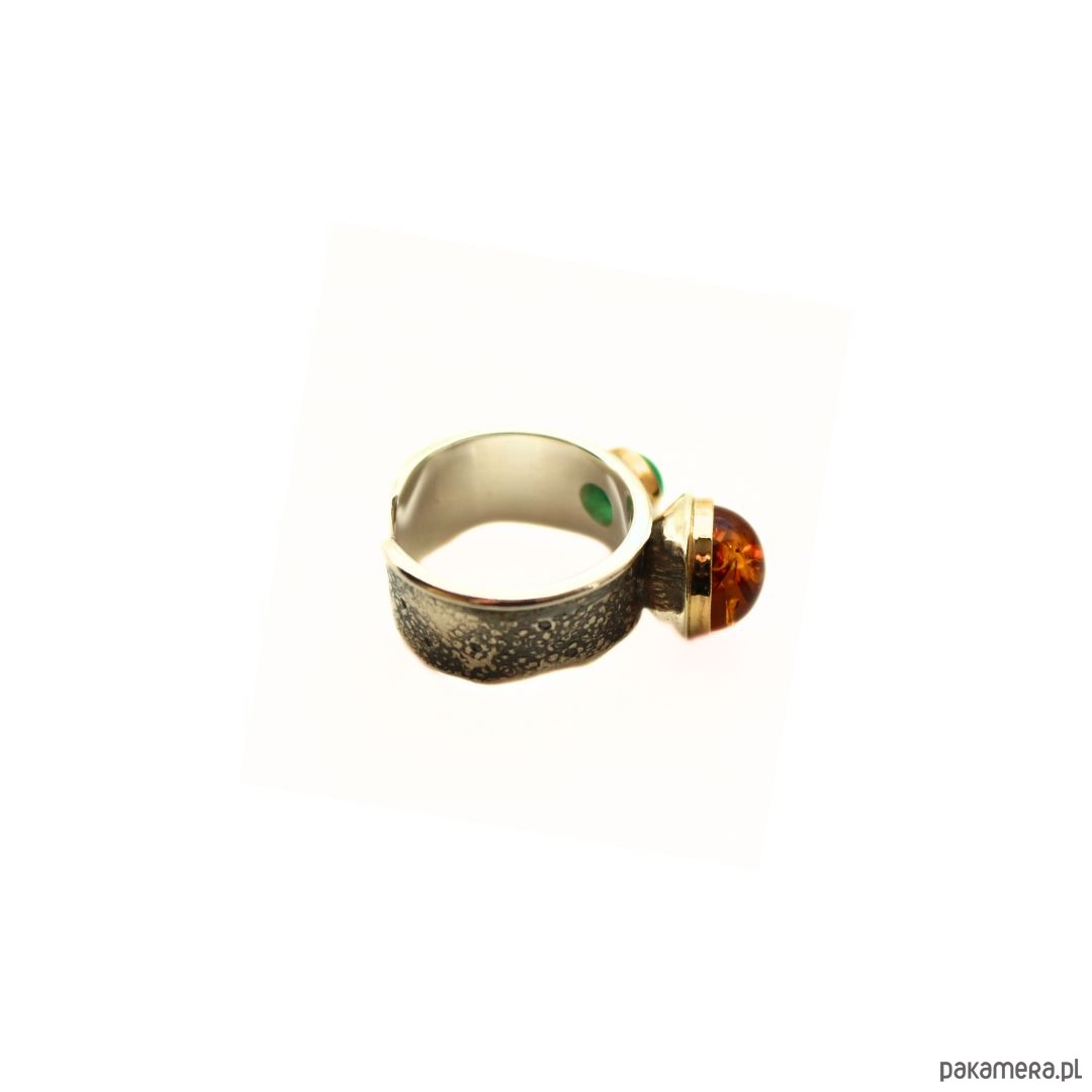 Pierścionek srebrny z Bursztynem i agatem zielonym