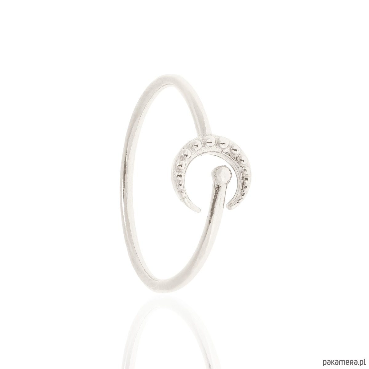 Pierścionek srebrny z księżycem. Rozmiar uniwersalny, dostosowuje się do rozmiaru palca. Całość wykonana ze srebra 925.