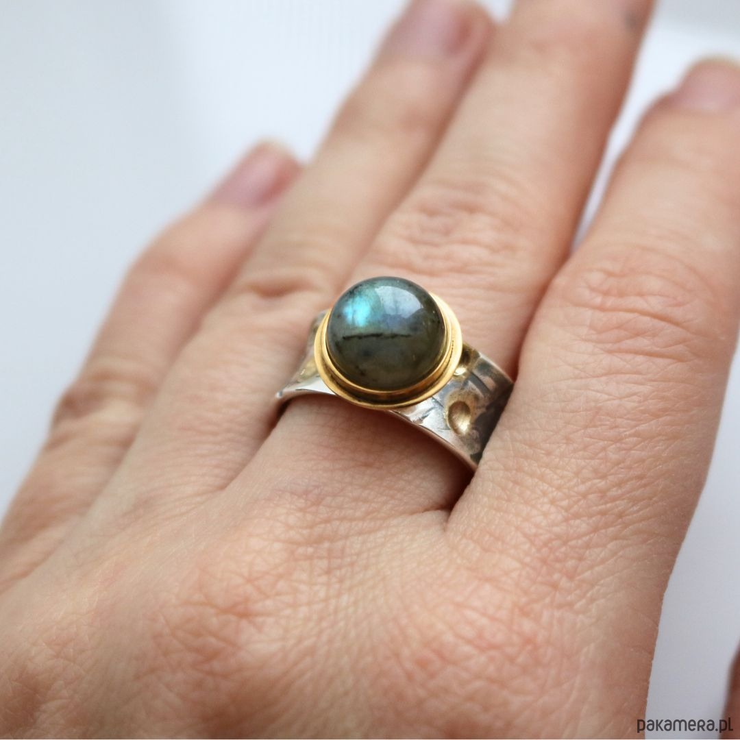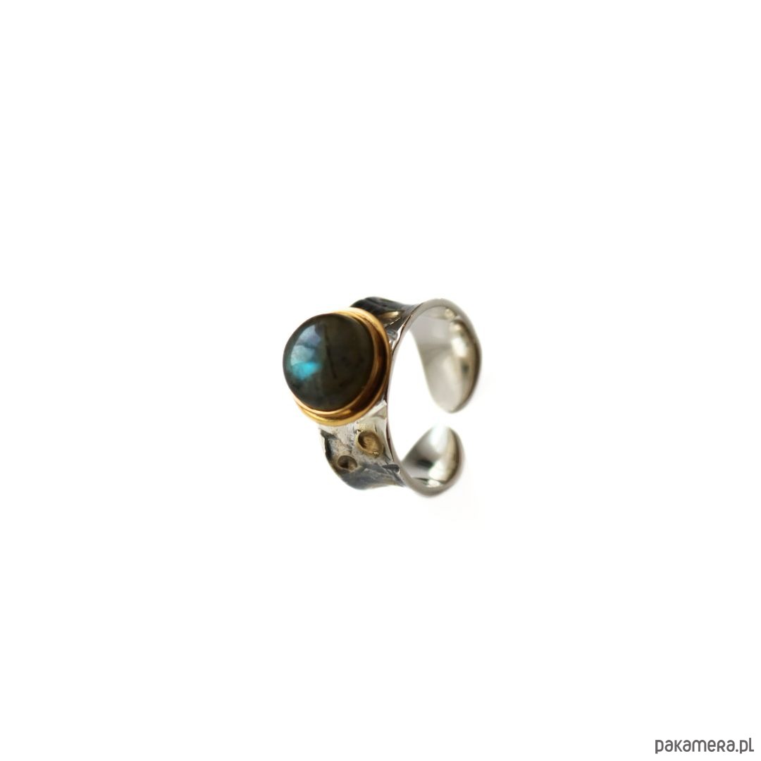 Pierścionek srebrny z Labradorytem, złocony