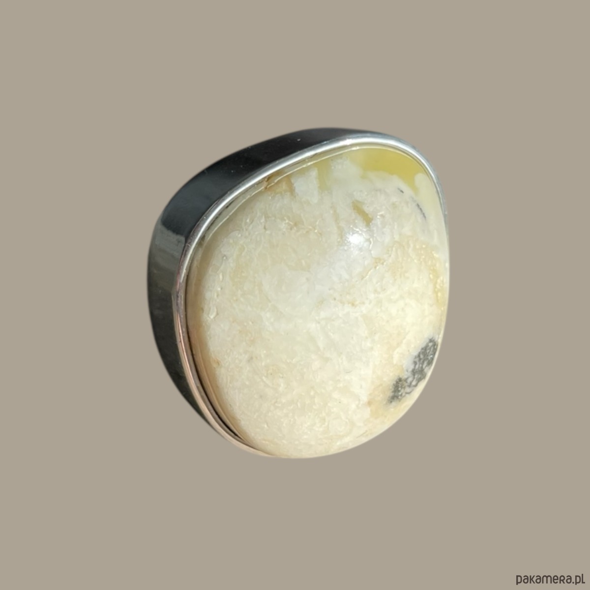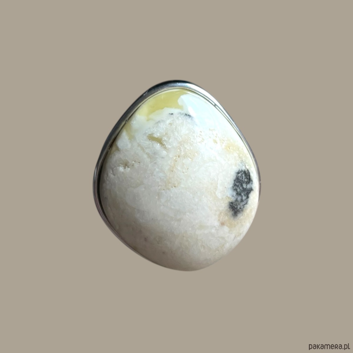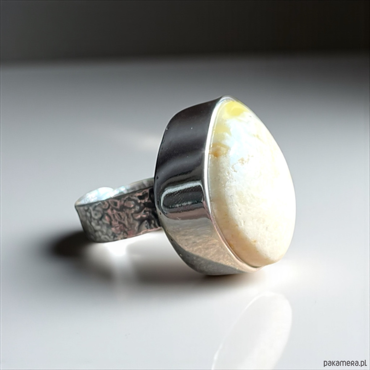 Efektowny pierścionek wykonany ręcznie ze srebra, z dużym mlecznobiałym bursztynem bałtyckim. Bursztyn osadzony jest w gładkiej, minimalistycznej oprawie, która pięknie podkreśla jego naturalny charakter. Szeroka obrączka z fakturowanym wykończeniem nadaje całości artystycznego charakteru.