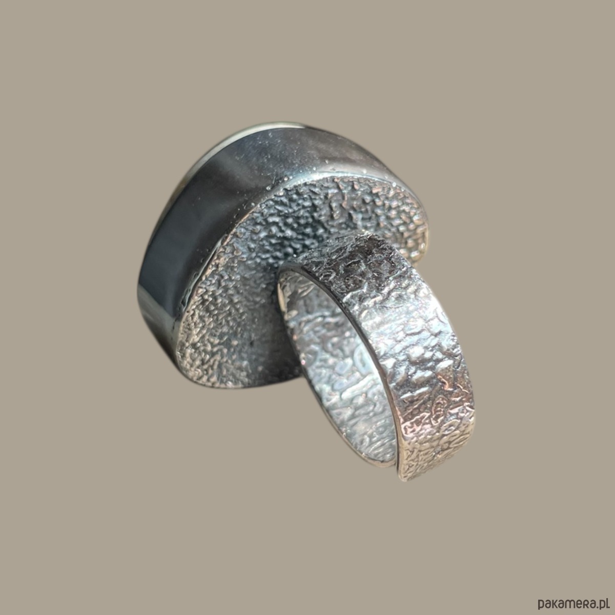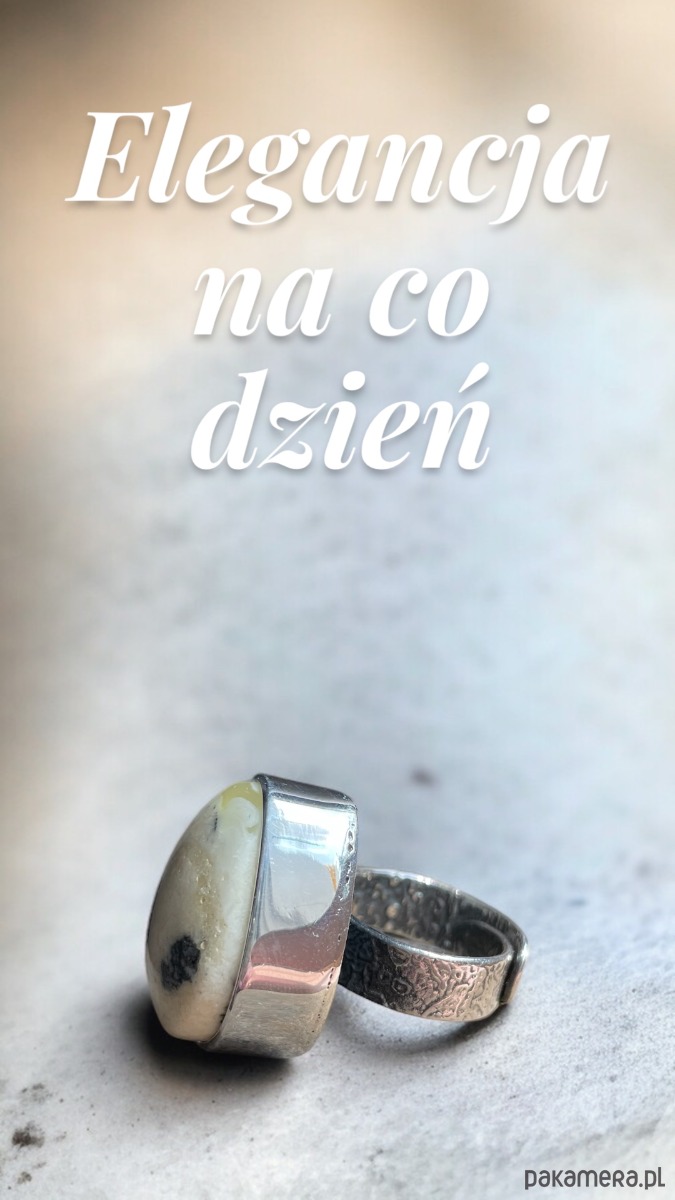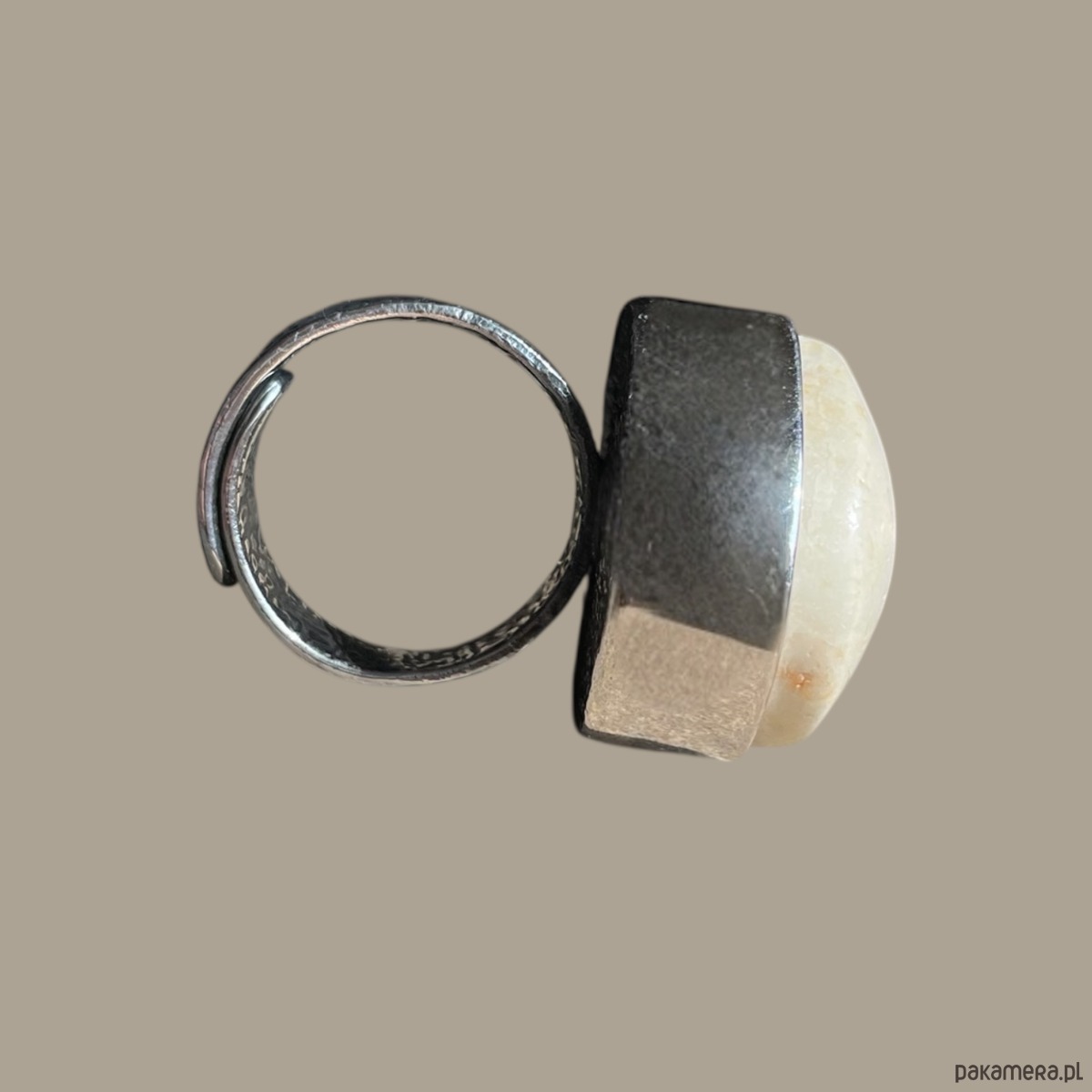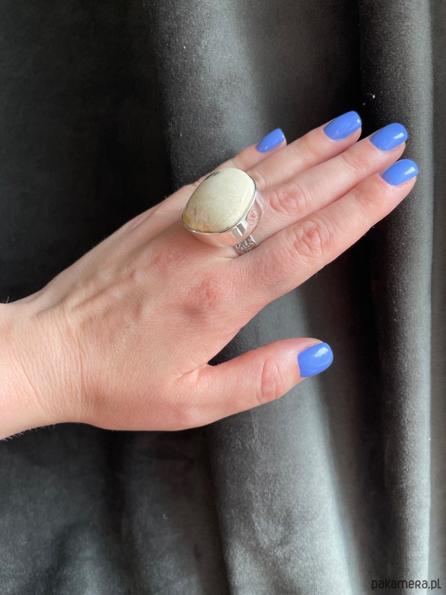 Efektowny pierścionek wykonany ręcznie ze srebra, z dużym mlecznobiałym bursztynem bałtyckim. Bursztyn osadzony jest w gładkiej, minimalistycznej oprawie, która pięknie podkreśla jego naturalny charakter. Szeroka obrączka z fakturowanym wykończeniem nadaje całości artystycznego charakteru.