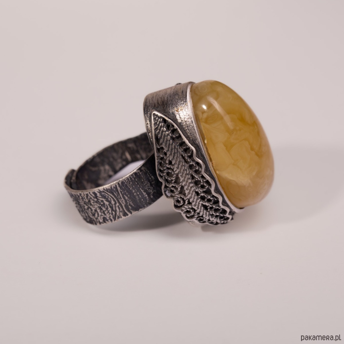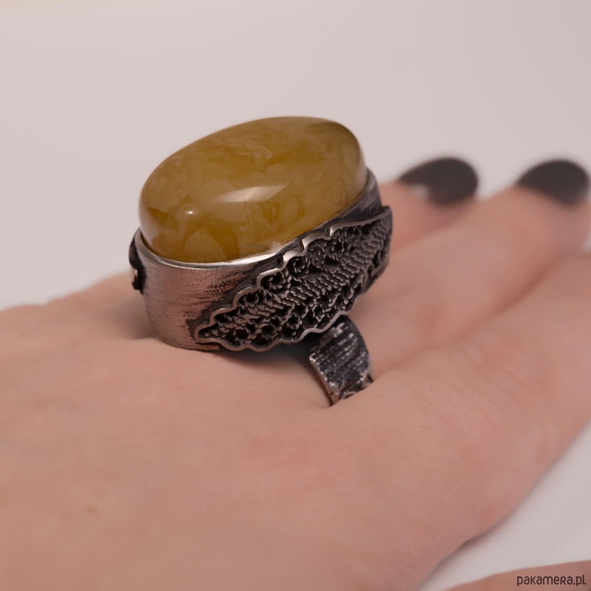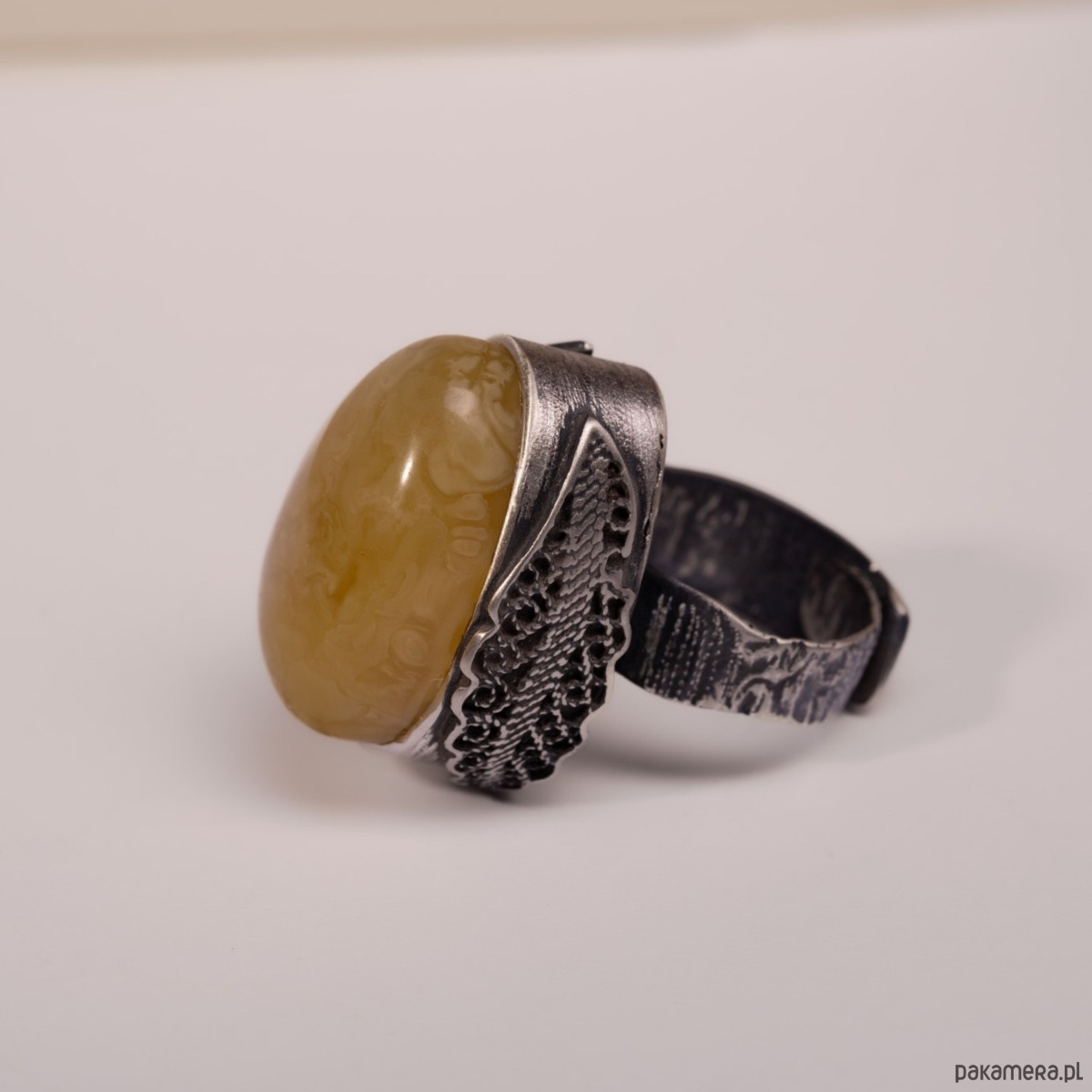 Miodowy bursztyn Bałtycki przyciąga wzrok miękkim blaskiem, a oksydowane srebro nadaje całości wyrazisty, artystyczny charakter. Czuć w dłoni solidność i jakość ręcznego wykonania, a szeroka, regulowana obrączka gwarantuje wygodę i idealne dopasowanie na co dzień. To pierścionek, który dodaje stylizacji pewności i ciepła.