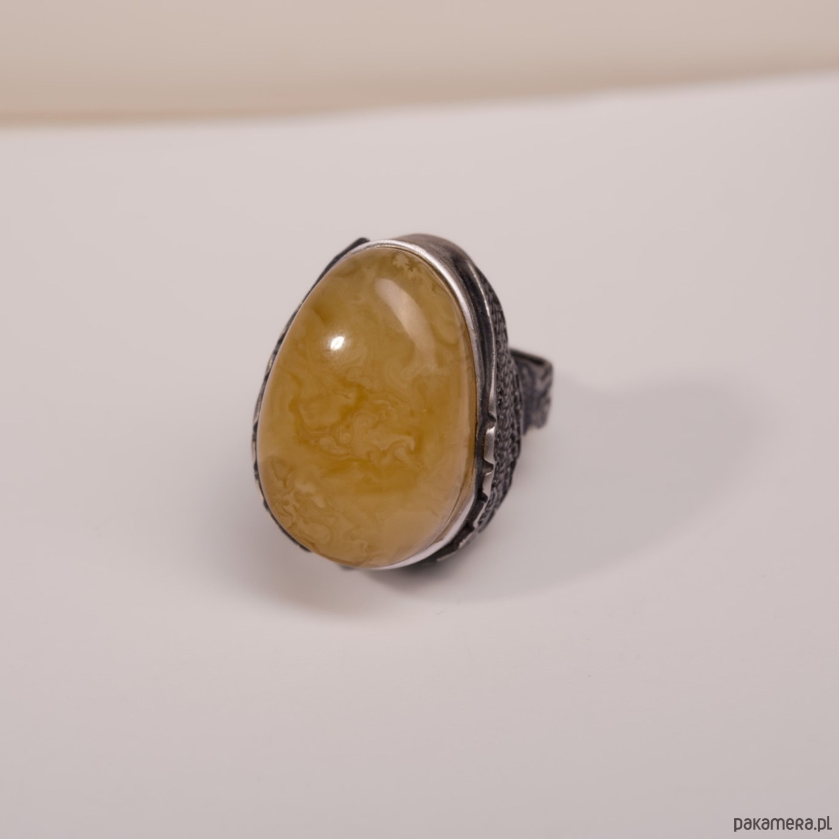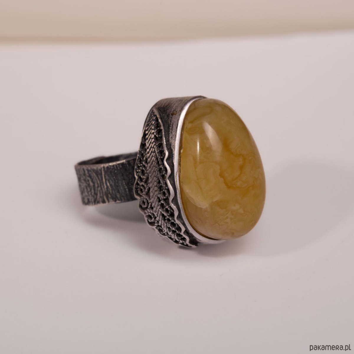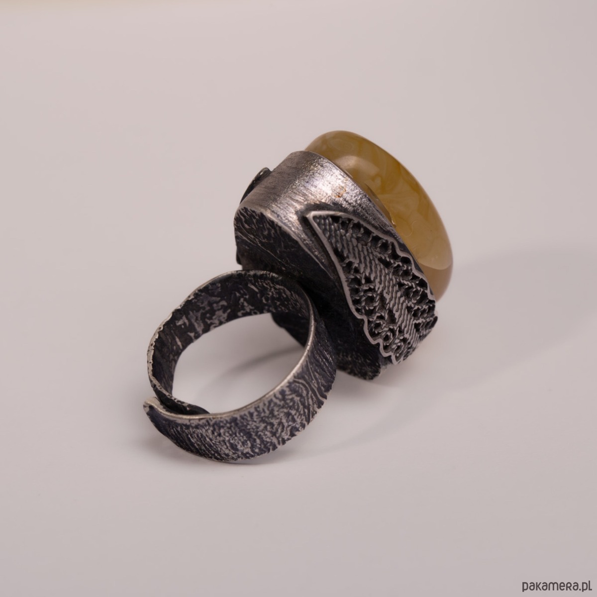 Miodowy bursztyn Bałtycki przyciąga wzrok miękkim blaskiem, a oksydowane srebro nadaje całości wyrazisty, artystyczny charakter. Czuć w dłoni solidność i jakość ręcznego wykonania, a szeroka, regulowana obrączka gwarantuje wygodę i idealne dopasowanie na co dzień. To pierścionek, który dodaje stylizacji pewności i ciepła.