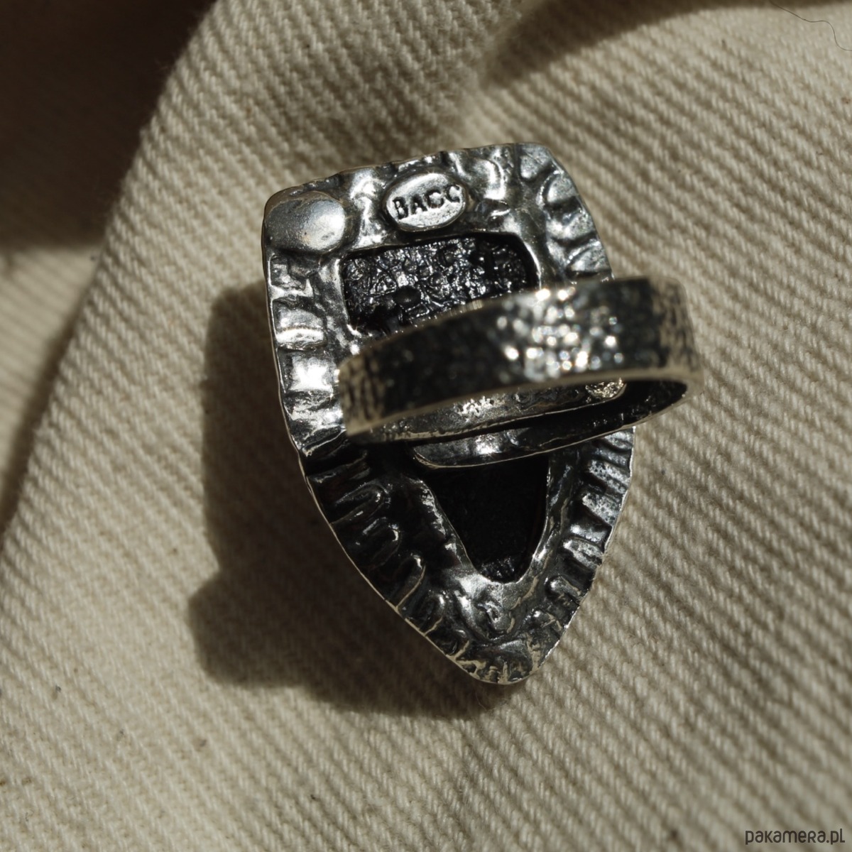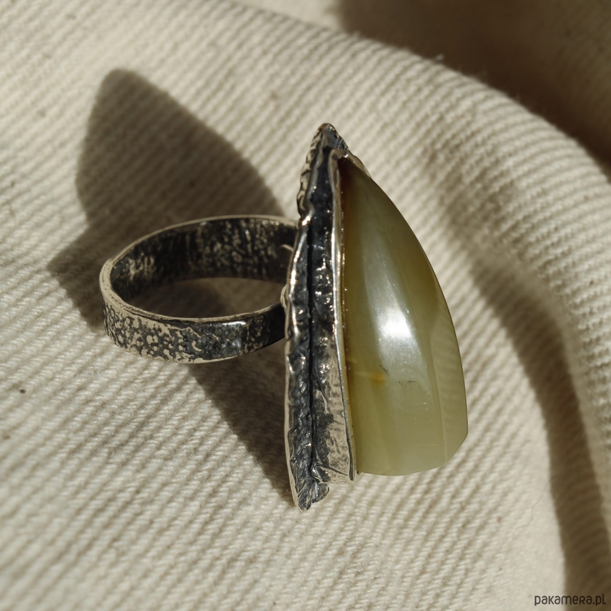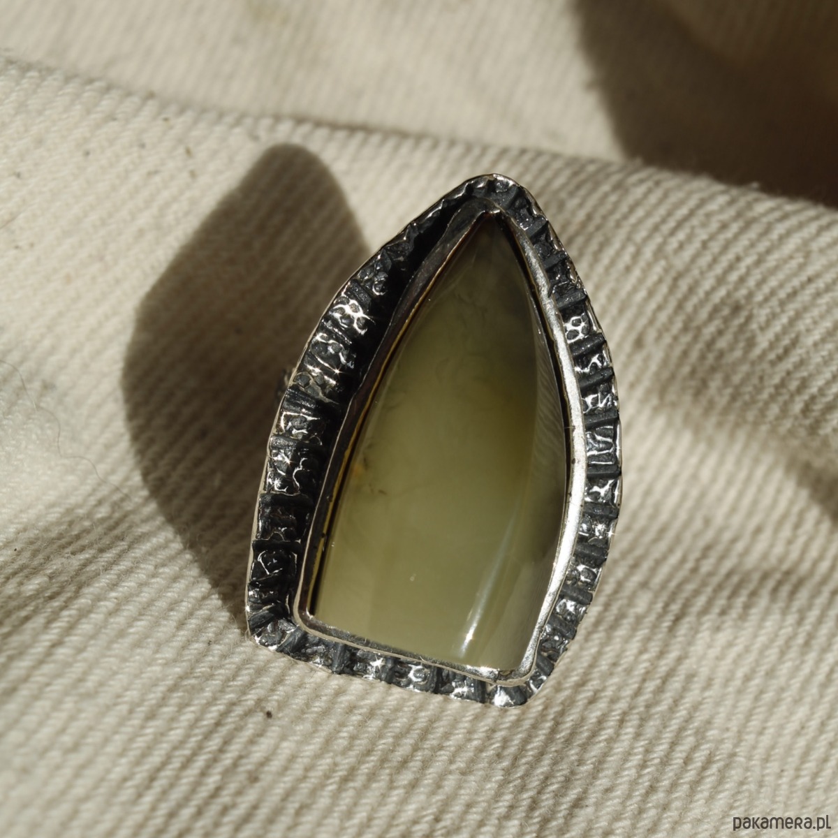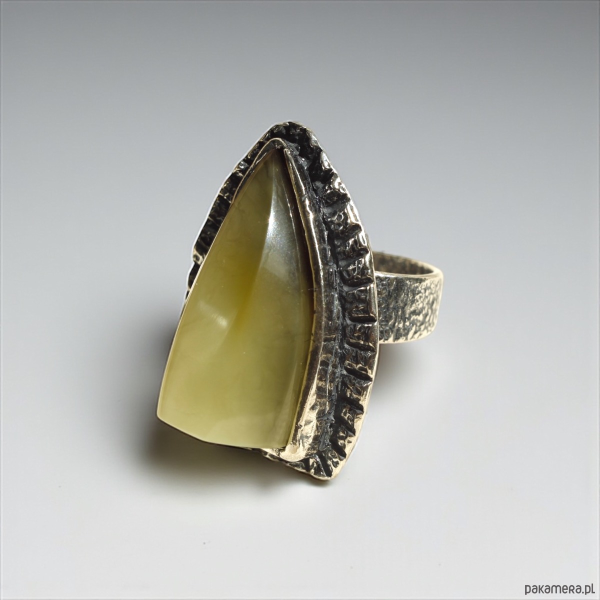 Ręcznie wykonany, unikatowy pierścionek ze srebra próby 925, ozdobiony naturalnym bursztynem bałtyckim w mleczno-oliwkowym odcieniu. Wyrazista forma oraz surowe wykończenie tworzą efektowną biżuterię dla miłośniczek oryginalnych dodatków. Regulowana obrączka zapewnia wygodne dopasowanie.