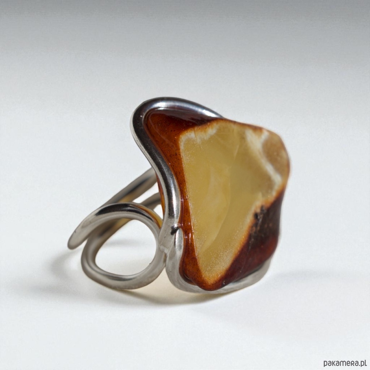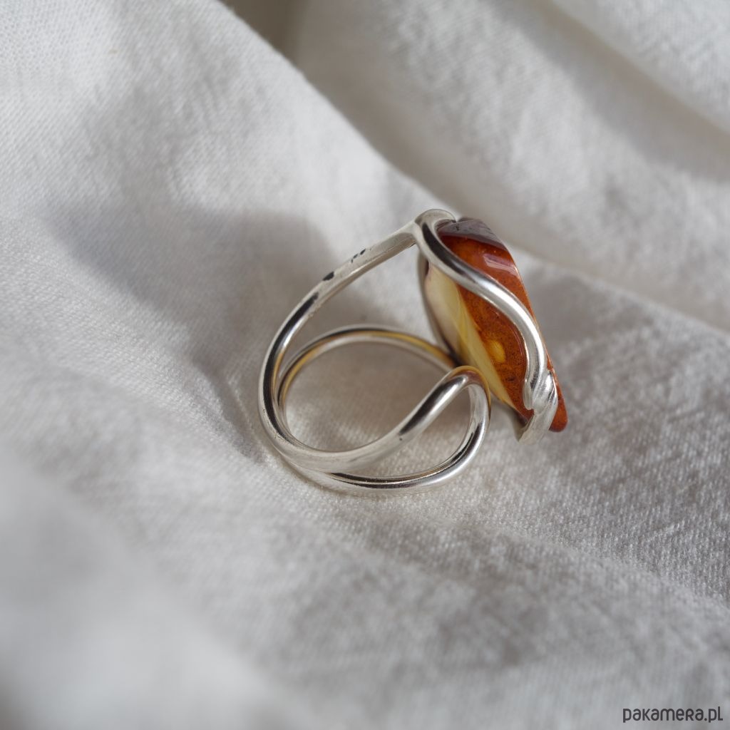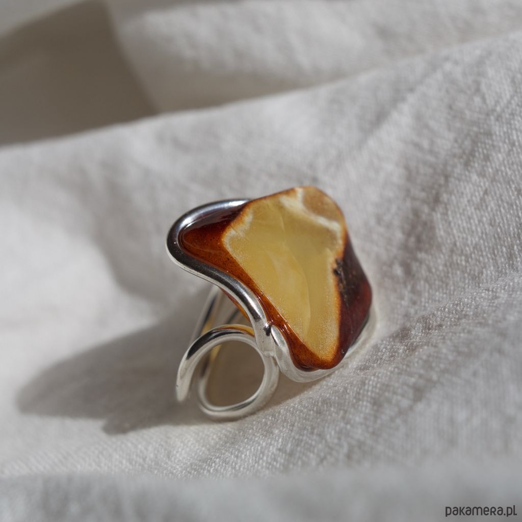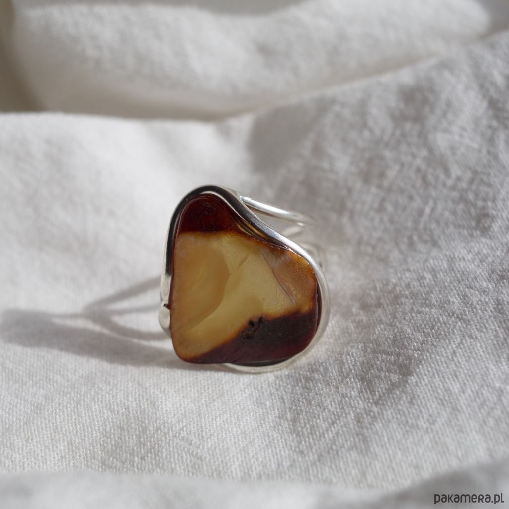 Ręcznie wykonany pierścionek ze srebra próby 925, ozdobiony naturalnym bursztynem bałtyckim o niezwykle ciekawej barwie - odcienie miodowe, kremowe i głęboki brąz tworzą w nim niepowtarzalny wzór.
