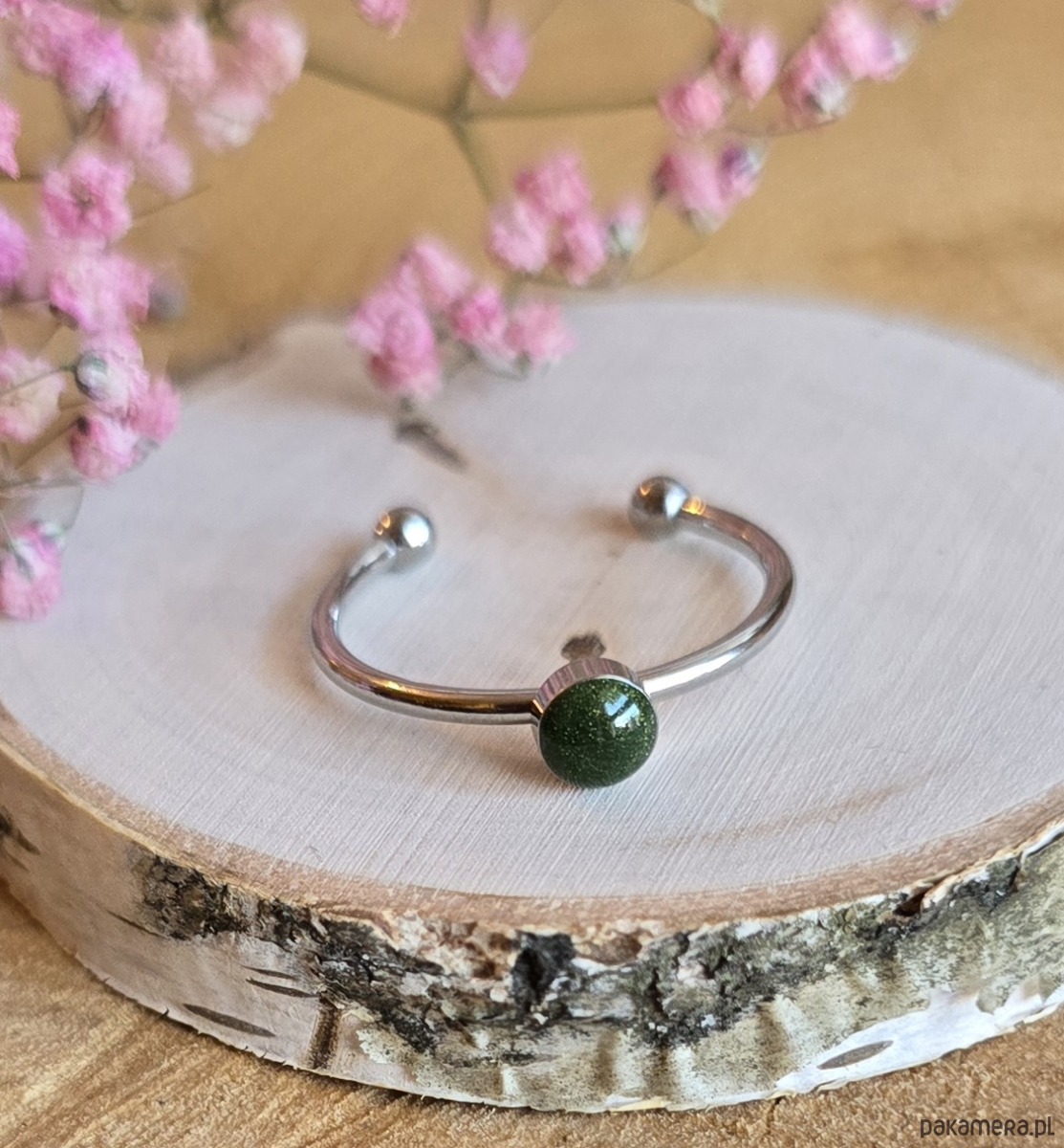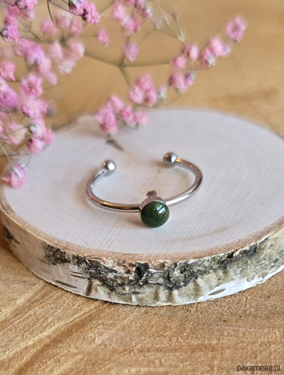 Pierścionek srebrny zielone oczko zielony minimalistyczny żywica brokatowy