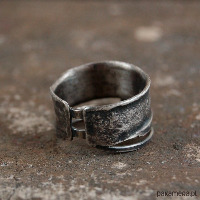 Pierścionek ze srebra i złota próby 585. Srebro oksydowane. Maksymalna szerokość obrączki 1,4 cm. Rozmiar regulowany - proszę o podanie rozmiaru, pierścionek zostanie ustawiony.