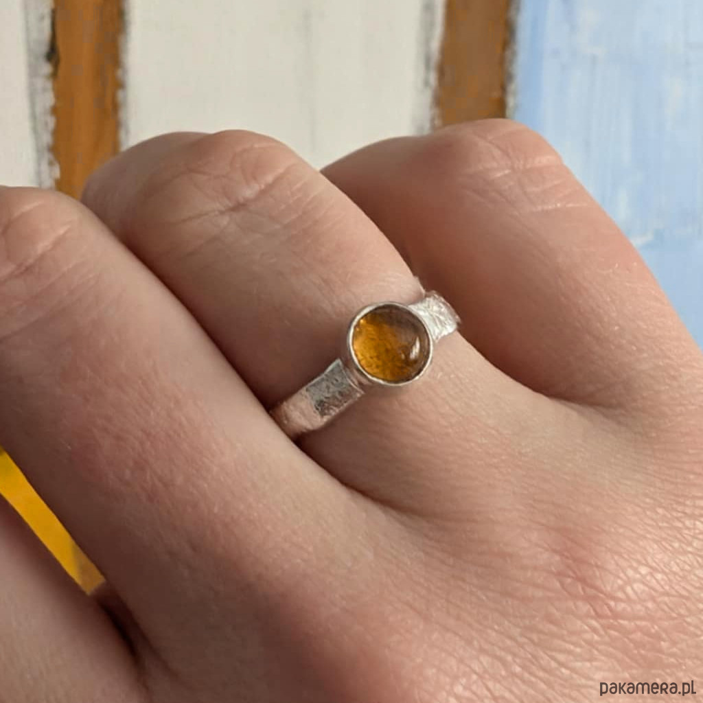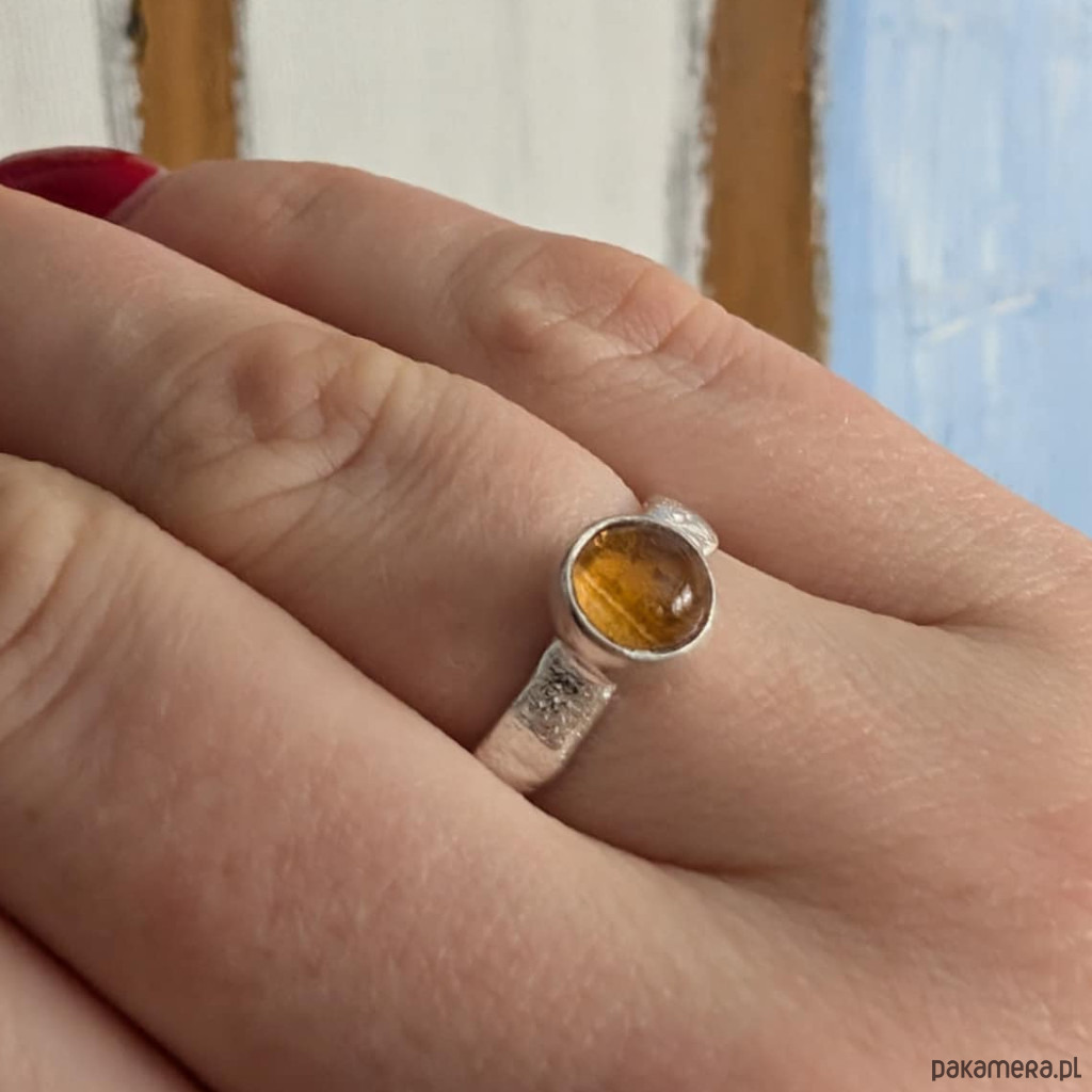 Delikatny pierścionek z oprawionym w srebro pr. 925 cytrynem. Średnica oprawy kamienia 7 mm. Szerokość obrączki 4 mm. Rozmiar jubilerski 14, mogę powiększyć do rozmiaru max 15. Pierścionek zostanie zapakowany w ozdobne pudełeczko.