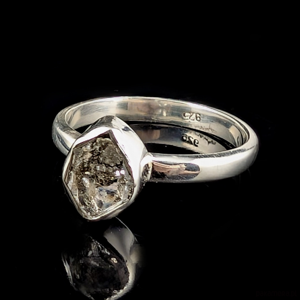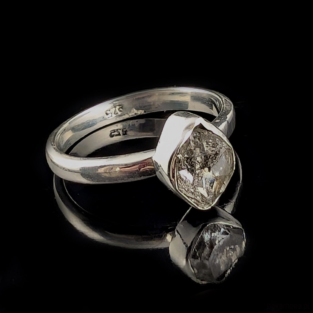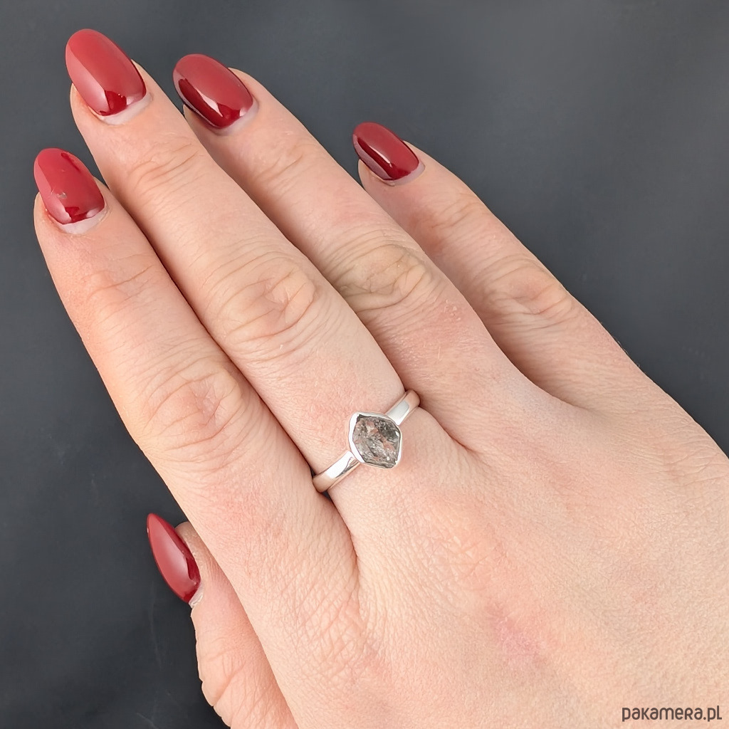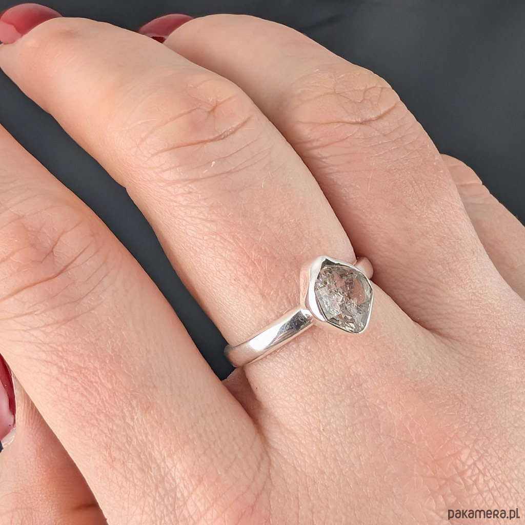 Subtelny pierścionek z oprawionym w srebro próby 925 kryształem kwarcu zwanym herkimerem- niezwykle czysta odmiana nazywana też diamentem z Herkimer (od nazwy miejsca występowania, okręg Herkimer w stanie Nowy Jork). Wymiary oprawy kamienia 9 x 7mm, rozmiar jubilerski regulowany w zakresie 18-21. Proszę napisać na jaki opasować. Waga 2,9 g. Kobiecy i awangardowy. Wykonany przez dostawcę kamieni. Pierścionek zostanie zapakowany w eleganckie pudełeczko