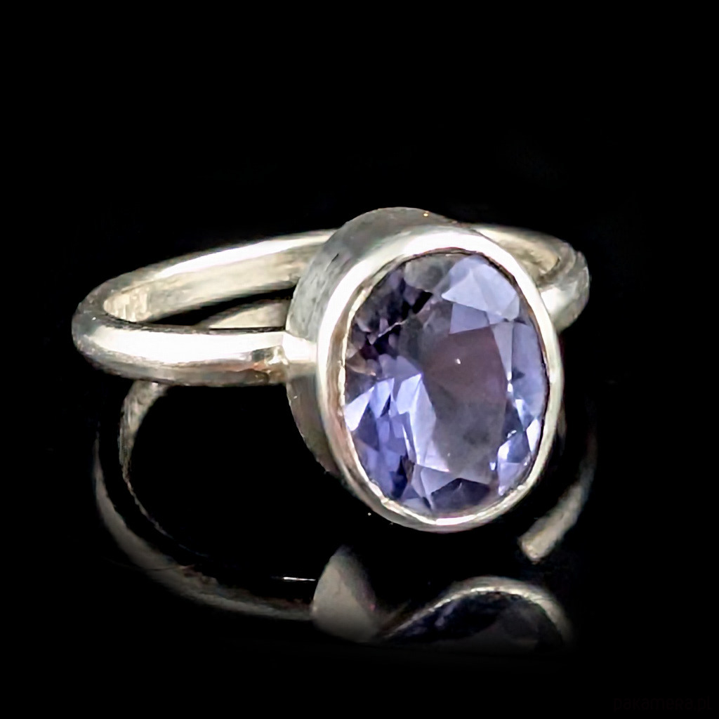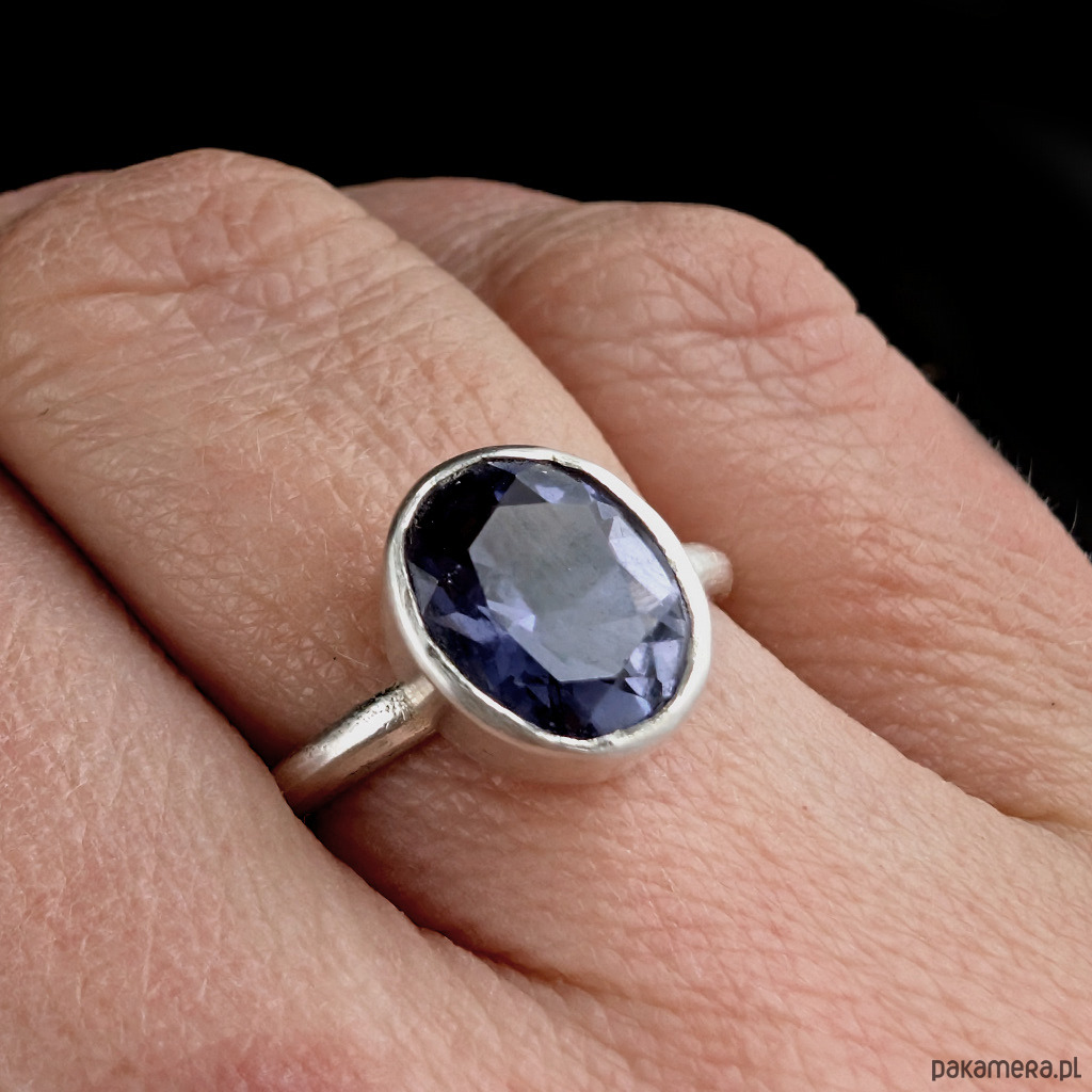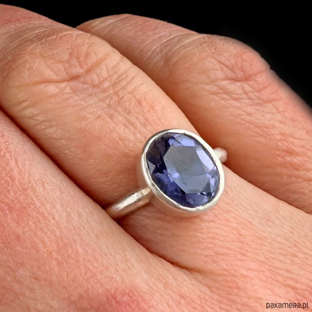 W srebrną, subtelną obrączkę oprawiony został piękny szlachetny iolit (kordieryt) o wymiarach oprawy 11 x 8 mm. Szerokość obrączki 2 mm. Rozmiar jubilerski 14, możliwość zamowienia innego rozmiaru w zależności od dostępnosci kamienia. Waga 2,87 g. Pierścionek zostanie zapakowany w ozdobne pudełeczko.