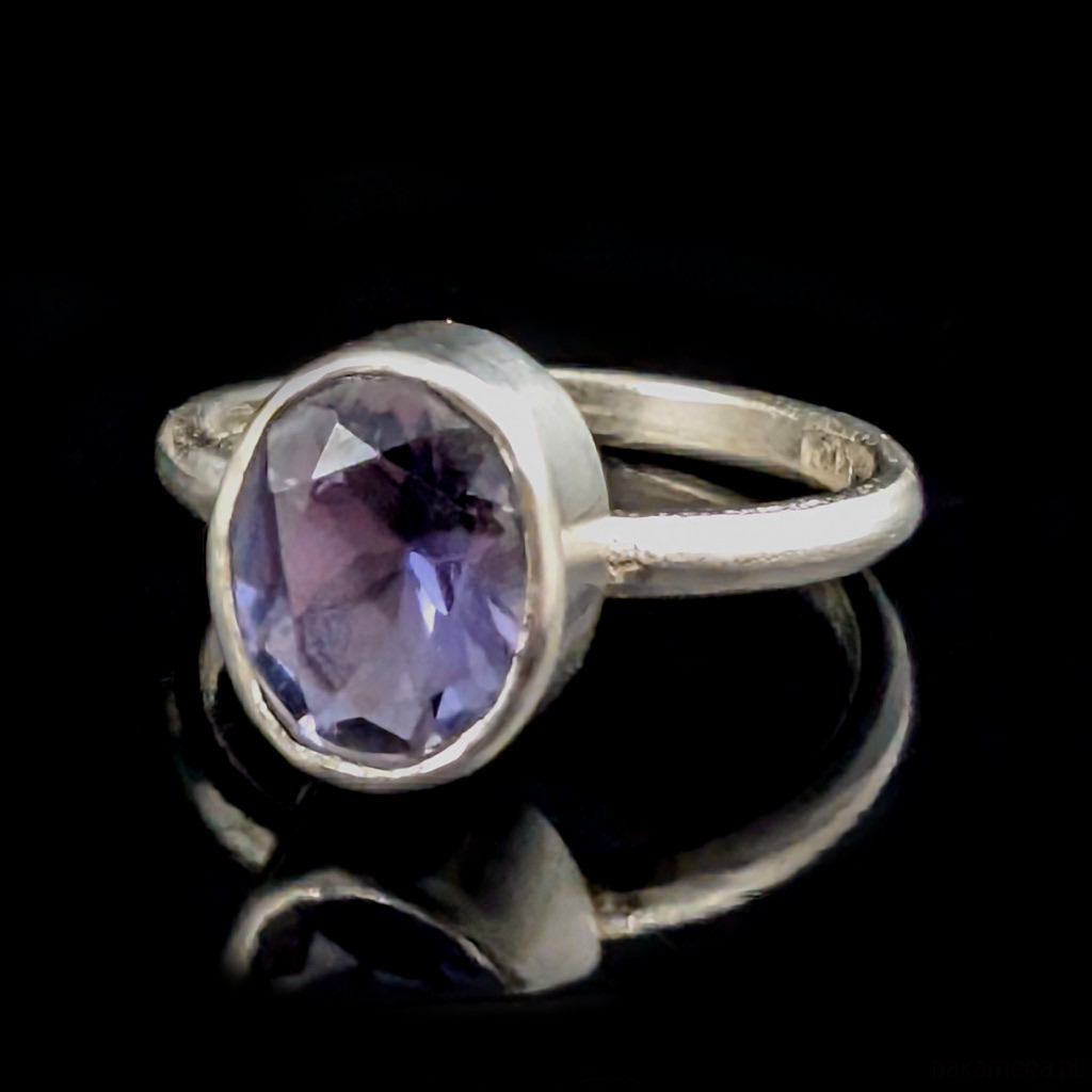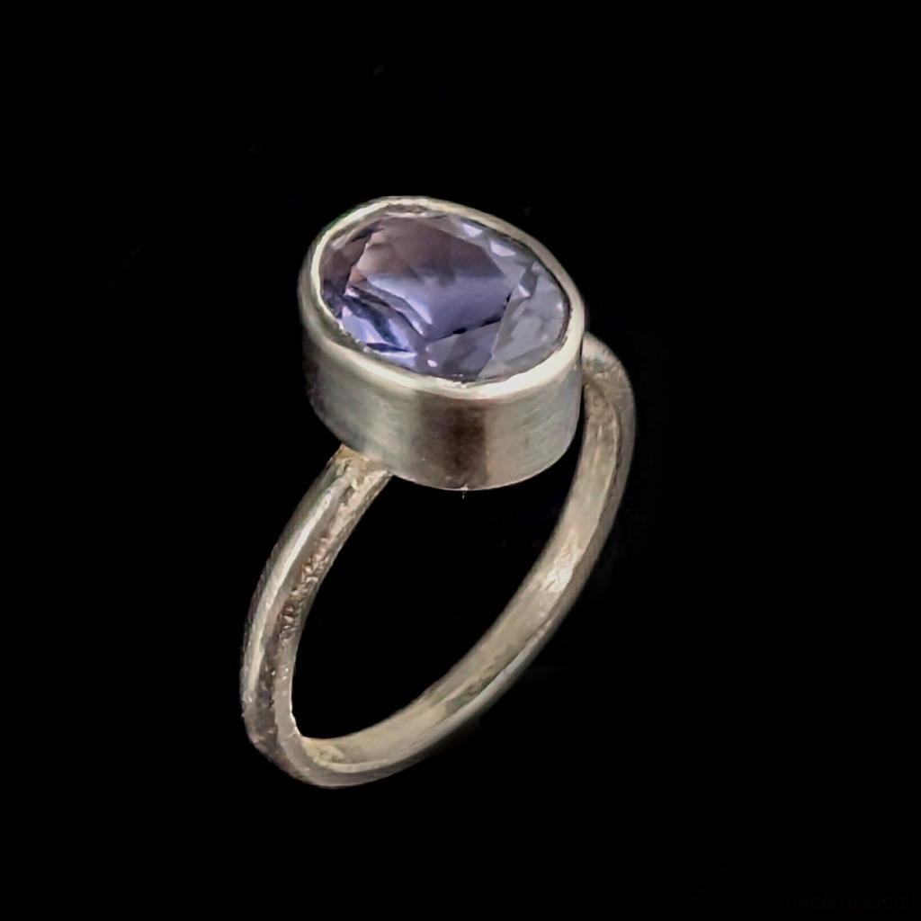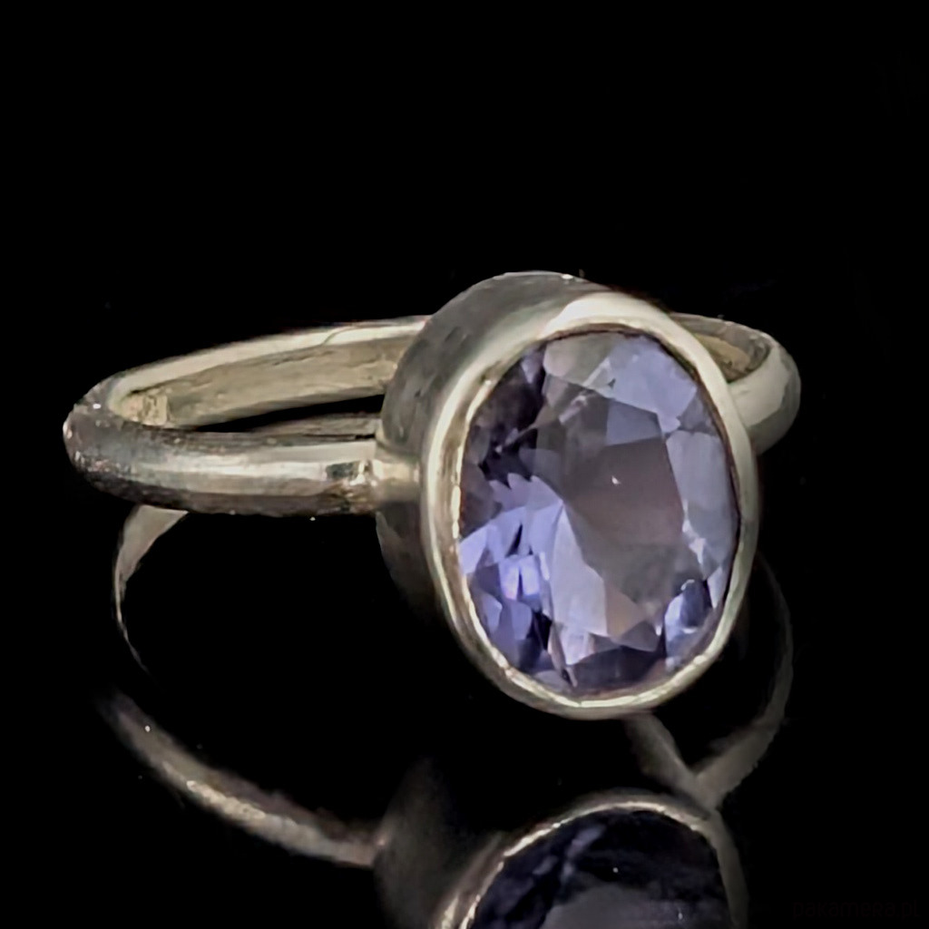 W srebrną, subtelną obrączkę oprawiony został piękny szlachetny iolit (kordieryt) o wymiarach oprawy 11 x 8 mm. Szerokość obrączki 2 mm. Rozmiar jubilerski 14, możliwość zamowienia innego rozmiaru w zależności od dostępnosci kamienia. Waga 2,87 g. Pierścionek zostanie zapakowany w ozdobne pudełeczko.