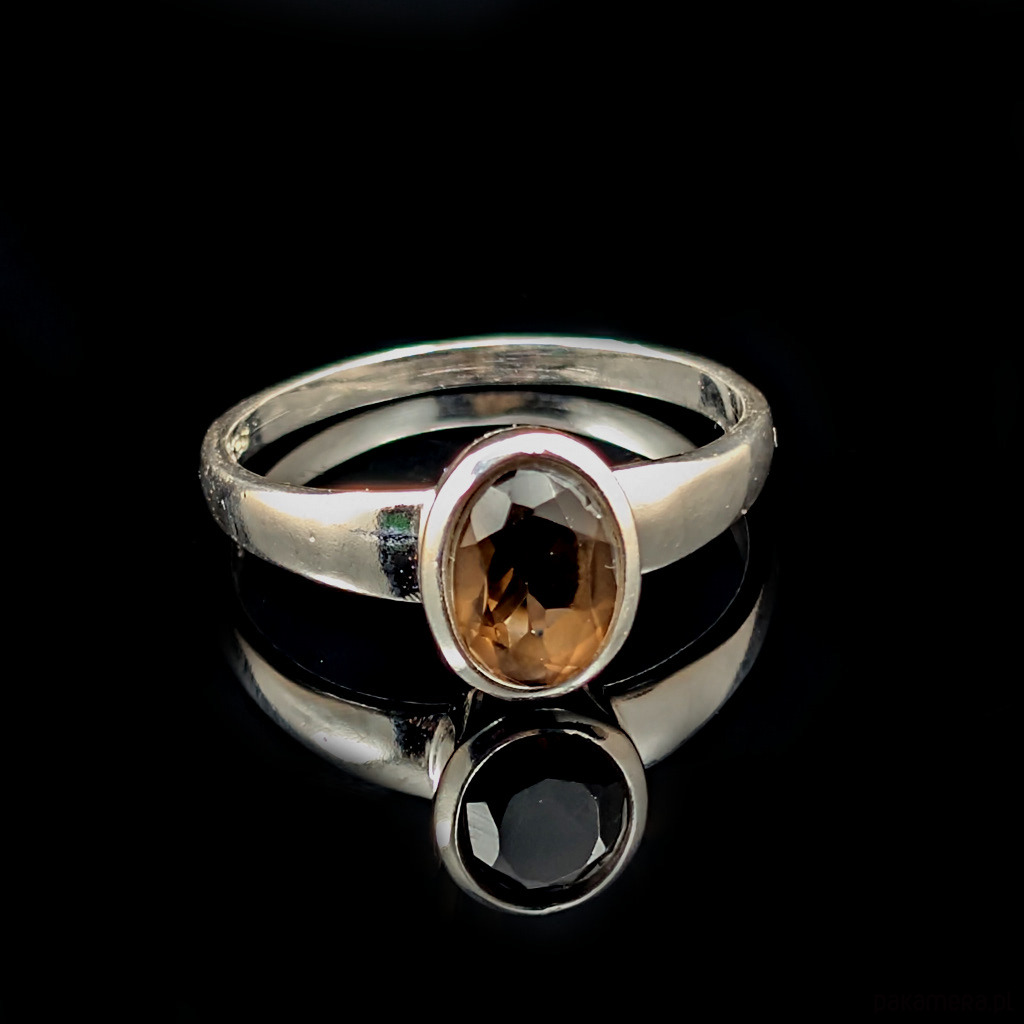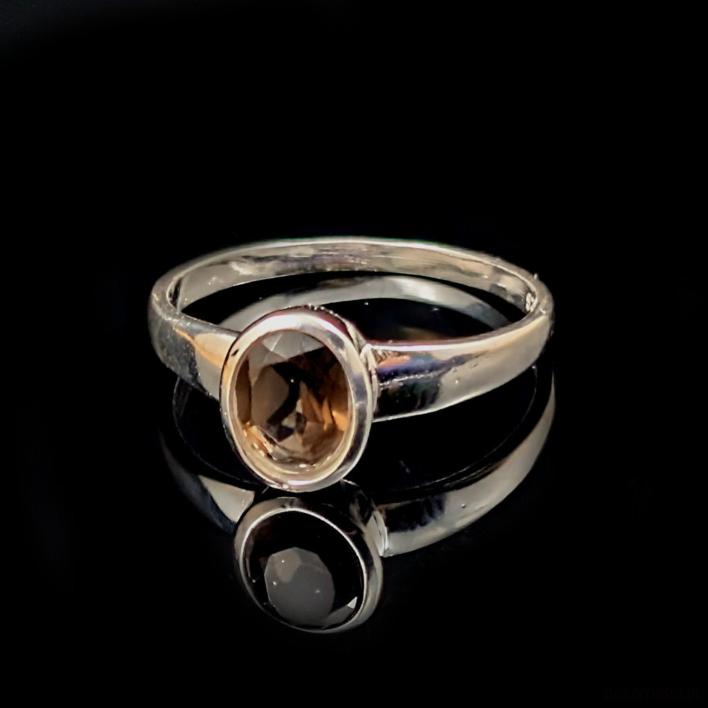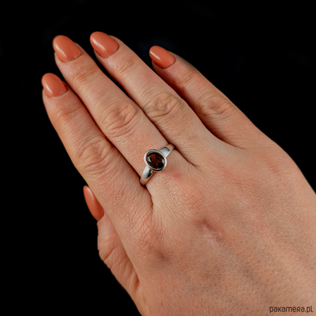 Pierścień wykonany ze srebra próby 925 oraz kwarcu dymnego w pięknym szlifie. Wymiary oprawy 10 x 7 mm, waga to 2,5 grama. Rozmiar jubilerski 20. Obrączka ma szerokość 2-3 mm. Zostanie zapakowany w ozdobne pudełeczko. Wykonany przez dostawcę kamieni.