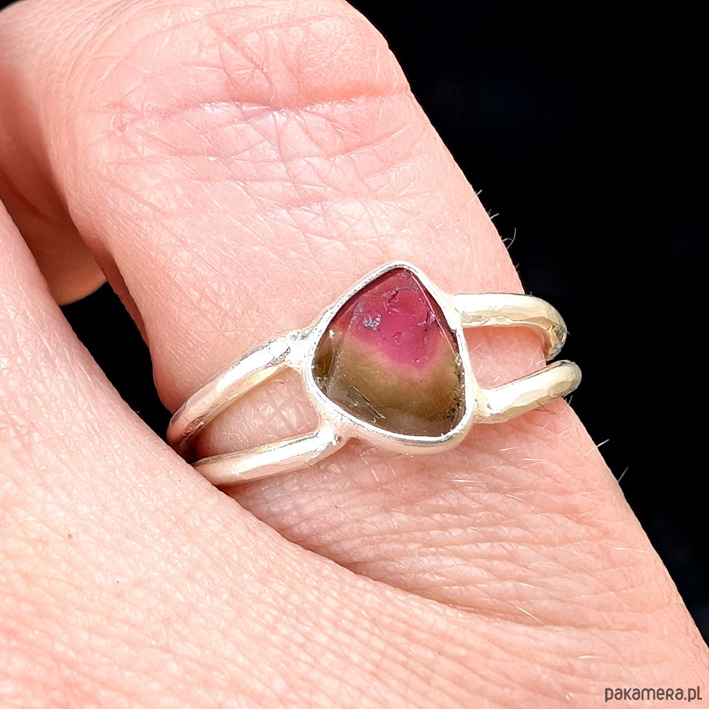 Kobiecy pierścionek wykonany ze srebra pr.9 25 oraz turmalinu arbuzowego. Wymiary oprawy kamienia 6 x 7 mm. Rozmiar jubilerski 11. Waga 1,9 g. Wykonany przez dostawcę kamieni. Pierścionek zapakowany w ozdobne pudełeczko.