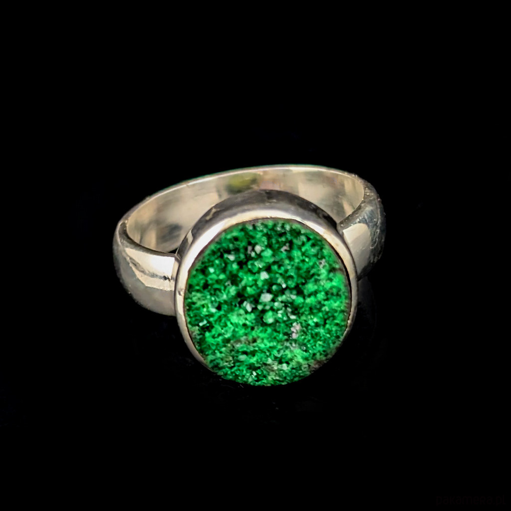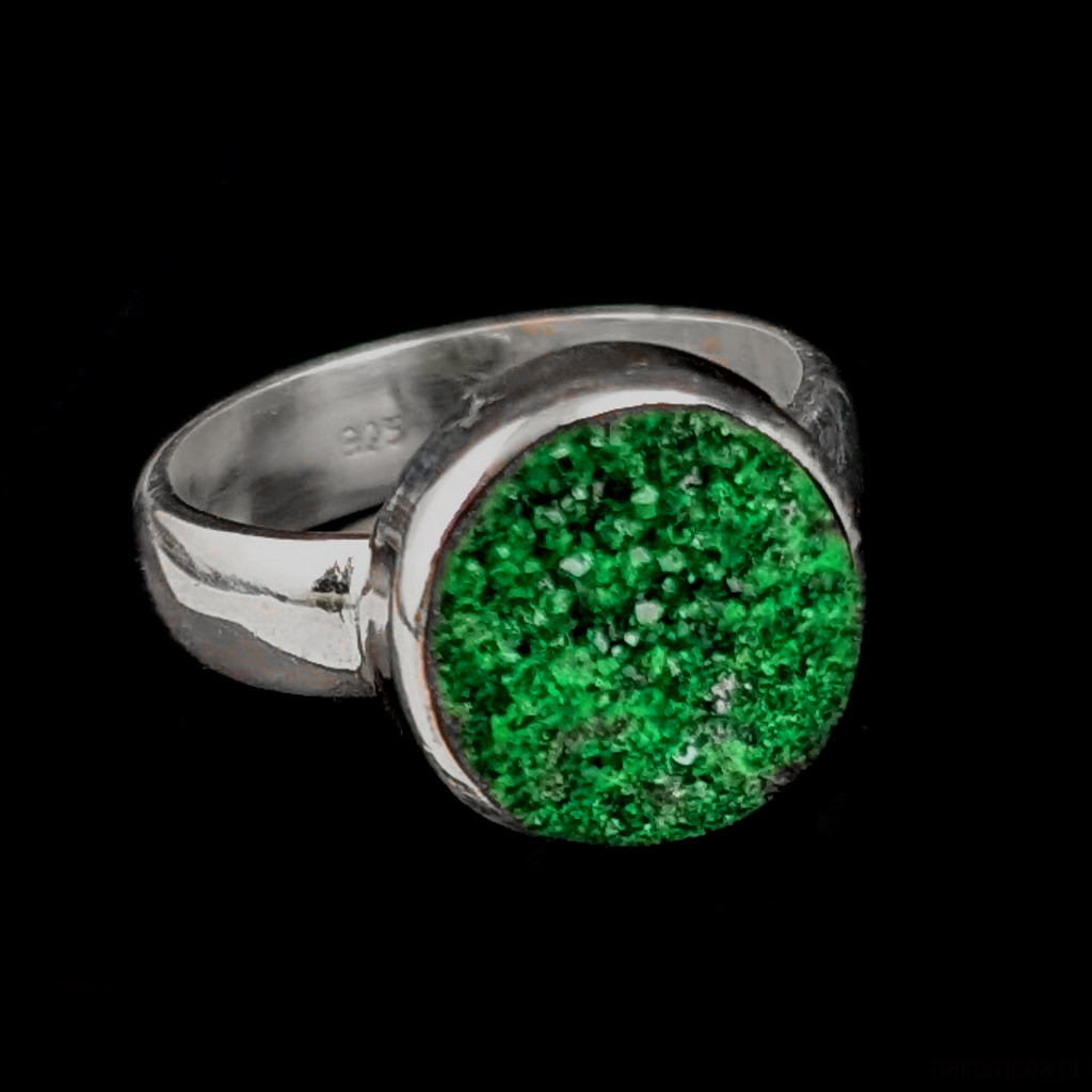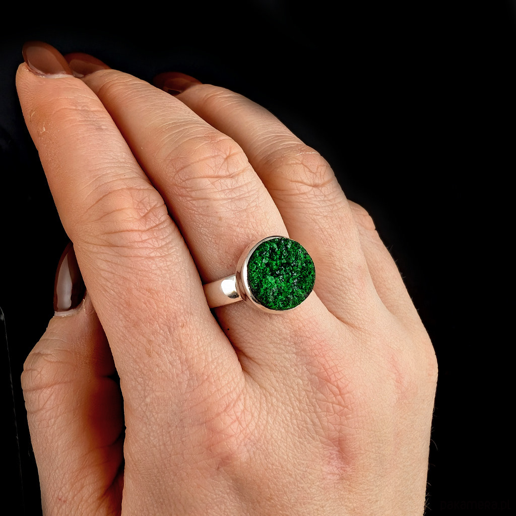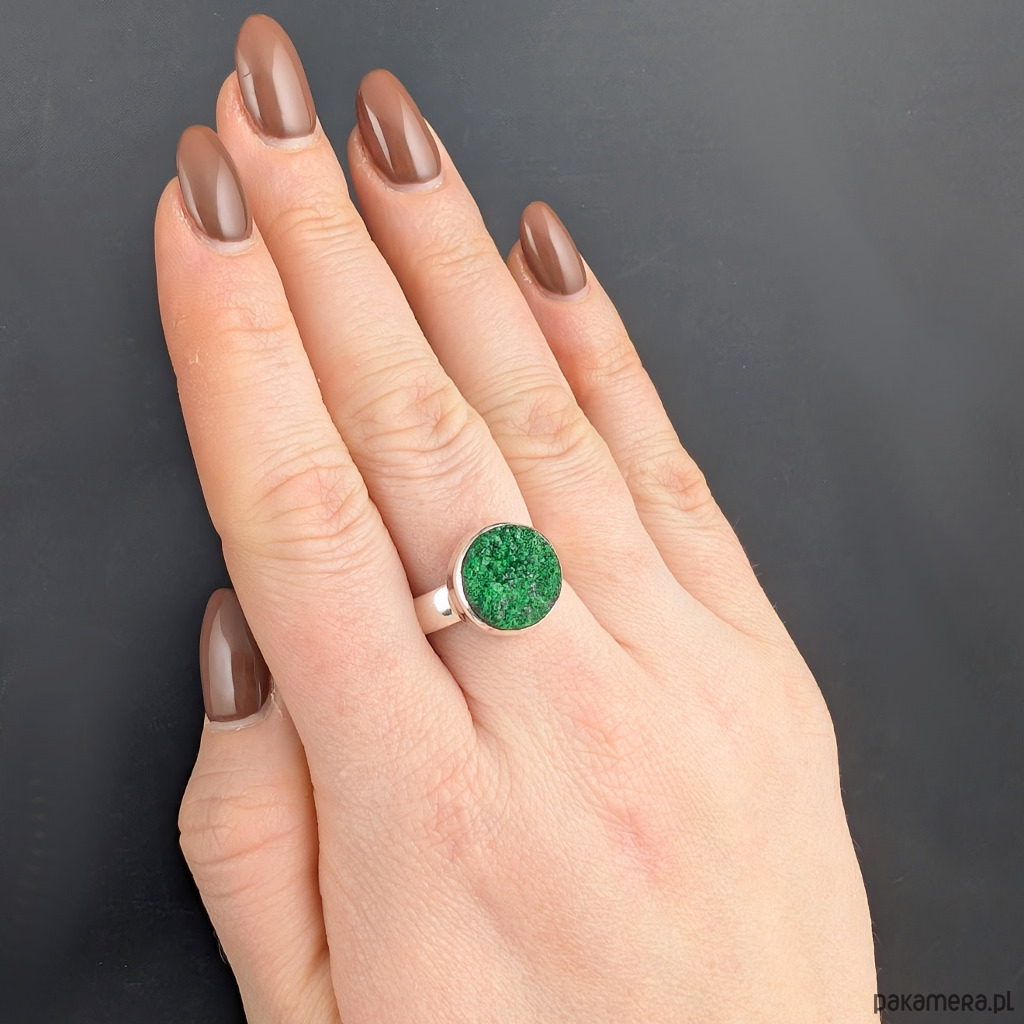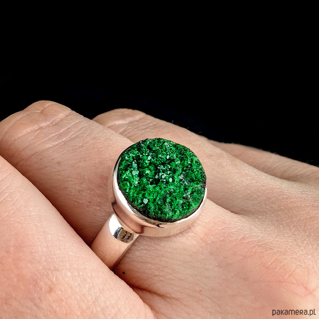 Uwarowit oprawiony w srebro próby 925. Niesamowicie zielony minerał skrzy się na powierzchni licznymi kryształami, migocze bardzo intensywnie, ciężko ukazać to na zdjęciu. Średnica 14 mm, pierścień waży7,37 grama. Rozmiar jubilerski 19, mogę powiększyć na max 24, obrączka ma 5 mm szerokości. Pierścień wykonany przez dostawcę kamieni. Wysłany zostanie w ozdobnym pudełeczku.