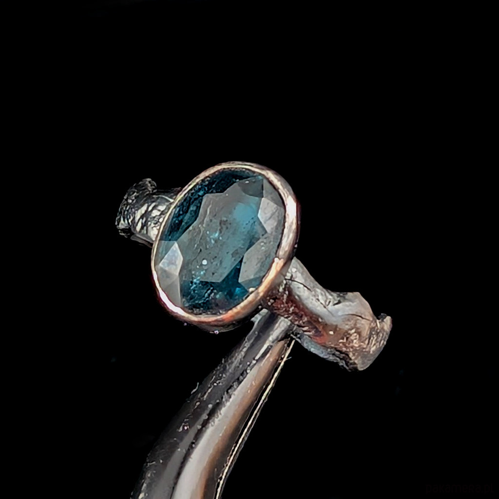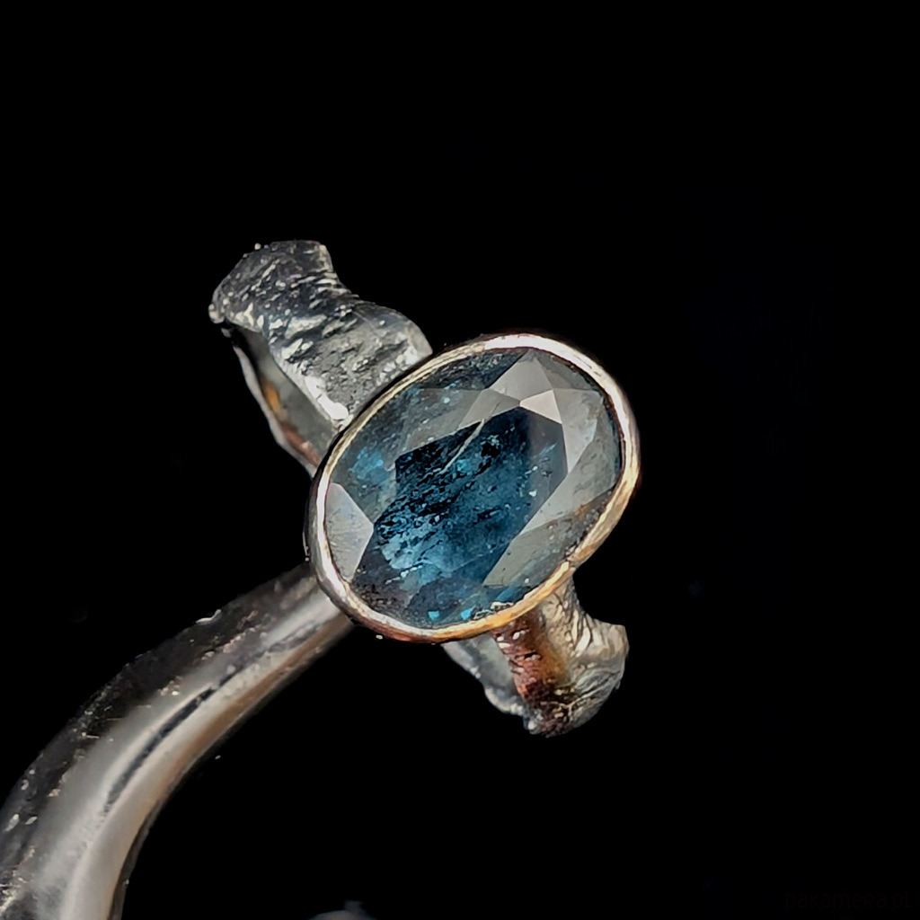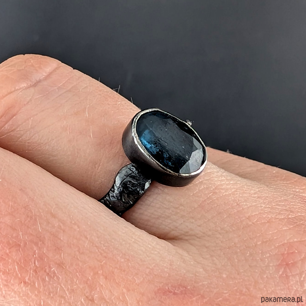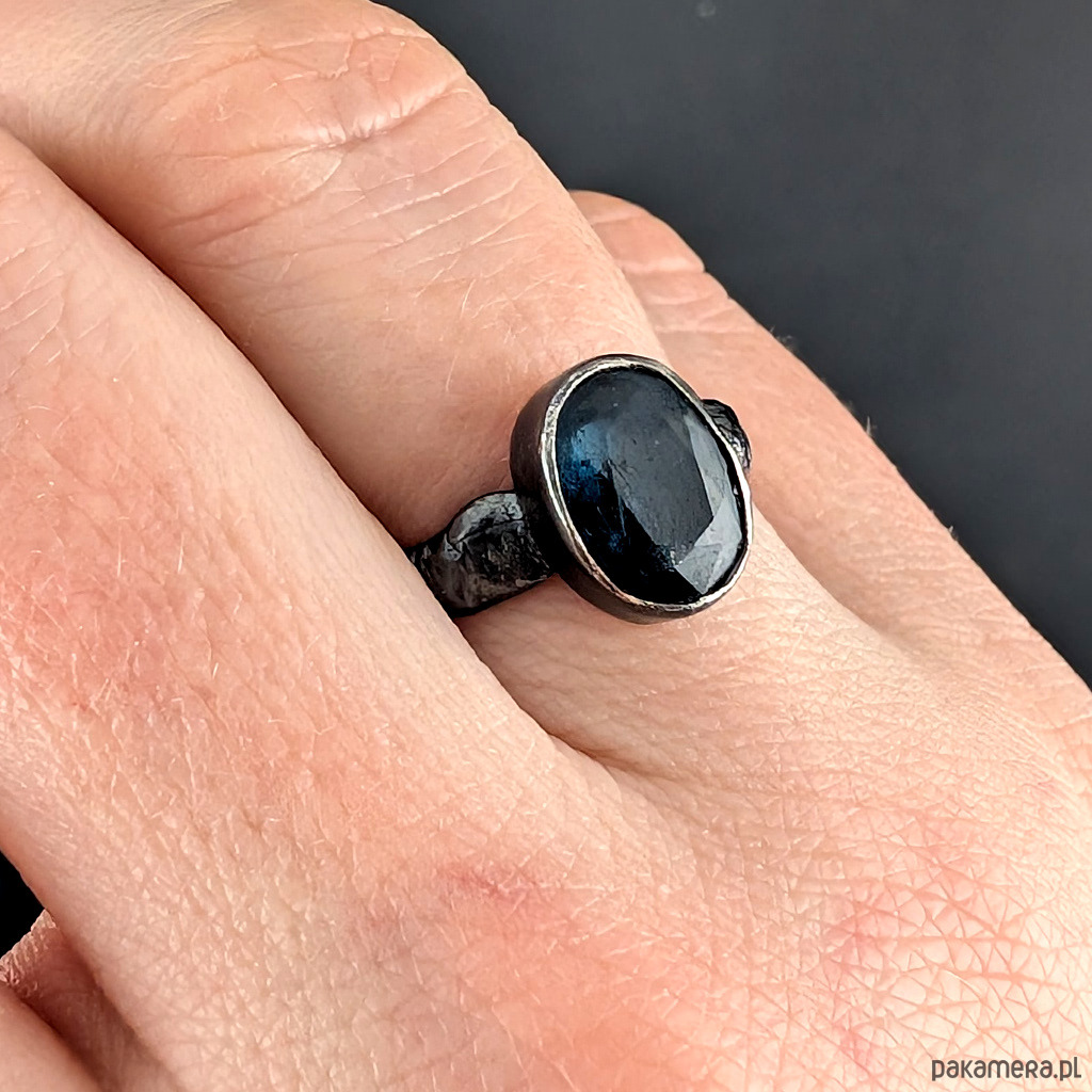 Pierścionek wykonany ze srebra próby 925, oksydowane, przetarte, fakturowane. Rozmiar pierścionka 15, mogę powiększyc na max 16. Proszę napisać, na jaki ustawić. Ozdobą pierścionka jest piękny, świetlisty kyanit. Wymiary oprawy kamienia 11 x 8 mm, szerokość obrączki 5 mm. Waga 4,4 g. Pierścień zostanie zapakowany w ozdobne pudełeczko.