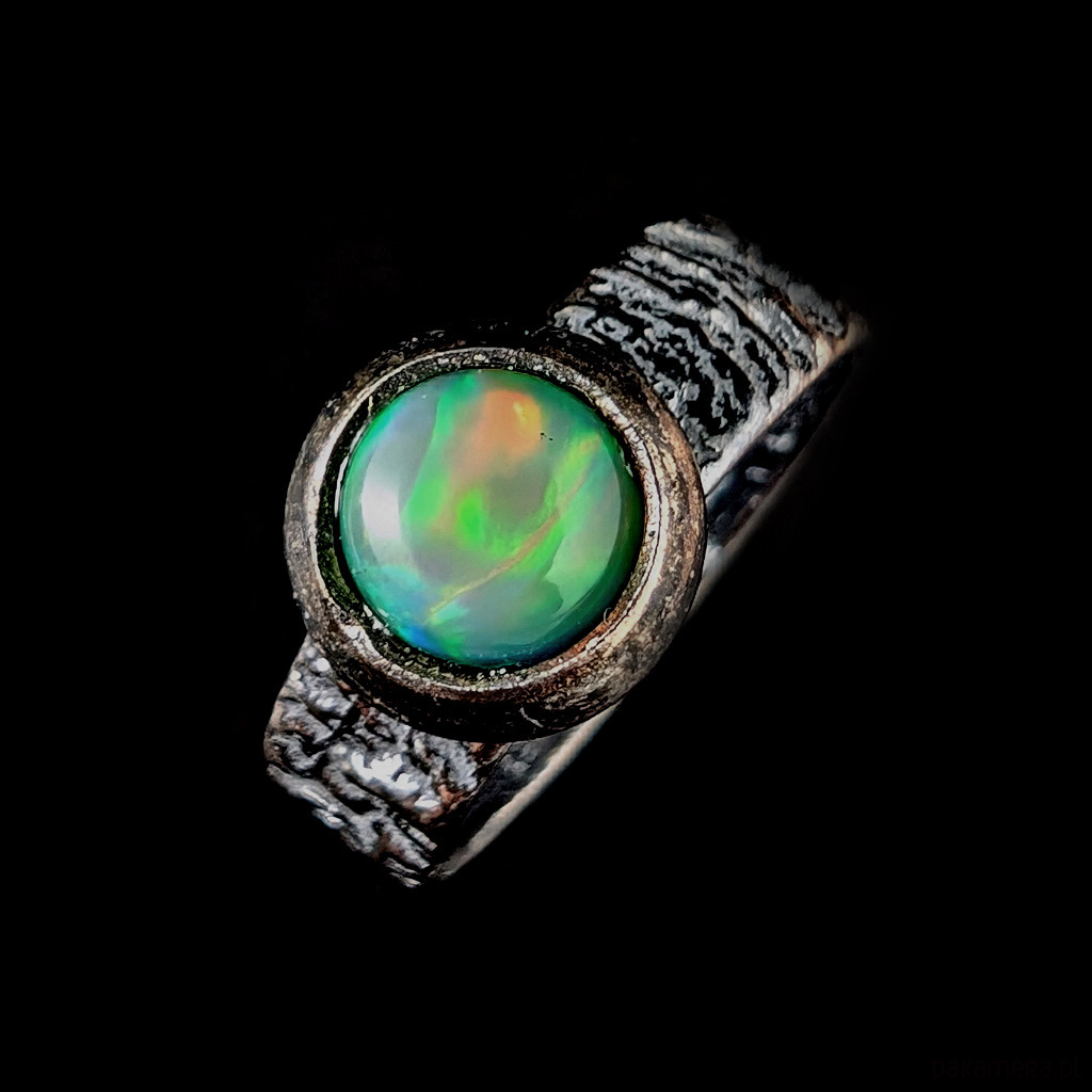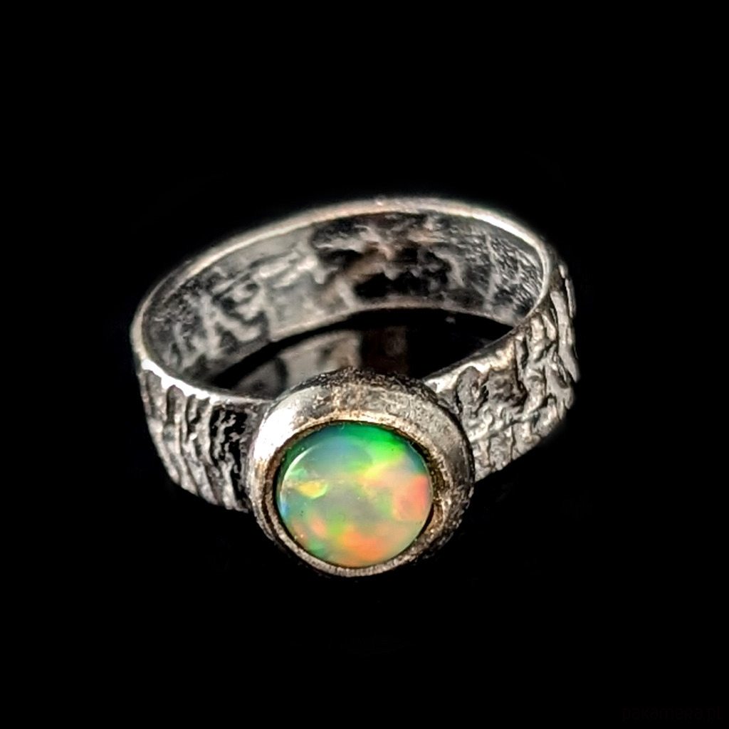 Pierścień z oprawionym w srebro pr. 925 opalem etiopskim. Średnica oprawy 9 mm. Waga 4,2 g. Obrączka w rozmiarze jubilerskim 17, bez możliwości powiekszenia, szerokość 5 mm. Pierścień zostanie wysłany w ozdobnym pudełeczku.