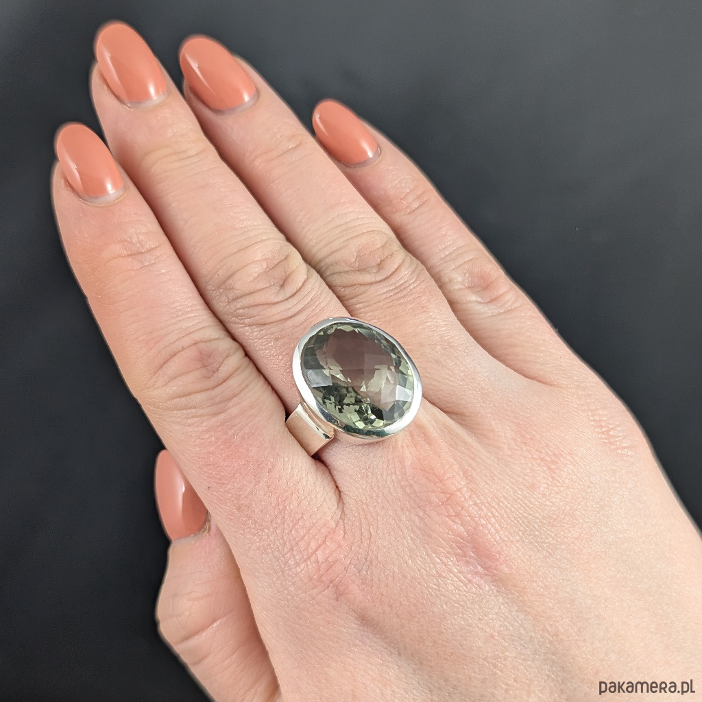 Bardzo okazały pierścień wykonany ze srebra próby 925 oraz zielonego kryształu ametystu o precyzyjnym, pieknym szlifie. Wymiary oprawy kamienia 22 x 17 mm. Rozmiar jubilerski 21. Dostępne są inne rozmiary. Waga 15 g. Wykonany przez dostawcę kamieni. Pierścień zostanie wysłany w ozdobnym pudełeczku.