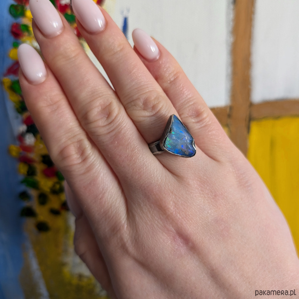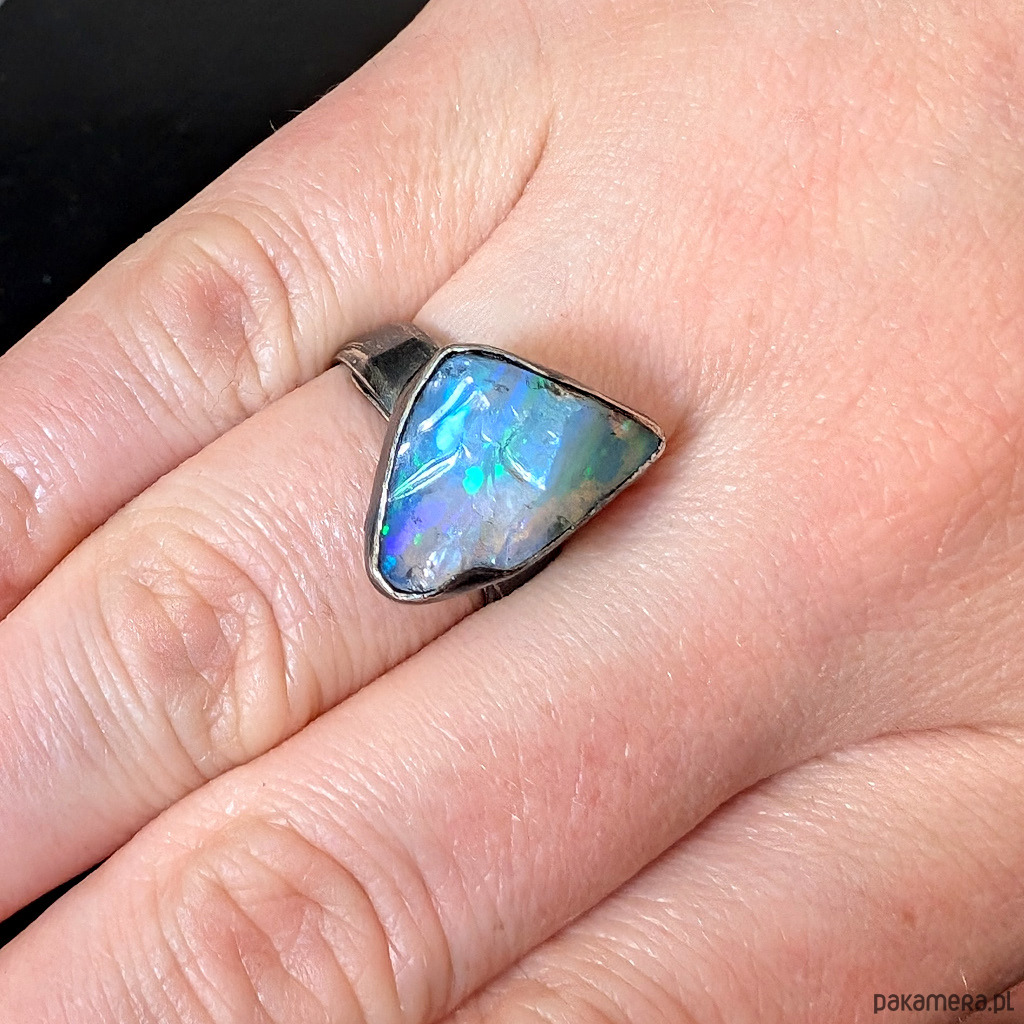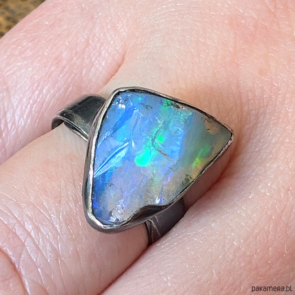 Surowy pierścień z oprawionym okazałym opalem etiopskim o niebiesko-zielonej tafli. Kamień o wspaniałej opalizacji. Srebro pr.925, oksydowane. Wymiary oprawy 20 x 13 mm. Waga 6 g. Obrączka regulowana w szerokim zakresie (10-24), proszę napisać po zakupie, to dopasuję na konkretny rozmiar. Obrączka ma 5 mm szerokości. Zapakowany w ozdobne pudełeczko.