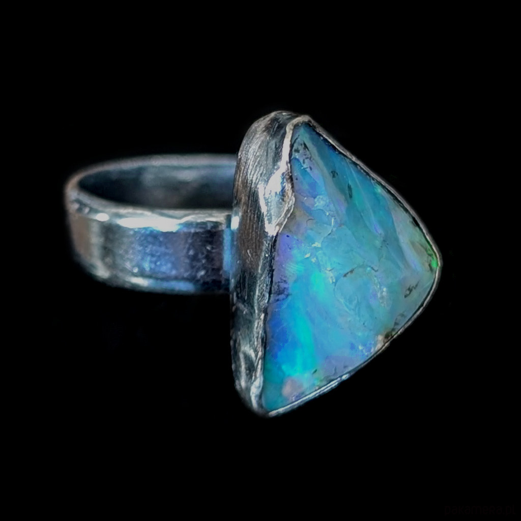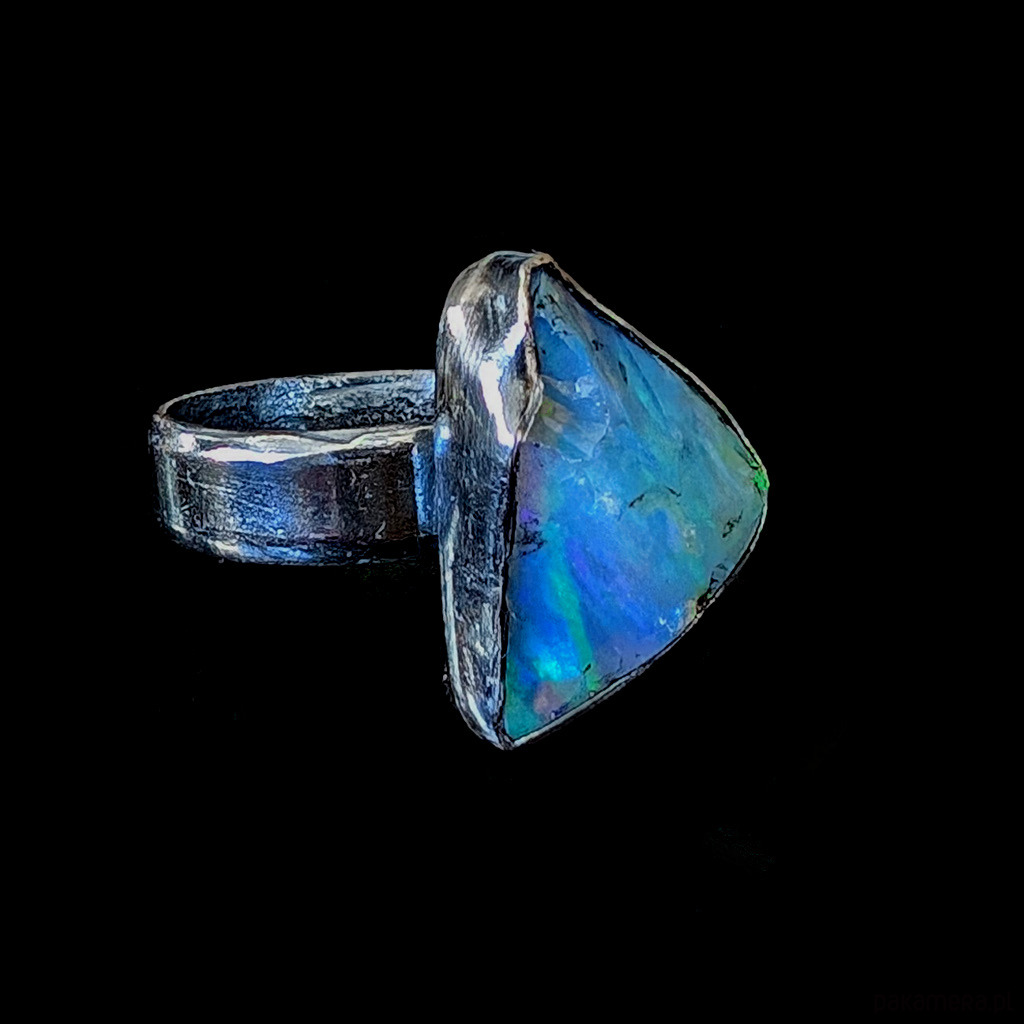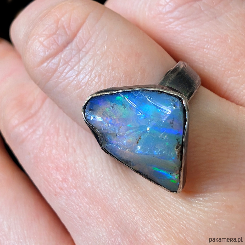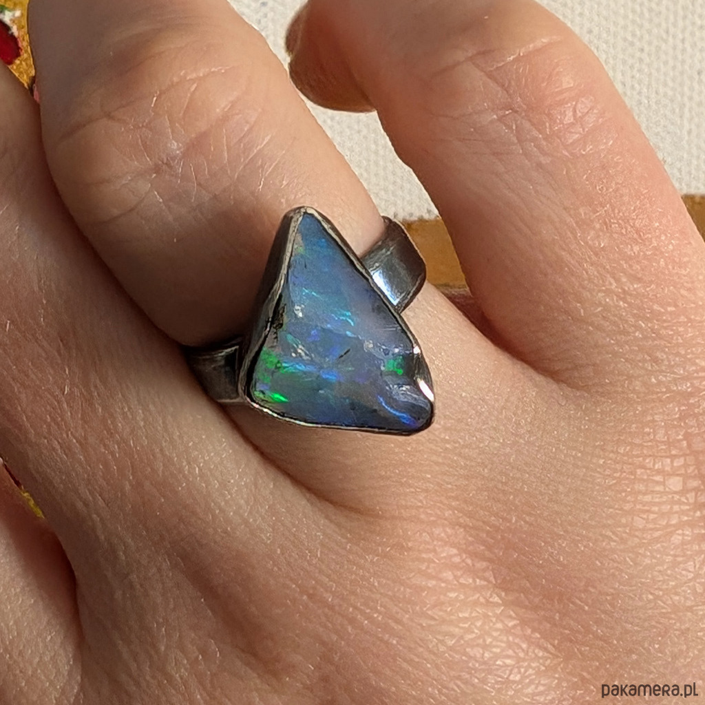 Surowy pierścień z oprawionym okazałym opalem etiopskim o niebiesko-zielonej tafli. Kamień o wspaniałej opalizacji. Srebro pr.925, oksydowane. Wymiary oprawy 20 x 13 mm. Waga 6 g. Obrączka regulowana w szerokim zakresie (10-24), proszę napisać po zakupie, to dopasuję na konkretny rozmiar. Obrączka ma 5 mm szerokości. Zapakowany w ozdobne pudełeczko.