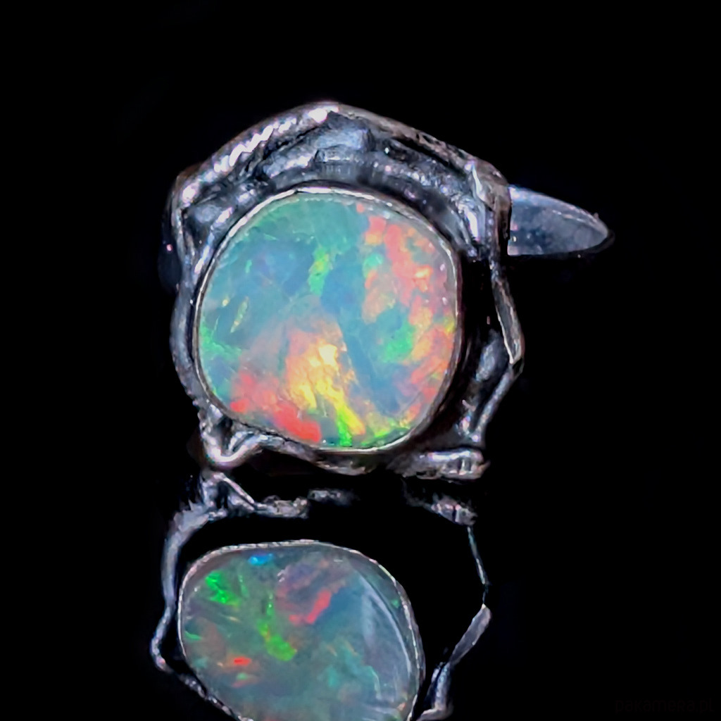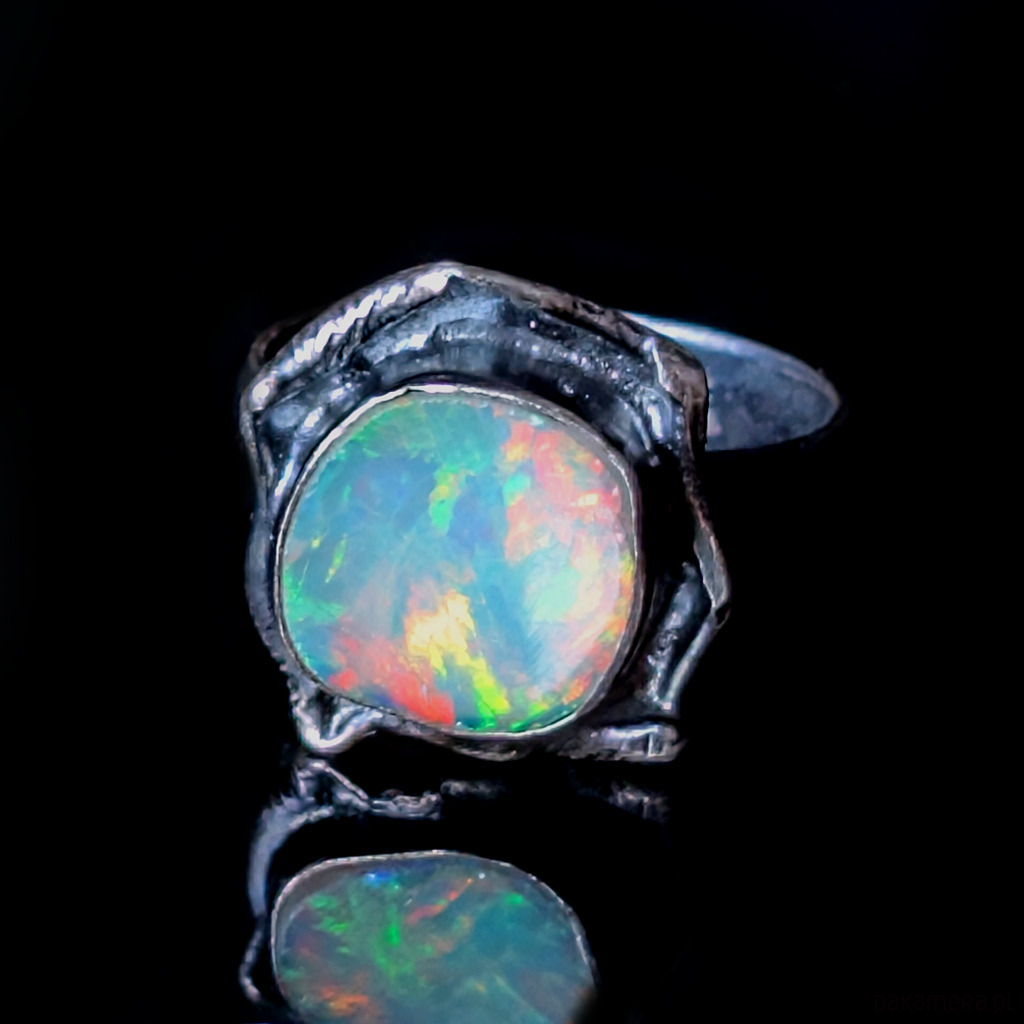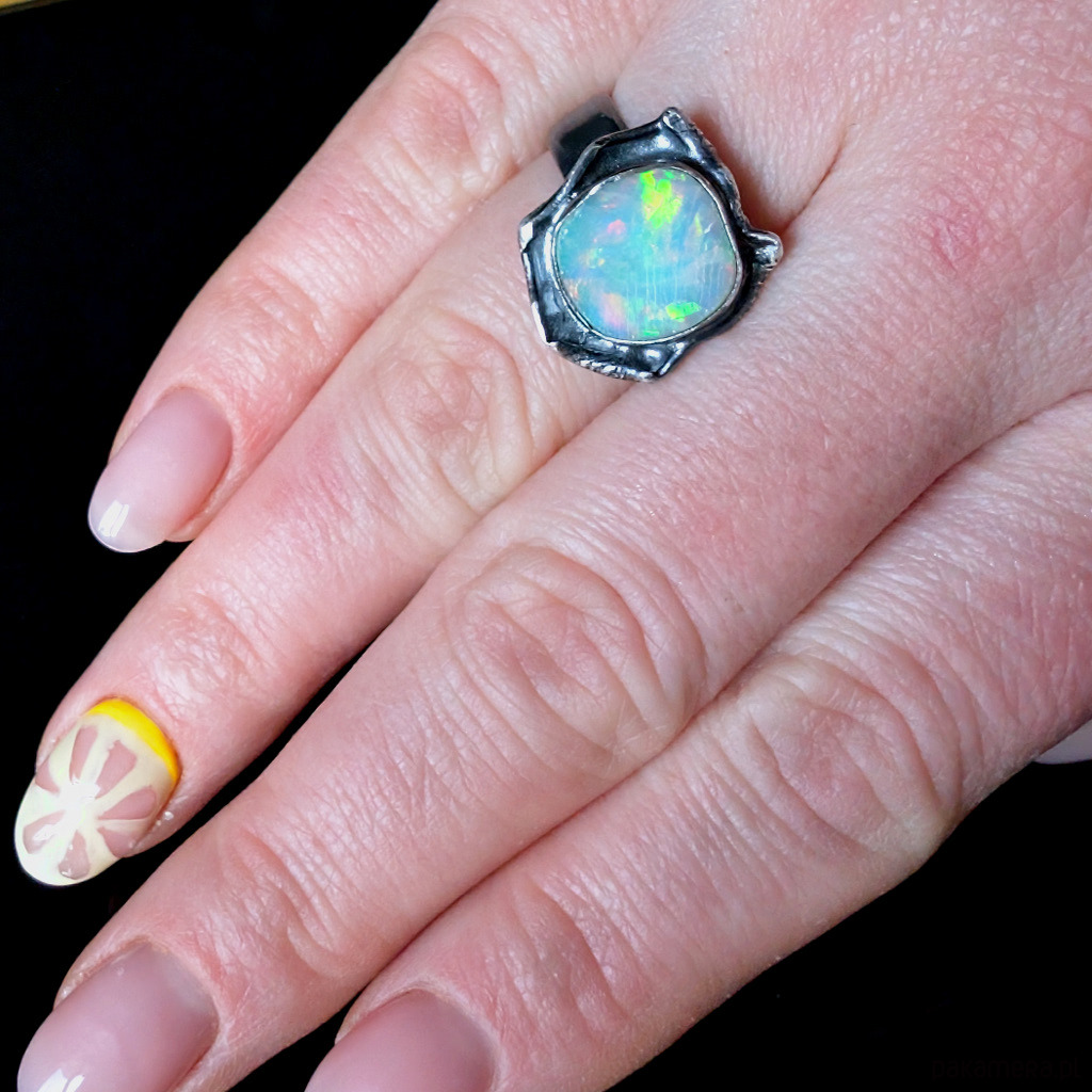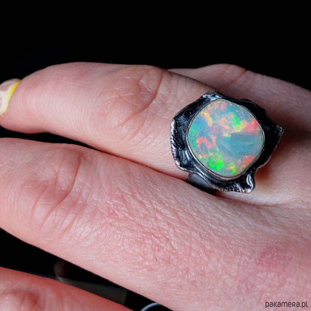 Pierścień z oprawionym okazałym, surowym opalem etiopskim . Kamień o wspaniałej opalizacji barw. Srebro pr.925, oksydowane. Wymiary oprawy 16 x 15 mm. Waga 6,16 g. Obrączka regulowana w szerokim zakresie (10-24), proszę napisać po zakupie, to dopasuję na konkretny rozmiar. Obrączka ma 5 mm szerokości. Zapakowany w ozdobne pudełeczko.