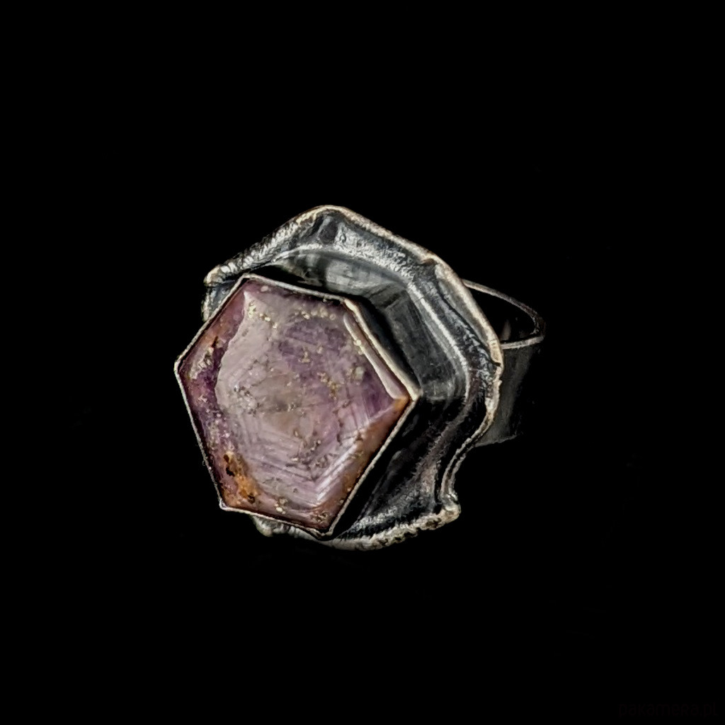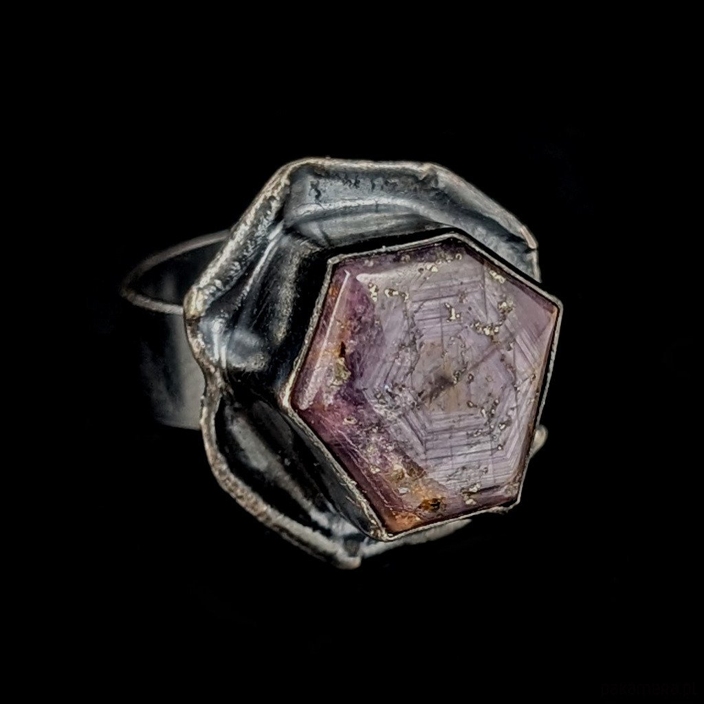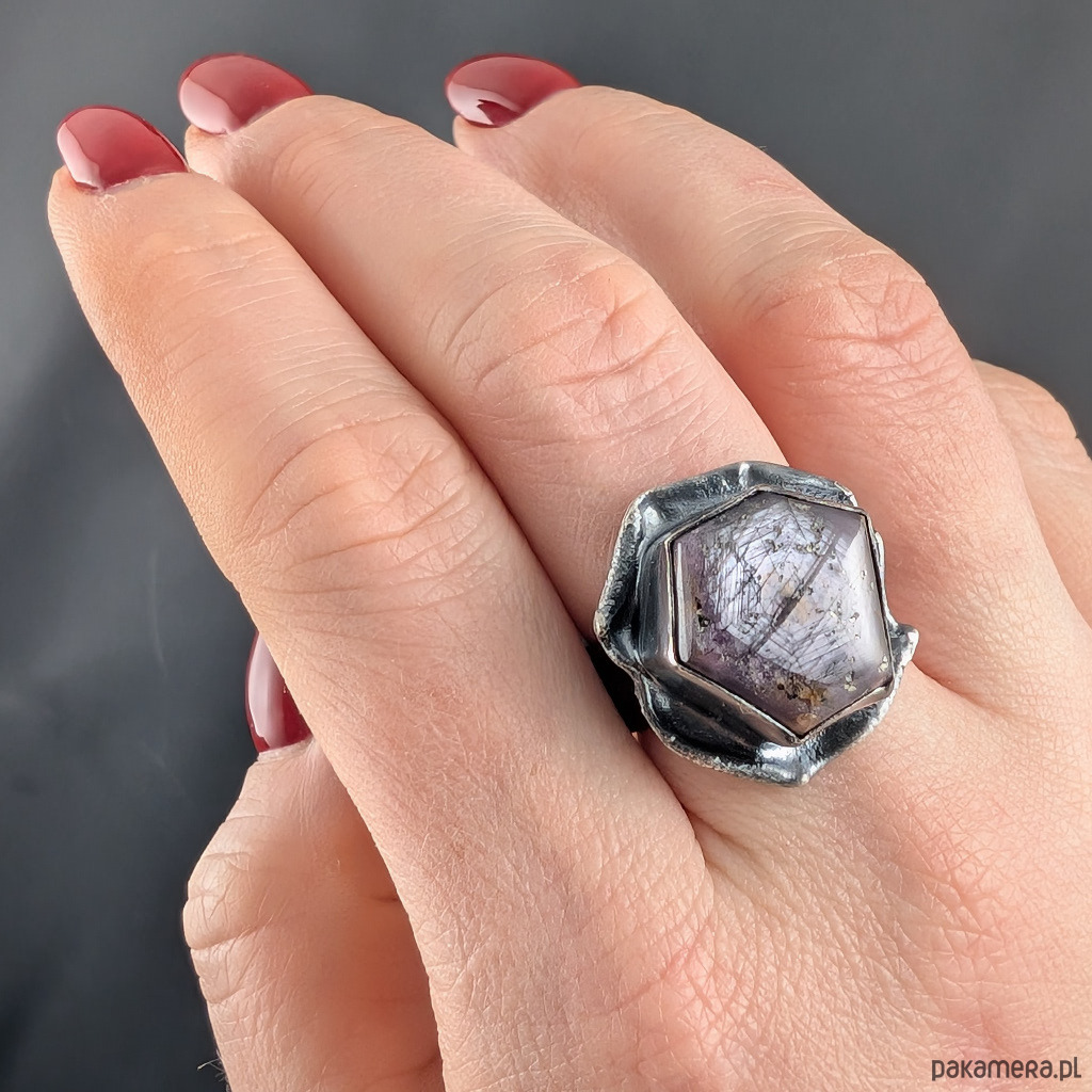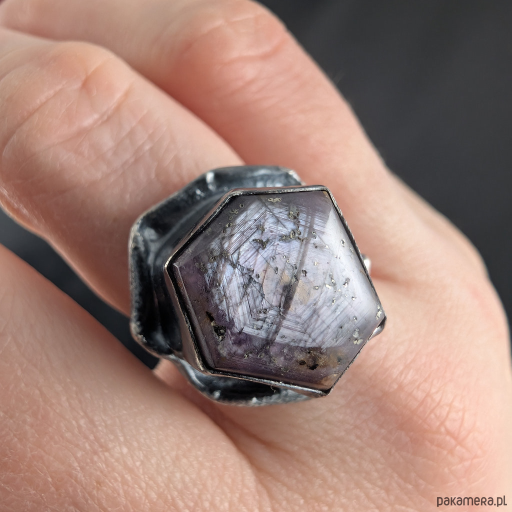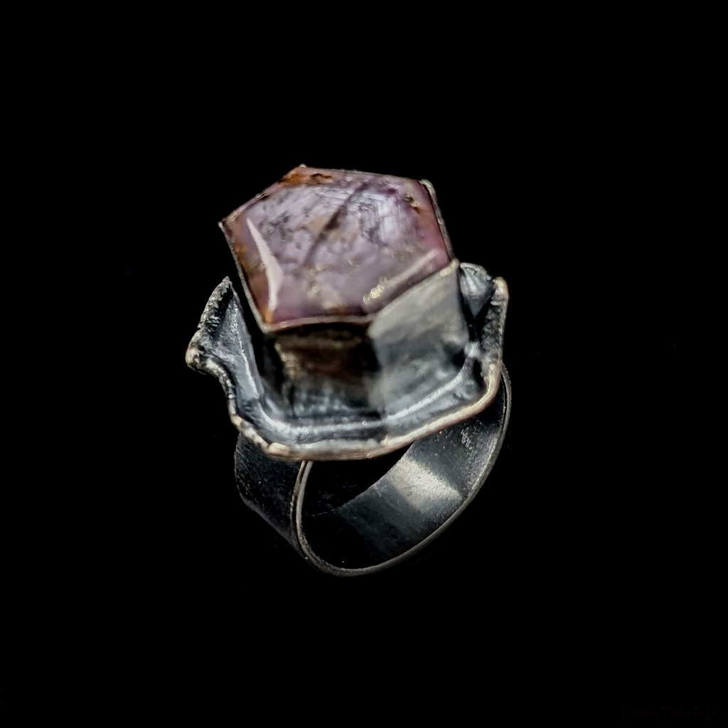 Piękny okaz surowego rubinu z iryzacją ukazującą się pod odpowiednim kątem, ciekawe zjawisko. Oprawa srebra próby 925, oksydowana. Waga 16 gramów. Wymiary całej oprawy 23 x 21 mm. Rozmiar jubilerski 17, mogę powiększyć na max 18, proszę napisać, na jaki dopasować. Obrączka ma 8 mm szerokości. Pierścień zostanie zapakowany w ozdobne pudełeczko. .