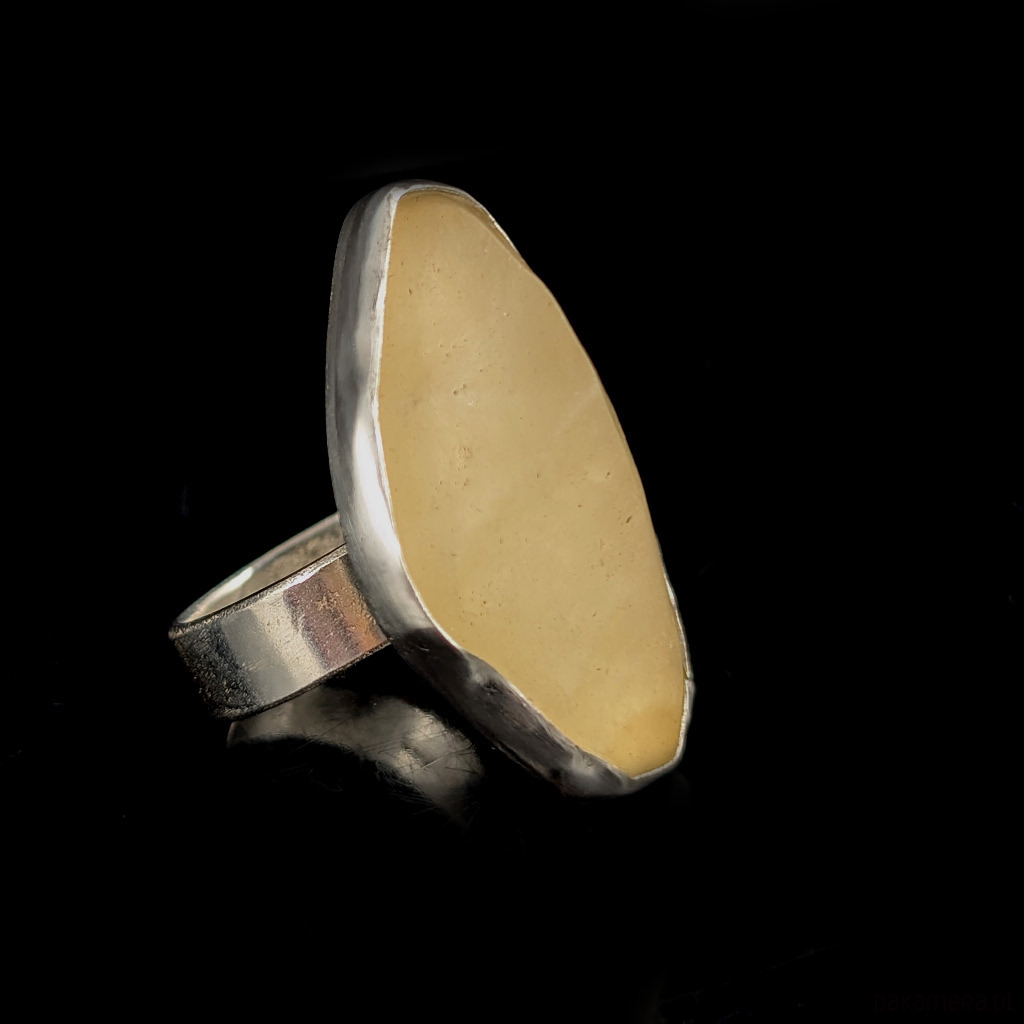 Pierścień, który zdobi piękny, surowy okaz unikalnego szkła libijskiego. Oprawa srebra próby 925. Waga 10,4 g. Wymiary całej oprawy 32 x 20mm. Rozmiar jubilerski mogę dopasować w zakresie 14-18. Pierścień zapakowany zostanie w ozdobne pudełeczko.