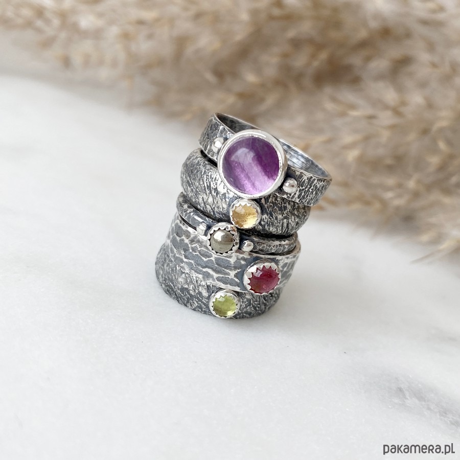 Surowy w formie pierścionek został skąpany w oksydzie oraz delikatnie wypolerowany, przez co nabrał głębi i charakteru..
