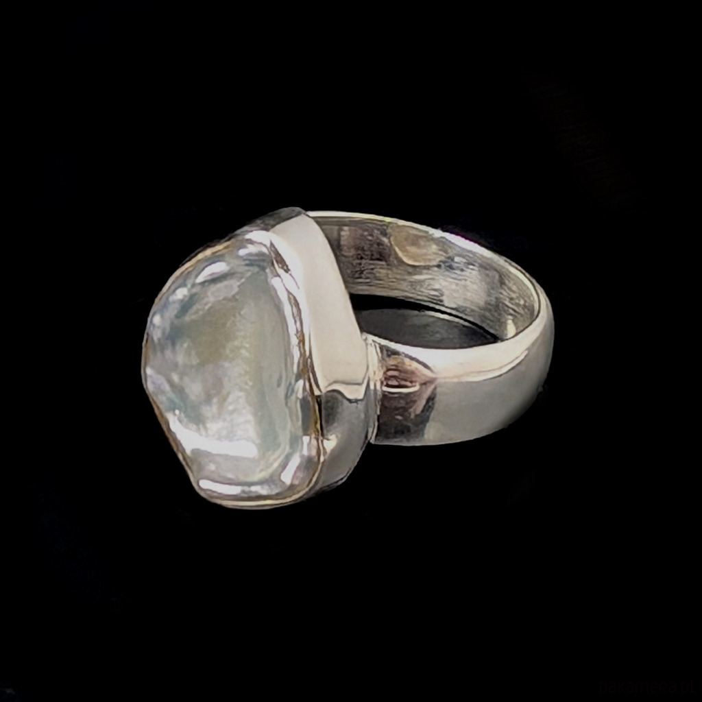 Pierścień wykonany ze srebra próby 925 z oprawioną piękną naturalną perłą. Ponadczasowa elegancja, klasyka z nutą awangardy. Wymiary 17 x 14 mm, waga pierścienia 6 g. Rozmiar jubilerski 16, mogę powiększyć na max 17. Szerokość obrączki to 6 mm. Wykonany przez dostawcę kamieni.
