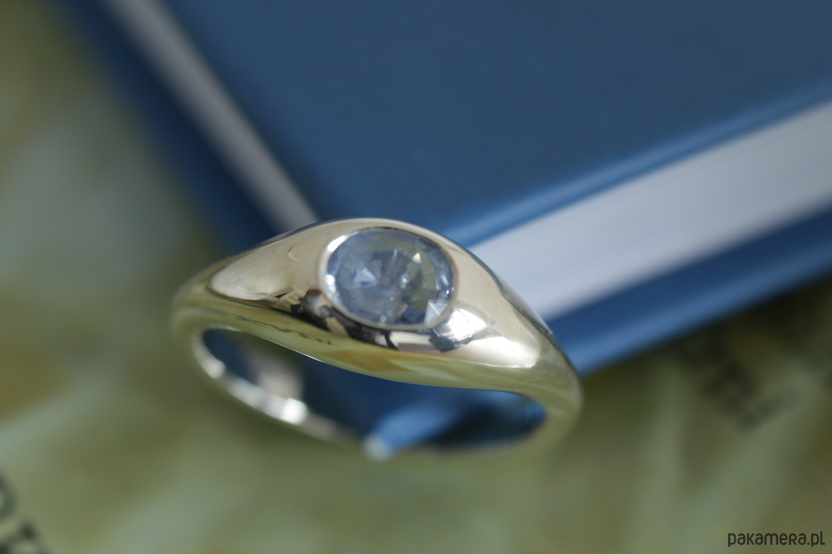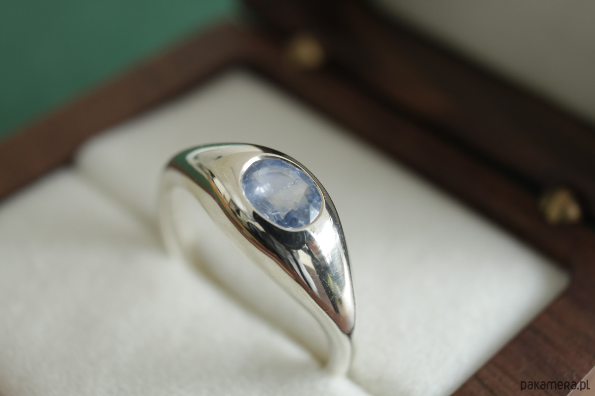Pierścionek srebrny w formie sygnetu z osadzonym poziomo błękitnym szafirem.