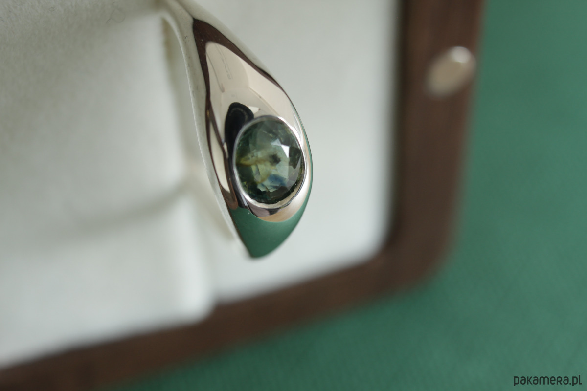 Pierścionek srebrny w formie sygnetu z osadzonym poziomo zielonym szafirem.