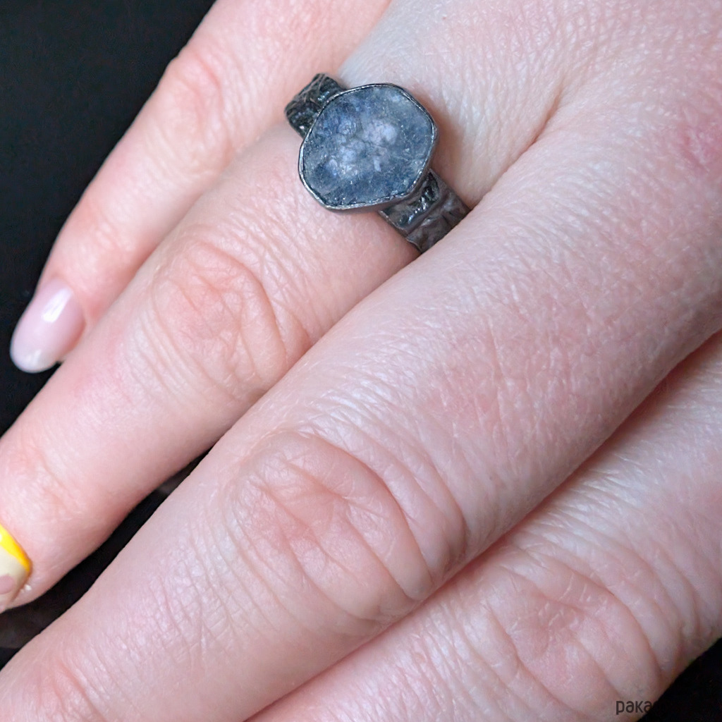 Pierścień wykonany z oksydowanego srebra próby 925 oraz szafiru o pięknej barwie. Wymiary oprawy 11 x 9 mm. Rozmiar jubilerski 14,mogę powiększyć na max 15, Waga 4,4 g. Pierścień zostanie zapakowany w eleganckie pudełeczko.