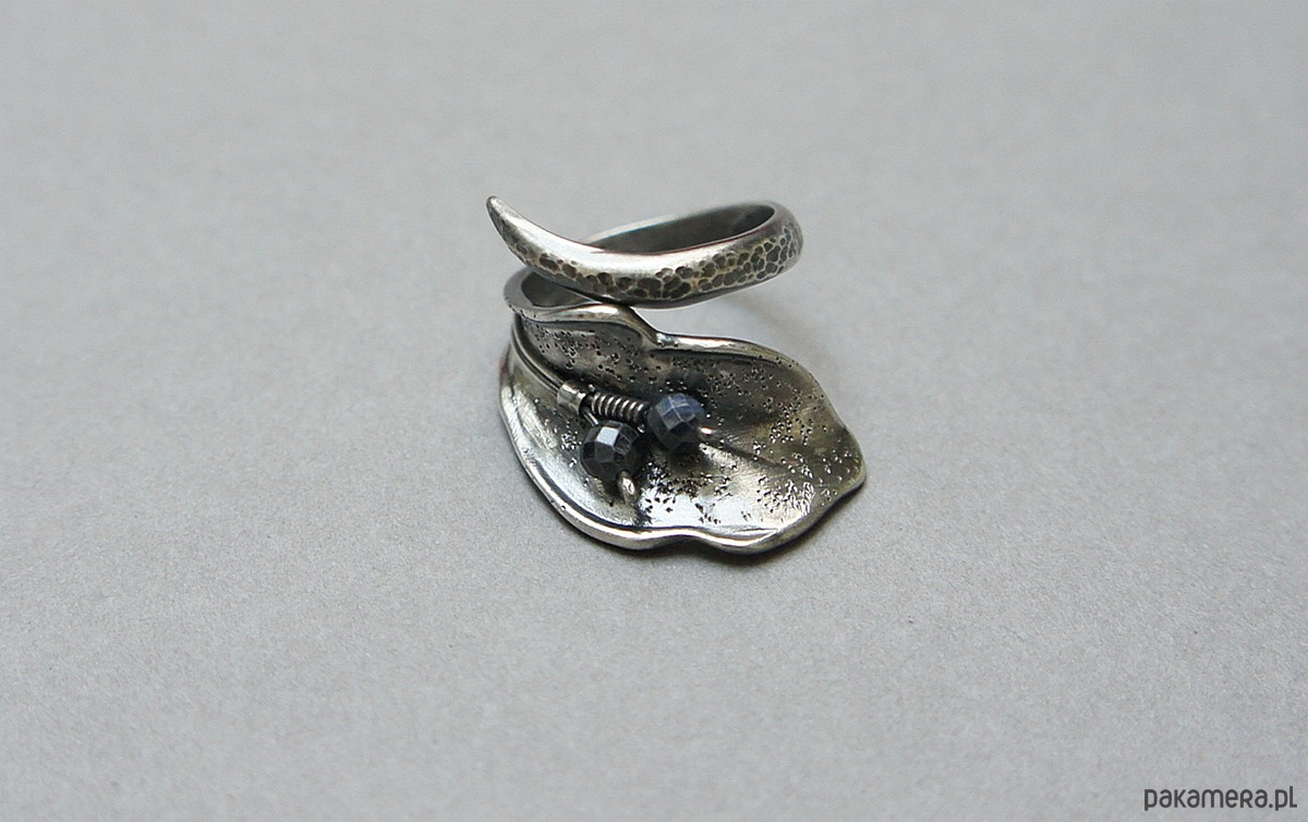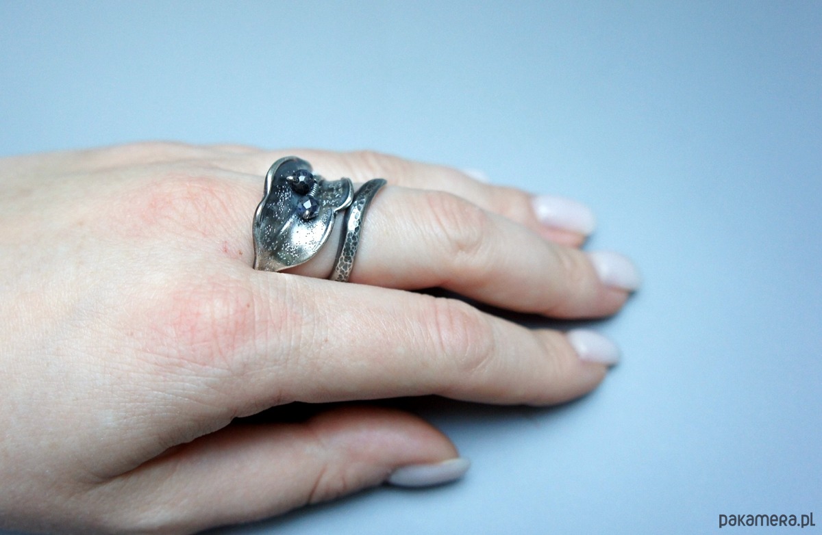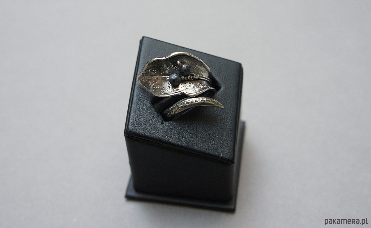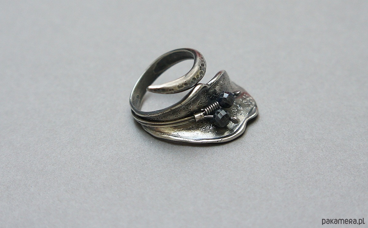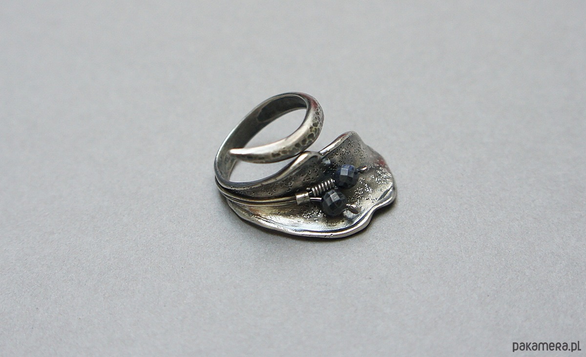 Pierścionek wykonany ze srebra [pr. 925]. w połączeniu z fasetowanymi kuleczkami szafirów [4mm]. Całość oksydowana i przetarta. Pierścionek regulowany. Biżuteria ozdobnie zapakowana.
