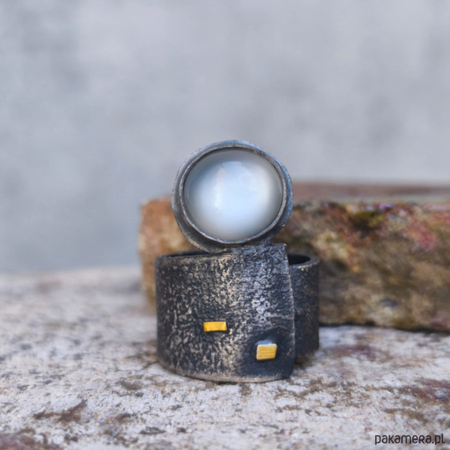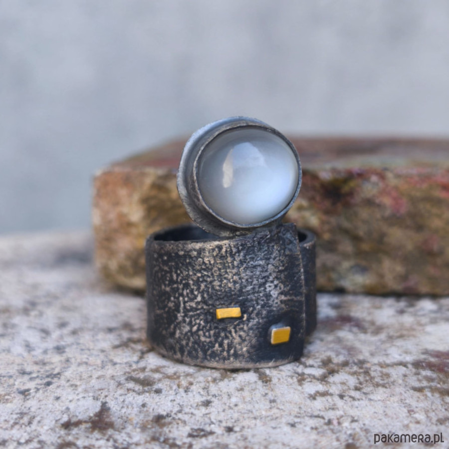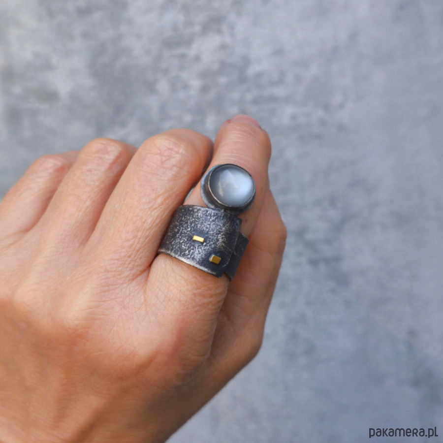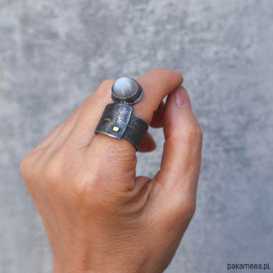 Wyrazisty, szeroki pierścień - srebro, złoto, szary kamień księżycowy.