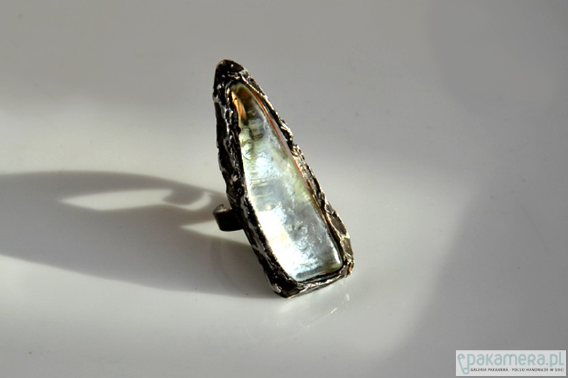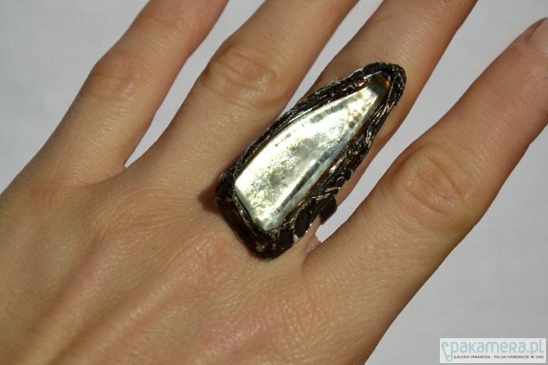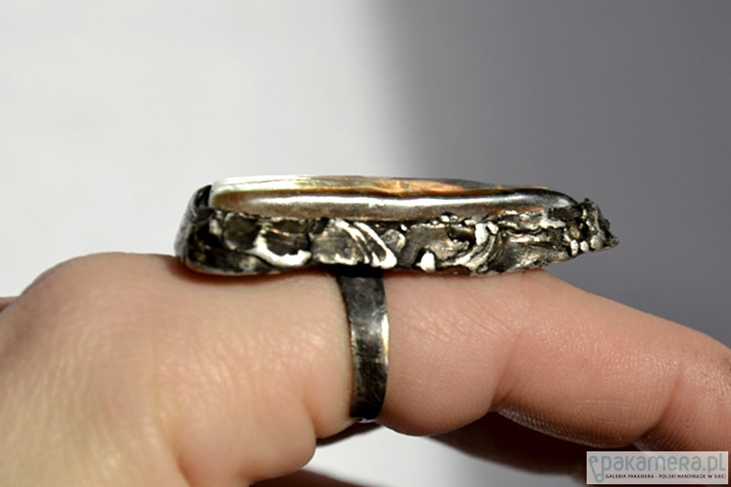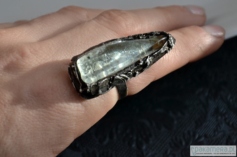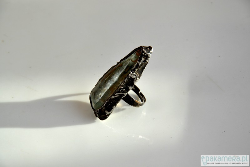 Bardzo efektowny duży pierścień ze stapianym szkłem. Wymiary szkła wraz ze stylizowaną na stare srebro oprawą to ok. 4,5 x 2 cm. Obrączka regulowana. Biżuteria wykonana ręcznie, Poszczególne sztuki mogą się minimalnie różnić.